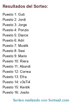 Lista de participantes: Adri, Mario, Jorge, Suplente, Jordi, Guti, Diarce, Sete, Mustik, Sesi, Riera, Vestia, Josito, Correa, Ponzio, Efra.