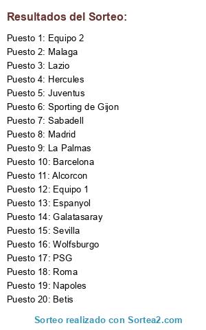 Lista de participantes: Alcorcon, Roma, Sabadell, Barcelona, Galatasaray, Hercules, Juventus, Malaga, Lazio, Betis, Espanyol, Madrid, Sevilla, Napoles, Sporting de Gijon, PSG, Wolfsburgo, La Palmas, Equipo 1, Equipo 2.