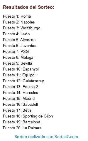 Lista de participantes: Alcorcon, Roma, Sabadell, Barcelona, Galatasaray, Hercules, Juventus, Malaga, Lazio, Betis, Espanyol, Madrid, Sevilla, Napoles, Sporting de Gijon, PSG, Wolfsburgo, La Palmas, Equipo 1, Equipo 2.