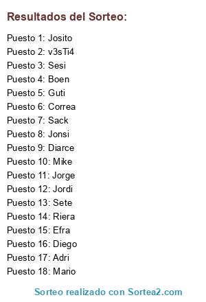 Lista de participantes: Guti, Jorge, Efra, Jonsi, Josito, Sete, Sack, Diego, Diarce, Correa, Boen, Mario, Adri, Riera, Mike, v3sTi4, Jordi, Sesi.