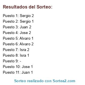 Lista de participantes: Juan 1, Juan 2, Alvaro 1, Alvaro 2, Sergio 1, Sergio 2, Jose 1, Jose 2, Isra 1, Isra 2, -.