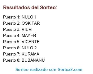 Lista de participantes: BUBANANU, KURAMA, MAYER, VICENTE, VIERI, OSKITAR, NULO 1, NULO 2.