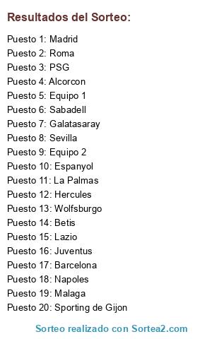 Lista de participantes: Alcorcon, Roma, Sabadell, Barcelona, Galatasaray, Hercules, Juventus, Malaga, Lazio, Betis, Espanyol, Madrid, Sevilla, Napoles, Sporting de Gijon, PSG, Wolfsburgo, La Palmas, Equipo 1, Equipo 2.