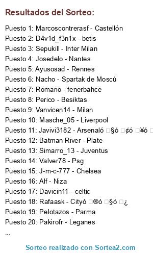 Lista de participantes: Vanvicen14 - Milan, Javivi3182 - Arsenal, Simarro_13 - Juventus, migui - Real Madrid, Rafaask - City, Sepukill - Inter Milan, Equalofficial - Fiorentina, D4v1d_f3n1x - betis, Alf - Niza, Pipo - Bayern, Javi Bross - Wolves, Pakirofr - Leganes, Valver78 - Psg, Carly - Roma, Josedelo - Nantes, Davicin11 - celtic, Batman River - Plate, Romario - fenerbahce, Marcoscontrerasf - Castellón, Ayusosad - Rennes, J-m-c-777 - Chelsea, Masche_05 - Liverpool, Perico - Besiktas, WiNG - Galatasaray, Pelotazos - Parma, Carlitoos - Barça, Nacho - Spartak de Moscú, Salva - Valencia.
