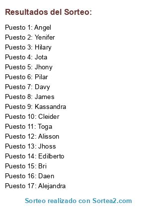Lista de participantes: Jhoss, Edilberto, Cleider, Daen, Pilar, Alejandra, Kassandra, Jhony, Angel, Alisson, Davy, Jota, Toga, Bri, James, Yenifer, Hilary.