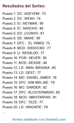 Lista de participantes: POR NEUER 90, POR KOBEL 84, DFC KLOSTERMANN 80, DFC KIM MIN JAE 79, DFC EL YAMIQ 75, DFC TEZE 77, LD HINCAPIE 78, LI REINILDO 77, LD WAN- BISSAKA 85, LD DEST 77, LI ACUÑA 78, MCO MKHITARYAN 81, MC DARDER 82, MCD KESSIE 84, MCD SISSOCKO 77, MD DANIEL JAMES 76, DC ADEYEMI 75, EI SANCHO 84, ED LOZANO 81, SD MANE 89, EI NEYMAR 89, DC WEAH 74.