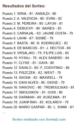 Lista de participantes: LAHM - 87 SIDIBÉ - 79, DANI ALVES - 85 DIGNE - 79, CARVAJAL - 83 JAUME COSTA - 79, AURIER - 83 BALENZIAGA - 79, JUANFRAN - 83 KOLAROV - 79, LICHTSTEINER - 83 CRISCITO - 79, FLORENZI - 82 BERTRAND - 79, COLEMAN 82 RADU - 79, PISZCZEK - 82 WENT - 79, SAGNA - 82 MAXWELL - 79, ZABALETA - 82 ELISEU - 79, CLYNE - 81 GAYA - 80, DE MARCOS - 81 J. HECTOR - 80, WALTER - 81 SCHMELZER - 80, SMOLNIKOV - 81 GISS - 80, SRNA - 81 ANSALDI - 80, DANILO - 80 F, COENTRAO - 80, HUGO MALLO - 80 D. ROSE - 80, MARIO FERNANDEZ - 80 CLICGY - 80, MARIO GASPAR - 80 L. SHAW - 81, DARMIAN - 80 KURZAWA - 81, M. PEREIRA - 80 LAYUN - 81, IVANOVIC - 80 TREMOULINAS - 81, COKE - 80 N. MONREAL - 81, A. VALENCIA - 80 EVRA - 82, BASTA - 80 R. RODRIGUEZ - 83, DEBUCHY - 80 BAINES - 83, HYSAJ - 79 ALEX SANDRO - 84, CANCELO - 79 AZPILICUETA - 84, VRSALJKO - 79 FILIPE LUIS - 85, BELLERIN - 79 JORDI ALBA - 86, MONTOYA - 79 MARCELO - 86.