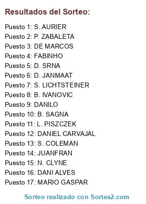 Lista de participantes: DANI ALVES, S. LICHTSTEINER, DANIEL CARVAJAL, JUANFRAN, P. ZABALETA, L. PISZCZEK, DANILO, B. IVANOVIC, D. JANMAAT, S. COLEMAN, DE MARCOS, S. AURIER, MARIO GASPAR, N. CLYNE, FABINHO, D. SRNA, B. SAGNA.