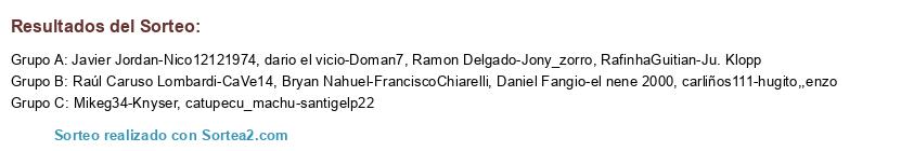 Lista de participantes: RafinhaGuitian-Ju. Klopp, carliños111-hugito,,enzo, Bryan Nahuel-FranciscoChiarelli, dario el vicio-Doman7, Daniel Fangio-el nene 2000, Javier Jordan-Nico12121974, catupecu_machu-santigelp22, Mikeg34-Knyser, Ramon Delgado-Jony_zorro, Raúl Caruso Lombardi-CaVe14.