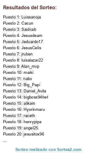 Lista de participantes: Alan_mvp, alikain, angel25, Big_Papi, bigboss94het, Cacun, Daniel_Avila, henrypipa, Hyorinmaru, Jeduardo17, JesusCelis, Jesusdeam, jesusitox96, jruben, luisalazar22, Luissanoja, maiki, Mvpbasseball, nabv, raceth, Riizalez, Saidcab.