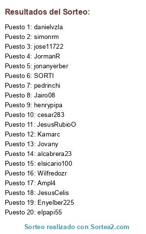Lista de participantes: alcabrera23, Ampl4, cesar283, danielvzla, elpapi55, elsicario100, Enyelber225, henrypipa, Jairo08, JesusCelis, JesusRubioO, jonanyerber, JormanR, jose11722, Jovany, Kamarc, pedrinchi, simonrm, SORTI, Wilfredozr.