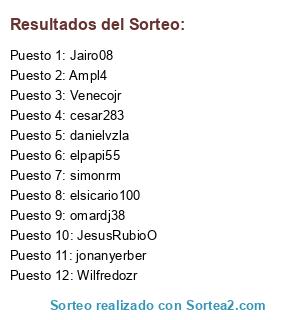 Lista de participantes: Ampl4, cesar283, danielvzla, elpapi55, elsicario100, Jairo08, JesusRubioO, jonanyerber, omardj38, simonrm, Venecojr, Wilfredozr.