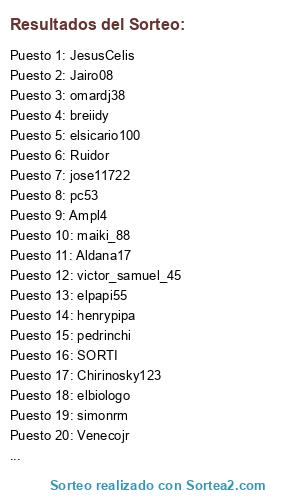 Lista de participantes: alcabrera23, Aldana17, Ampl4, Anthony500, breiidy, Chirinosky123, elbiologo, elpapi55, elsicario100, henrypipa, Jairo08, JesusCelis, jose11722, Juan123, Kamarc, maiki_88, omardj38, pc53, pedrinchi, Ruidor, simonrm, SORTI, Venecojr, victor_samuel_45.