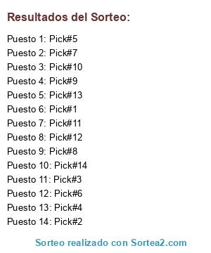 Lista de participantes: Pick#1, Pick#2, Pick#3, Pick#4, Pick#5, Pick#6, Pick#7, Pick#8, Pick#9, Pick#10, Pick#11, Pick#12, Pick#13, Pick#14.