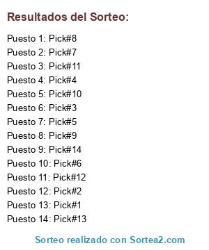 Lista de participantes: Pick#1, Pick#2, Pick#3, Pick#4, Pick#5, Pick#6, Pick#7, Pick#8, Pick#9, Pick#10, Pick#11, Pick#12, Pick#13, Pick#14.
