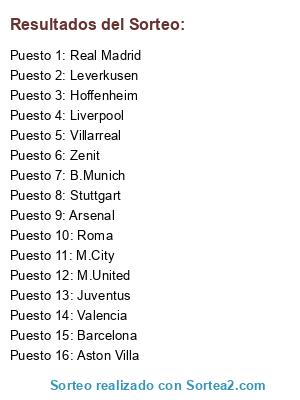 Lista de participantes: Stuttgart, Leverkusen, M.United, Liverpool, Barcelona, Aston Villa, Real Madrid, Arsenal, Juventus, Villarreal, M.City, Zenit, Roma, B.Munich, Hoffenheim, Valencia.
