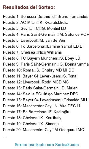 Lista de participantes: Liverpool Rodri MCD MC, Roma M. Salah, FC Bayern Munchen K. Mbappe DC EI, FC Bayern Munchen H. Kane DC, Manchester United K. De Bruyne MC MCO, Bayer 04 Leverkusen F. Wirtz MCO, Chelsea L. Martinez DC, Chelsea V. van Dijk DFC, Manchester United R. Lewandowski DC, Fc Barcelona M. ter Stegen POR, Liverpool Alisson POR, Manchester City C. Palmer MCO MD, Bayer 04 Leverkusen A. Rüdiger DFC, Manchester City M.Odegaard MC, Manchester City P. Foden ED EI MCO, Paris Saint-Germain W. Saliba DFC, FC Bayern Munchen D. Rice, Manchester City Ruben Dias DFC, Borussia Dortmund A. Bastoni DFC, Manchester City Theo Bernard François Hernandez, Paris Saint-Germain G. Donnarumma POR, Paris Saint-Germain Marquinhos DFC, Paris Saint-Germain N. Barella MC MCD, Fc Barcelona J. Musiala MCO MI MC, Manchester City Ederson POR, AC Milan M. Maignan POR, FC Bayern Munchen J. Kimmich MCD LD, Chelsea V. Osimhen, Fc Barcelona Pedri MC EI, Manchester City A. Isak, Fc Barcelona J. Kounde LD DFC, Fc Barcelona F. de Jong MC MCD, Liverpool A. Mac Allister MC MCD, Liverpool T. Alexander-Arnold LD, Manchester City Bernardo Silva MC ED, Borussia Dortmund G. Kobel POR, Borussia Dortmund L. Modric MC MCO MCD, Borussia Dortmund Bruno Fernandes MCO EI MC, Manchester City Heung-Min Son, Bayer 04 Leverkusen Grimaldo MI LI, AC Milan P. Dybala MCO DC, Sevilla FC K. Benzema, Paris Saint-Germain O. Dembele ED MCO, Chelsea Nico Williams, Fc Barcelona Raphinha ED EI MD, AC Milan K. Kvaratskhelia, AC Milan Vitinha MC MCD, Fc Barcelona R. Araujo DFC LD, Chelsea M. Caicedo MCD, Roma L. Openda, Paris Saint-Germain A. Hakimi LD, Borussia Dortmund N. Schlotterbeck DFC, Liverpool Dani Olmo, Bayer 04 Leverkusen Diogo Jota DC EI, Liverpool L. Diaz MI EI, Liverpool Rafael Leao EI MI DC, Chelsea G. Mamardashvili, FC Bayern Munchen Palhinha MCD MC, AC Milan Cristiano Ronaldo, Borussia Dortmund N. Kanté, Borussia Dortmund R. Mahrez, FC Bayern Munchen M. Neuer POR, Bayer 04 Leverkusen S. Tonali, FC Bayern Munchen M. Olise MD ED, Manchester City J. Gvardiol LI DFC, FC Bayern Munchen L. Sane MD MI ED, Bayer 04 Leverkusen E. Palacios MC MCD, Liverpool I. Konate DFC, AC Milan C. Pulisic ED MD EI, Paris Saint-Germain A. Lookman, Paris Saint-Germain M. Thuram DC, Manchester City M. Akanji DFC, Manchester City N. Ake DFC LI, AC Milan S. Guirassy DC, Paris Saint-Germain J. Brandt MCO MD MC, Manchester City J. Stones DFC MCD LD, Manchester United A. Onana POR, Manchester City İ. Gündoğan MC MCD, Roma M. Hummels DFC, Liverpool F. Acerbi DFC, Sevilla FC Iago Aspas, FC BARCELONA D. Kulusevski, Chelsea X. Simons, Borussia Dortmund Pedro Gonçalves, Fc Barcelona Lamine Yamal ED EI, Roma C. Nkunku MCO DC, Paris Saint-Germain Nuno Mendes LI, Liverpool C. Gakpo MI EI DC, Bayer 04 Leverkusen Pedro Porro, Fc Barcelona B. Kamara MCD MC, FC Bayern Munchen A. Davies LI MI, Manchester United M. de Ligt DFC, FC BARCELONA Marc Cucurella LI, AC Milan A. Christensen DFC MCD, Bayer 04 Leverkusen T. Koopmeiners MC MCO, FC Bayern Munchen D. Upamecano DFC, Manchester United L. Martinez DFC, Bayer 04 Leverkusen Aleix Garcia MC MCD, FC Bayern Munchen K. Laimer LD MCD MC, Manchester City M. Kovačic MC MCD, FC Bayern Munchen Kim Min Jae DFC, Manchester United L. Torreira, FC Bayern Munchen F. Chiesa MD MI DC, Chelsea K. Koulibaly, Bayer 04 Leverkusen M. Sabitzer MC MCO MCD, Liverpool A. Robertson LI, Borussia Dortmund G. Di Lorenzo LD DFC, Roma G. Mancini DFC, Bayer 04 Leverkusen R. Andrich MCD MC DFC, Borussia Dortmund T. Partey MCD MC LD, Bayer 04 Leverkusen L. Hradecký POR, Bayer 04 Leverkusen A. Gordon, Liverpool M. van de Ven, Borussia Dortmund Y. En-Nesyri, Manchester City M. Zaccagni, Fc Barcelona Savinho EI ED, Paris Saint-Germain B. Barcola EI ED, Fc Barcelona Balde LI LD MI, AC Milan Brahim MCO ED EI, Chelsea E. Fernandez MC MCD, Fc Barcelona J. David, Liverpool R. Gravenberch MCD MC, Borussia Dortmund D. Udogie, Manchester United D. Nuñez DC, Chelsea R. James LD, Manchester United Diogo Dalot LI LD, AC Milan F. Tomori DFC, Sevilla FC L. Pellegrini MCO MC, Bayer 04 Leverkusen E. Tapsoba DFC, AC Milan J. Grealish EI MI, Manchester City K. Walker LD, Roma S. Gnabry MD MI DC, FC Bayern Munchen L. Goretzka MC MCD, Borussia Dortmund D. Zapata, Sevilla FC Iñigo Martinez DFC, Sevilla FC K. Mitoma, AC Milan A. Robinson, Liverpool B. Mbeumo, Paris Saint-Germain Joao Neves MC MCD, Sevilla FC D. Frattesi MC MCO, Fc Barcelona F. Kadıoğlu, Paris Saint-Germain R. Kolo Muani DC, Liverpool D. Szoboszlai MCO MC, Chelsea Joao Felix MCO MI DC, Manchester United A. Saint-Maximin, Sevilla FC R. Loftus-Cheek MC MCO, AC Milan Y. Fofana MCD MC, Manchester United N. Mazraoui LD LI, Manchester United Casemiro MCD MC, Borussia Dortmund N. Süle DFC LD, Chelsea B. Henrichs, FC BARCELONA Jorginho MCD MC, Manchester City S. Ortega POR, Paris Saint-Germain D. Malen, Roma F. Kessié, Manchester City W. Zaïre-Emery MC MCD, Roma J. Doku EI ED, Chelsea M. Gusto LD, Paris Saint-Germain W. Pacho DFC, Liverpool C. Jones MC MCO MCD, Roma J. Timber LD LI DFC, Borussia Dortmund F. Nmecha MCD MC, AC Milan S. Chukwueze MD ED, Manchester United L. Shaw LI DFC, Sevilla FC Suso MD MCO MC, Sevilla FC J. Gomez DFC LD LI, Bayer 04 Leverkusen J. Hofmann MCO DC, Roma É. Mendy, Sevilla FC Mario Hermoso DFC, Sevilla FC M. Taremi DC, Borussia Dortmund J. Gittens EI MI, Sevilla FC D. Doue EI MC, Manchester United Amad ED MCO MD, Chelsea L. Colwill DFC, Chelsea N. Madueke MD, Manchester City Samuel Lino MI EI, Chelsea Pedro Neto MD MI, AC Milan M. Thiaw DFC, Chelsea W. Fofana DFC, Bayer 04 Leverkusen D. Lukebakio ED MD DC, Roma E. Ndicka DFC, FC Bayern Munchen S. Boey LD, FC Bayern Munchen H. Ito DFC LI, Borussia Dortmund J. Ryerson LD LI, AC Milan Robert Sanchez POR, Bayer 04 Leverkusen N. Mukiele LD DFC MD, AC Milan D. Calabria LD, Borussia Dortmund R. Bensebaini LI DFC, Roma S. El Shaarawy MI EI MCO, Liverpool M. Perin POR, Sevilla FC F. Muslera, Chelsea Alejandro Garnacho EI MI MD, Liverpool H