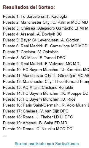 Lista de participantes: Real Madrid E. Haaland DC, Liverpool Rodri MCD MC, Roma M. Salah, Real Madrid J. Bellingham MCO MC, Real Madrid Vini Jr. EI DC, FC Bayern Munchen K. Mbappe DC EI, FC Bayern Munchen H. Kane DC, Bayer 04 Leverkusen F. Wirtz MCO, Real Madrid T. Courtois POR, Chelsea V. van Dijk DFC, Fc Barcelona M. ter Stegen POR, Liverpool Alisson POR, Real Madrid F. Valverde MC MD, Manchester City C. Palmer MCO MD, Bayer 04 Leverkusen A. Rüdiger DFC, Arsenal B. Saka ED MD, Paris Saint-Germain A. Griezmann DC MI, Manchester City M.Odegaard MC, Manchester City P. Foden ED EI MCO, Paris Saint-Germain W. Saliba DFC, FC Bayern Munchen D. Rice, Manchester City Ruben Dias DFC, Borussia Dortmund A. Bastoni DFC, Manchester City Theo Bernard François Hernandez, Paris Saint-Germain G. Donnarumma POR, Paris Saint-Germain Marquinhos DFC, Paris Saint-Germain N. Barella MC MCD, Fc Barcelona J. Musiala MCO MI MC, Real Madrid J. Tah DFC, Manchester City Ederson POR, AC Milan M. Maignan POR, FC Bayern Munchen J. Kimmich MCD LD, Chelsea V. Osimhen, Real Madrid Rodrygo ED DC, Fc Barcelona Pedri MC EI, Manchester City A. Isak, Fc Barcelona J. Kounde LD DFC, Fc Barcelona F. de Jong MC MCD, Liverpool A. Mac Allister MC MCD, Liverpool T. Alexander-Arnold LD, Manchester City Bernardo Silva MC ED, Arsenal Bremer DFC, Borussia Dortmund G. Kobel POR, Borussia Dortmund L. Modric MC MCO MCD, Manchester City Heung-Min Son, Bayer 04 Leverkusen Grimaldo MI LI, AC Milan P. Dybala MCO DC, Real Madrid Carvajal LD, Paris Saint-Germain O. Dembele ED MCO, Chelsea Nico Williams, Fc Barcelona Raphinha ED EI MD, AC Milan K. Kvaratskhelia, AC Milan Vitinha MC MCD, Fc Barcelona R. Araujo DFC LD, Real Madrid A. Tchouameni MCD MC DFC, Chelsea M. Caicedo MCD, Real Madrid eder Militao DFC, Roma L. Openda, Paris Saint-Germain A. Hakimi LD, Borussia Dortmund N. Schlotterbeck DFC, Arsenal Bruno Guimaraes, Liverpool Dani Olmo, Bayer 04 Leverkusen Diogo Jota DC EI, Liverpool L. Diaz MI EI, Liverpool Rafael Leao EI MI DC, Arsenal David Raya POR, Chelsea G. Mamardashvili, FC Bayern Munchen Palhinha MCD MC, Real Madrid D. Alaba DFC LI, AC Milan Cristiano Ronaldo, Borussia Dortmund N. Kanté, Borussia Dortmund R. Mahrez, FC Bayern Munchen M. Neuer POR, Bayer 04 Leverkusen S. Tonali, FC BARCELONA J. Alvarez DC MCO, Real Madrid J. Frimpong, FC Bayern Munchen M. Olise MD ED, Manchester City J. Gvardiol LI DFC, FC Bayern Munchen L. Sane MD MI ED, Bayer 04 Leverkusen E. Palacios MC MCD, Liverpool I. Konate DFC, AC Milan C. Pulisic ED MD EI, Paris Saint-Germain A. Lookman, Arsenal B. White LD, Paris Saint-Germain M. Thuram DC, Arsenal Mikel Merino MC MCO, Manchester City M. Akanji DFC, Manchester City N. Ake DFC LI, AC Milan S. Guirassy DC, Paris Saint-Germain J. Brandt MCO MD MC, Manchester City J. Stones DFC MCD LD, Real Madrid K. Coman MI MD, Manchester City İ. Gündoğan MC MCD, Roma M. Hummels DFC, Liverpool F. Acerbi DFC, FC BARCELONA D. Kulusevski, Chelsea X. Simons, Borussia Dortmund Pedro Gonçalves, Fc Barcelona Lamine Yamal ED EI, Real Madrid E. Camavinga MC MCD LI, Roma C. Nkunku MCO DC, Paris Saint-Germain Nuno Mendes LI, Liverpool C. Gakpo MI EI DC, Bayer 04 Leverkusen Pedro Porro, Arsenal T. Reijnders MC MCD MCO, Fc Barcelona B. Kamara MCD MC, FC Bayern Munchen A. Davies LI MI, FC BARCELONA Marc Cucurella LI, AC Milan A. Christensen DFC MCD, Arsenal A. Dovbyk DC, Bayer 04 Leverkusen T. Koopmeiners MC MCO, FC Bayern Munchen D. Upamecano DFC, Real Madrid R. De Paul MC MCD, Bayer 04 Leverkusen Aleix Garcia MC MCD, Arsenal L. Trossard EI DC, FC Bayern Munchen K. Laimer LD MCD MC, Real Madrid F. Mendy LI, Manchester City M. Kovačic MC MCD, FC Bayern Munchen Kim Min Jae DFC, FC Bayern Munchen F. Chiesa MD MI DC, Chelsea K. Koulibaly, Bayer 04 Leverkusen M. Sabitzer MC MCO MCD, Liverpool A. Robertson LI, Roma G. Mancini DFC, Bayer 04 Leverkusen R. Andrich MCD MC DFC, Borussia Dortmund T. Partey MCD MC LD, Bayer 04 Leverkusen L. Hradecký POR, Bayer 04 Leverkusen A. Gordon, Liverpool M. van de Ven, Arsenal Sancet, Arsenal M. Diaby, Borussia Dortmund Y. En-Nesyri, Manchester City M. Zaccagni, Fc Barcelona Savinho EI ED, Paris Saint-Germain B. Barcola EI ED, Fc Barcelona Balde LI LD MI, AC Milan Brahim MCO ED EI, Chelsea E. Fernandez MC MCD, Fc Barcelona J. David, Liverpool R. Gravenberch MCD MC, Borussia Dortmund D. Udogie, Arsenal Gabriel Martinelli EI MI, Arsenal P. Hincapie DFC LI, Chelsea R. James LD, Real Madrid A. Correa DC MD, AC Milan F. Tomori DFC, Bayer 04 Leverkusen E. Tapsoba DFC, AC Milan J. Grealish EI MI, Manchester City K. Walker LD, Roma S. Gnabry MD MI DC, FC Bayern Munchen L. Goretzka MC MCD, Borussia Dortmund D. Zapata, AC Milan A. Robinson, Liverpool B. Mbeumo, Paris Saint-Germain Joao Neves MC MCD, Fc Barcelona F. Kadıoğlu, Paris Saint-Germain R. Kolo Muani DC, Liverpool D. Szoboszlai MCO MC, Chelsea Joao Felix MCO MI DC, Real Madrid A. Lunin POR, AC Milan Y. Fofana MCD MC, Arsenal Gabriel Jesus DC, Borussia Dortmund N. Süle DFC LD, Chelsea B. Henrichs, FC BARCELONA Jorginho MCD MC, Manchester City S. Ortega POR, Paris Saint-Germain D. Malen, Roma F. Kessié, Manchester City W. Zaïre-Emery MC MCD, Roma J. Doku EI ED, Chelsea M. Gusto LD, Paris Saint-Germain W. Pacho DFC, Liverpool C. Jones MC MCO MCD, Roma J. Timber LD LI DFC, Borussia Dortmund F. Nmecha MCD MC, AC Milan S. Chukwueze MD ED, Arsenal Javi Galan LI MI, Bayer 04 Leverkusen J. Hofmann MCO DC, Roma É. Mendy, Borussia Dortmund J. Gittens EI MI, Arsenal J. Musso POR, Chelsea L. Colwill DFC, Chelsea N. Madueke MD, Manchester City Samuel Lino MI EI, Chelsea Pedro Neto MD MI, AC Milan M. Thiaw DFC, Chelsea W. Fofana DFC, Bayer 04 Leverkusen D. Lukebakio ED MD DC, Roma E. Ndicka DFC, FC Bayern Munchen S. Boey LD, FC Bayern Munchen H. Ito DFC LI, Borussia Dortmund J. Ryerson LD LI, AC Milan Robert Sanchez POR, Bayer 04 Leverkusen N. Mukiele LD DFC MD, AC Milan D. Calabria LD, Borussia Dortmund R. Bensebaini LI DFC, Arsenal R. Sterling MI MD, Roma S. El 