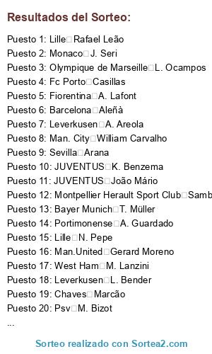 Lista de participantes: Association Sportive de Saint-etienne C. Njie, Association Sportive de Saint-etienne Diogo Jota, Association Sportive de Saint-etienne R. Cabella, Association Sportive de Saint-etienne J. Moulin, Association Sportive de Saint-etienne L. Perrin, Association Sportive de Saint-etienne L. Diony, Association Sportive de Saint-etienne M. Debuchy, Association Sportive de Saint-etienne N. Subotić, Association Sportive de Saint-etienne T. Kolodziejczak, Association Sportive de Saint-etienne Gabriel Silva, Association Sportive de Saint-etienne W. Khazri, Association Sportive de Saint-etienne K. Monnet-Paquet, Association Sportive de Saint-etienne Y. M'Vila, Association Sportive de Saint-etienne R. Berić, Association Sportive de Saint-etienne R. Hamouma, Association Sportive de Saint-etienne Y. Salibur, Association Sportive de Saint-etienne Marquinhos, Association Sportive de Saint-etienne Borja Valero, Association Sportive de Saint-etienne W. Rooney, Association Sportive de Saint-etienne K. Trapp, Association Sportive de Saint-etienne Joao Moutinho, Association Sportive de Saint-etienne D. Sidibe, Mönchengladbach Y. Sommer, Mönchengladbach M. Lang, Mönchengladbach M. Ginter, Mönchengladbach N. Elvedi, Mönchengladbach O. Wendt, Mönchengladbach T. Strobl, Mönchengladbach J. Hofmann, Mönchengladbach D. Zakaria, Mönchengladbach P. Herrmann, Mönchengladbach T. Hazard, Mönchengladbach Raffael, Mönchengladbach L. Stindl, Mönchengladbach C. Kramer, Mönchengladbach F. Johnson, Mönchengladbach F. Neuhaus, Mönchengladbach T. Jantschke, Mönchengladbach T. Sippel, Mönchengladbach J. Drmić, Mönchengladbach H. Vanaken, Mönchengladbach E. Lamela, Mönchengladbach H. Son, Mönchengladbach M. Depay, Olympique de Marseille F. Ghoulam, Olympique de Marseille K. Havertz, Olympique de Marseille D. Ćaleta-Car, Olympique de Marseille J. Amavi, Olympique de Marseille L. Ocampos, Olympique de Marseille V. Germain, Olympique de Marseille M. Lopez, Olympique de Marseille B. Sarr, Olympique de Marseille B. Kamara, Olympique de Marseille Y. Pele, Olympique de Marseille S. Savić, Olympique de Marseille R. Aguilar, Olympique de Marseille G. Defrel, Olympique de Marseille Gedson Fernandes, Olympique de Marseille R. Zieler, Olympique de Marseille T. Delaney, Olympique de Marseille S. Boufal, Olympique de Marseille L. Koscielny, Olympique de Marseille Miloš Degenek, Olympique de Marseille Mathieu Valbuena, Olympique de Marseille Tyler Adams, Olympique de Marseille Adama Traore, VfB Stuttgart R. Fährmann, VfB Stuttgart Pablo Maffeo, VfB Stuttgart T. Baumgartl, VfB Stuttgart B. Pavard, VfB Stuttgart E. Insúa, VfB Stuttgart S. Ascacíbar, VfB Stuttgart D. Aogo, VfB Stuttgart C. Gentner, VfB Stuttgart E. Thommy, VfB Stuttgart M. Gómez, VfB Stuttgart C. Akolo, VfB Stuttgart A. Donis, VfB Stuttgart D. Didavi, VfB Stuttgart G. Castro, VfB Stuttgart H. Badstuber, VfB Stuttgart J. Grahl, VfB Stuttgart M. Kempf, VfB Stuttgart A. Beck, VfB Stuttgart N. Sansone, VfB Stuttgart Portu, VfB Stuttgart S. Giovinco, VfB Stuttgart Rodrigo, Ado Den Haag R. Zwinkels, Ado Den Haag G. Troupee, Ado Den Haag T. Beugelsdijk, Ado Den Haag W. Kanon, Ado Den Haag A. Meijers, Ado Den Haag L. Immers, Ado Den Haag D. Malone, Ado Den Haag El Khayati, Ado Den Haag R. Kishna, Ado Den Haag T. Necid, Ado Den Haag S. Becker, Ado Den Haag I. Groothuizen, Ado Den Haag D. Rugani, Ado Den Haag Kiko Casilla, Ado Den Haag S. Coleman, Ado Den Haag E. Garay, Ado Den Haag K. Strootman, Ado Den Haag Ismaily, Ado Den Haag V. Tsygankov, Ado Den Haag A. Dzagoev, Ado Den Haag C. Pavón, Ado Den Haag O. Giroud, Ado Den Haag K. Asamoah, Ajax A. Onana, Ajax D. van de Beek, Ajax J. Veltman, Ajax D. Blind, Ajax K. Lamprou, Ajax L. Schøne, Ajax F. de Jong, Ajax David Neres, Ajax H. Ziyech, Ajax K. Huntelaar, Ajax D. Tadić, Ajax K. Dolberg, Ajax Z. Labyad, Ajax Ruben Peña, Ajax F. Kamano, Ajax P. Sisto, Ajax L. Digne, Ajax J. Brooks, Ajax D. Criscito, Ajax M. Vecino, Ajax C. Bacca, Arsenal M. Elneny, Arsenal Hector Bellerín, Arsenal Sokratis, Arsenal S. Mustafi, Arsenal Nacho Monreal, Arsenal A. Ramsey, Arsenal A. Lacazette, Arsenal P. Aubameyang, Arsenal D. Welbeck, Arsenal R. Holding, Arsenal M. Guendouzi, Arsenal E. Martínez, Arsenal B. Leno, Arsenal C. Tolisso, Arsenal J. Guilavogui, Arsenal J. Stones, Arsenal M. Sanson, Arsenal Rony Lopes, Arsenal Fabián, Arsenal N. Tagliafico, Arsenal L. Hrádecký, Arsenal Andre Gomes, Atalanta E. Berisha, Atalanta P. Gollini, Atalanta Rafael Tolói, Atalanta A. Masiello, Atalanta H. Hateboer, Atalanta J. Palomino, Atalanta D. Zapata, Atalanta A. Gómez, Atalanta E. Rigoni, Atalanta J. Iličić, Atalanta M. Pašalić, Atalanta R. Gosens, Atalanta M. Fellaini, Atalanta Sergio Oliveira, Atalanta M. Waris, Atalanta S. Zaza, Atalanta Andreas Pereira, Atalanta V. Lindelöf, Atalanta Y. Tielemans, Atalanta Yuri Berchiche, Atalanta A. Januzaj, Atletico de madrid J. Oblak, Atletico de madrid N. Kalinić, Atletico de madrid D. Godín, Atletico de madrid J. Gimenez, Atletico de madrid A. Griezmann, Atletico de madrid Juanfran, Atletico de madrid Filipe Luís, Atletico de madrid L. Hernández, Atletico de madrid Vitolo, Atletico de madrid Rodri, Atletico de madrid Gelson Martins, Atletico de madrid Capa, Atletico de madrid Gabriel Jesus, Atletico de madrid M. Hitz, Atletico de madrid I. Gueye, Atletico de madrid S. Kagawa, Atletico de madrid A. Di María, Atletico de madrid A. Correa, Atletico de madrid Lautaro Martinez, Atletico de madrid A. Diaby, Az Alkmaar M. Bizot, Az Alkmaar R. van Rhijn, Az Alkmaar R. Vlaar, Az Alkmaar T. Koopmeiners, Az Alkmaar T. Ouwejan, Az Alkmaar F. Midtsjø, Az Alkmaar J. Svensson, Az Alkmaar G. Til, Az Alkmaar A. Guðmundsson, Az Alkmaar B. Johnsen, Az Alkmaar O. Idrissi, Az Alkmaar D. Rotariu, Az Alkmaar M. Vejinović, Az Alkmaar A. Maher, Az Alkmaar S. Wuytens, Az Alkmaar P. Hatzidiakos, Az Alkmaar I. Bel Hassani, Az Alkmaar R. de Boer, Az Alkmaar . Wijndal, Az Alkmaar J