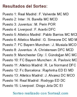 Lista de participantes: Manchester City Rodri MCD MC, FC Bayern Munchen H. Kane DC, Liverpool M. Salah MD ED, Manchester City K. De Bruyne MC MCO, Real Madrid K. Mbappe DC EI, Real Madrid J. Bellingham MCO MC, Fc Barcelona R. Lewandowski DC, Fc Barcelona M. ter Stegen POR, Inter L. Martinez DC, Liverpool V. van Dijk DFC, Liverpool Alisson POR, Real Madrid T. Courtois POR, Atletico Madrid J. Oblak POR, Atletico Madrid A. Griezmann DC MI, Paris Saint-Germain L. Messi, Real Madrid A. Rüdiger DFC, Real Madrid F. Valverde MC MD, FC Bayern Munchen J. Kimmich MCD LD, FC Bayern Munchen D. Rice, FC Bayern Munchen J. Musiala MCO MI MC, Inter Y. Sommer POR, Inter N. Barella MC MCD, Inter A. Bastoni DFC, Manchester City Ruben Dias DFC, Manchester City Ederson POR, Manchester City Theo Bernard François Hernandez, Manchester City P. Foden ED EI MCO, Paris Saint-Germain Marquinhos DFC, Paris Saint-Germain G. Donnarumma POR, Atletico Madrid L. Modric MC MCO MCD, Fc Barcelona F. de Jong MC MCD, Fc Barcelona J. Kounde LD DFC, Fc Barcelona Pedri MC EI, Inter H. Çalhanoğlu MCD MC, Juventus Bremer DFC, Liverpool T. Alexander-Arnold LD, Liverpool A. Mac Allister MC MCD, Manchester City Bernardo Silva MC ED, Paris Saint-Germain Heung-Min Son, Real Madrid Carvajal LD, Real Madrid Rodrygo ED DC, Atletico Madrid Nico Williams, Fc Barcelona W. Szczesny POR, Fc Barcelona R. Araujo DFC LD, Fc Barcelona Raphinha ED EI MD, Fc Barcelona Dani Olmo, FC Bayern Munchen M. Neuer POR, FC Bayern Munchen Palhinha MCD MC, Juventus Neymar Jr, Liverpool L. Diaz MI EI, Liverpool Diogo Jota DC EI, Paris Saint-Germain A. Hakimi LD, Paris Saint-Germain Vitinha MC MCD, Paris Saint-Germain O. Dembele ED MCO, Real Madrid Cristiano Ronaldo, Real Madrid D. Alaba DFC LI, Real Madrid eder Militao DFC, Real Madrid A. Tchouameni MCD MC DFC, Atletico Madrid J. Alvarez DC MCO, FC Bayern Munchen K. Coman MI MD, FC Bayern Munchen M. Olise MD ED, Inter B. Pavard DFC LD, Inter L. Sane MD MI ED, Inter F. Dimarco LI MI, Inter M. Thuram DC, Juventus D. Vlahovic DC, Liverpool F. Acerbi DFC, Liverpool I. Konate DFC, Manchester City M. Akanji DFC, Manchester City İ. Gündoğan MC MCD, Manchester City J. Stones DFC MCD LD, Manchester City N. Ake DFC LI, Manchester City J. Gvardiol LI DFC, Real Madrid J. Frimpong, Atletico Madrid Koke MCD MC, Atletico Madrid J. Gimenez DFC, Atletico Madrid Marcos Llorente MD LD MC, Atletico Madrid O. Marmoush, Atletico Madrid R. Le Normand DFC, Fc Barcelona Gavi MC EI, Fc Barcelona Lamine Yamal ED EI, FC Bayern Munchen Kim Min Jae DFC, FC Bayern Munchen K. Koulibaly, FC Bayern Munchen K. Laimer LD MCD MC, FC Bayern Munchen D. Upamecano DFC, FC Bayern Munchen A. Davies LI MI, Inter H. Mkhitaryan MC MCO, Inter S. de Vrij DFC, Inter K. Havertz, Juventus Douglas Luiz MC MCD, Juventus T. Koopmeiners MC MCO, Juventus M. Locatelli MCD MC, Juventus A. Christensen DFC MCD, Liverpool A. Robertson LI, Liverpool C. Gakpo MI EI DC, Manchester City M. Kovačic MC MCD, Manchester City F. Chiesa MD MI DC, Paris Saint-Germain L. Hernandez DFC LI, Paris Saint-Germain Nuno Mendes LI, Real Madrid F. Mendy LI, Real Madrid R. De Paul MC MCD, Real Madrid E. Camavinga MC MCD LI, Atletico Madrid a. Correa DC MD, Atletico Madrid A. Sørloth DC, Atletico Madrid N. Molina LD, Fc Barcelona J. David, Fc Barcelona Savinho EI ED, Fc Barcelona Balde LI LD MI, FC Bayern Munchen L. Goretzka MC MCD, Inter D. Dumfries LD MD, Juventus Danilo DFC LD, Liverpool Iñaki Williams, Liverpool D. Nuñez DC, Liverpool R. Gravenberch MCD MC, Manchester City K. Walker LD, Paris Saint-Germain B. Barcola EI ED, Real Madrid S. Gnabry MD MI DC, Real Madrid J. Grealish EI MI, Sevilla FC Iñigo Martinez DFC, Fc Barcelona F. Kadıoğlu, Inter M. Darmian LD DFC MD, Inter P. Zieliński MC MCD, Juventus A. Milik DC, Liverpool D. Szoboszlai MCO MC, Manchester City S. Ortega POR, Paris Saint-Germain R. Kolo Muani DC, Paris Saint-Germain Joao Neves MC MCD, Real Madrid A. Lunin POR, Sevilla FC D. Frattesi MC MCO, Atletico Madrid A. Witsel DFC, Atletico Madrid Reinildo LI DFC, Juventus Marco Asensio ED DC MC, Juventus N. Gonzalez ED MD EI, Juventus M. Di Gregorio POR, Liverpool W. Endo MCD MC, Liverpool C. Jones MC MCO MCD, Manchester City J. Doku EI ED, Paris Saint-Germain W. Pacho DFC, Paris Saint-Germain Gonçalo Ramos DC, Paris Saint-Germain W. Zaïre-Emery MC MCD, Sevilla FC N. Gudelj DFC MCD, Sevilla FC M. Taremi DC, Sevilla FC J. Gomez DFC LD LI, Sevilla FC Suso MD MCO MC, Sevilla FC M. Rashford, Atletico Madrid J. Musso POR, Atletico Madrid Samuel Lino MI EI, FC Bayern Munchen S. Boey LD, FC Bayern Munchen H. Ito DFC LI, Inter M. Arnautovic DC, Inter M. Lazzari, Juventus M. Perin POR, Liverpool C. Kelleher POR, Paris Saint-Germain P. Kimpembe DFC, Paris Saint-Germain Lee Kang In ED MCO DC, Sevilla FC D. Lukebakio ED MD DC, Atletico Madrid Riquelme MI, Fc Barcelona Eric Garcia DFC MCD LD, FC Bayern Munchen Francisco Conceiçao MD ED, Inter C. Ejuke MI MD EI, Juventus F. Gatti DFC, Juventus W. McKennie MC MCD, Juventus K. Thuram MC MCD, Juventus A. Cambiaso LD LI MD, Juventus P. Kalulu DFC LD, Liverpool H. Elliott MCO MC ED, Manchester City Matheus Nunes MC MI, Paris Saint-Germain Fran Garcia LI, Sevilla FC T. Werner, Sevilla FC D. Sow MC MCD, Sevilla FC Saul MC MI, Sevilla FC L. Bade DFC, Atletico Madrid Pablo Barrios MC MCD, Fc Barcelona Ansu Fati MCO MI DC, FC Bayern Munchen M. Tel DC MI MD, Inter Y. Bisseck DFC, Juventus Arthur MCD MC, Paris Saint-Germain M. Safonov POR, Paris Saint-Germain Lucas Beraldo DFC LI, Sevilla FC D. Doue EI MC, Fc Barcelona Fermin MC EI MCO, FC Bayern Munchen A. Pavlovic MCD MC, Liverpool C. Bradley LD, Sevilla FC Ø. Nyland POR, Sevilla FC G. Montiel LD, Sevilla FC Adria Pedrosa LI, Inter Josep Martinez POR, Sevilla FC A. Sambi Lokonga MC MCD, Atletico Madrid G. Simeone DC MD MI, Fc Barcelona Pau Cubarsi DFC, FC Bayern Munchen S. Ulreich POR, Manchester City R. Vargas, Sevilla FC alvaro POR, Sevilla FC Carmona LD MD, Juventus K. Yıldız EI MI