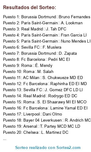Lista de participantes: Real Madrid M. Salah MD ED, Real Madrid K. Mbappé DC EI MI, Liverpool V. van Dijk DFC, Real Madrid J. Bellingham MCO MC, Liverpool O. Dembele, Liverpool Alisson POR, Liverpool F. Wirtz MCO DC MC, Real Madrid T. Courtois POR, Real Madrid Vini Jr. EI DC MI, Real Madrid F. Valverde MC MCD LD, Arsenal B. Saka ED MD, Arsenal Gabriel DFC, Liverpool A. Isak DC, Arsenal M. Ødegaard MC MCO, Arsenal V. Gyökeres DC, Arsenal W. Saliba DFC, Arsenal D. Rice MCD MC, Arsenal David Raya POR, Liverpool A. Mac Allister MC MCD, Napoli K. De Bruyne MC MCO, Liverpool I. Konaté DFC, Real Madrid A. Rüdiger DFC, Real Madrid T. Alexander-Arnold LD MD, Arsenal P. Dybala, Real Betis Balompie L. Messi, Liverpool R. Gravenberch MCD MC, Napoli S. McTominay MC MCO MI, Real Madrid Carvajal LD MD, Real Madrid Rodrygo ED DC MD, Real Betis Balompie A. Griezmann, Arsenal H. Son, Liverpool P. Gulácsi POR, Liverpool N. Kanté, SL Benfica B. Mbeumo, Liverpool C. Gakpo MI EI, Napoli R. Lukaku DC, Real Betis Balompie Isco MCO MI MC, Real Madrid A. Tchouaméni MCD MC DFC, Real Madrid Éder Militão DFC, Real Betis Balompie T. Hernández, Real Betis Balompie M. Neuer POR, Valencia CF Rafael Leão, Napoli Marcos Llorente, RC Celta F. Acerbi, Liverpool M. Zaccagni, Arsenal P. Hincapié DFC LI MI, Arsenal Zubimendi MCD MC, Sevilla FC E. Eze MCO EI DC, Arsenal Mikel Merino MC DC, Arsenal B. White LD, Arsenal L. Trossard EI DC MI, Liverpool D. Szoboszlai MCO MC, Liverpool J. Frimpong LD MD ED, Liverpool H. Ekitiké DC MCO, Napoli S. Lobotka MC MCD, Napoli G. Di Lorenzo LD DFC MD, Napoli A. Rrahmani DFC, RC Celta Iago Aspas ED DC MD, Real Madrid E. Camavinga MC MCD LI, Valencia CF Ayoze, Napoli R. Araujo, Arsenal J. Timber LD LI DFC MD, Arsenal K. Havertz DC MC MCO, Liverpool M. Kerkez LI MI, Liverpool A. Robertson LI MI, Napoli A. Buongiorno DFC, Napoli A. Zambo Anguissa MC MCO, Napoli A. Meret POR, Real Betis Balompie G. Lo Celso MCO MC MCD, Real Madrid Brahim MD MI MCO ED, Real Madrid D. Alaba DFC LI MI, Real Madrid D. Huijsen DFC, SL Benfica V. Pavlidis DC MCO, SL Benfica D. Lukébakio MD ED DC, SL Benfica N. Otamendi DFC, Sevilla FC Malcom, Sevilla FC K. Koulibaly, SL Benfica Y. Bounou POR, RC Celta Á. Di María, Napoli Miguel Gutiérrez LI MI, Napoli David Neres EI MI, Napoli M. Politano ED MD, Real Madrid A. Lunin POR, Real Madrid F. Mendy LI MI, Real Madrid A. Güler MD MCO ED, Valencia CF Gayà LI MI, Malaga CF Sergi Darder, Arsenal N. Madueke ED MD, Arsenal Gabriel Jesus DC MCO, Liverpool C. Jones MCO MC MCD, Napoli N. Lang EI MI, RC Celta Mingueza LD MD MI, RC Celta Borja Iglesias DC, Real Betis Balompie Fornals MCD MCO MD MC, Real Betis Balompie Diego Llorente DFC, Real Madrid Álvaro Carreras LI MI, SL Benfica G. Sudakov MCO MC MCD, SL Benfica A. Trubin POR, SL Benfica F. Aursnes MC LD MD MCO, Arsenal Kepa POR, Liverpool J. Gomez DFC LD LI MD, Napoli V. Milinković-Savić POR, RC Celta Marcos Alonso DFC LI, Real Betis Balompie Álvaro Valles POR, Real Betis Balompie Pau López POR, Real Betis Balompie Bartra DFC, Real Madrid Fran García LI MI, SL Benfica R. Ríos MC MCD, Valencia CF S. Dimitrievski POR, Arsenal M. Lewis-Skelly LI MC, Arsenal R. Calafiori LI DFC, Liverpool C. Bradley LD MD, Napoli S. Beukema DFC, Napoli L. Spinazzola LI MI, RC Celta I. Moriba MC, RC Celta Fran Beltrán MC MCD, RC Celta C. Starfelt DFC, Real Betis Balompie S. Amrabat MCD MC DFC, Real Betis Balompie Abde MI EI, Real Betis Balompie Natan DFC, Real Betis Balompie Cucho Hernández DC MCO, Real Betis Balompie Marc Roca MCD MC, Sevilla FC Azpilicueta DFC LD, Sevilla FC C. Ejuke MI MD EI, SL Benfica António Silva DFC, SL Benfica Tomás Araújo DFC LD MD, SL Benfica A. Bah LD MD, SL Benfica Bruma EI MI MCO, Valencia CF Diego López MI MD EI, Valencia CF Hugo Duro DC, Valencia CF Luis Rioja MD MI ED, Arsenal Mosquera DFC, Napoli E. Elmas MI EI MC, RC Celta Bryan Zaragoza MI EI MD, Real Betis Balompie Altimira MCD MC, Real Betis Balompie Aitor Ruibal MD LD DC ED, Sevilla FC Endrick DC, Real Madrid F. Mastantuono MCO MD ED DC, Sevilla FC N. Gudelj DFC MCD, SL Benfica E. Barrenechea MC MCD, SL Benfica L. Barreiro MC MCD MCO, Valencia CF Javi Guerra MC MCD, Valencia CF Pepelu MC MCD, Napoli R. Højlund DC, RC Celta Hugo Álvarez MI MD EI, Real Betis Balompie C. Bakambu DC, Real Betis Balompie V. Gómez DFC LI, Real Betis Balompie Riquelme MI MD LI EI, Real Betis Balompie Héctor Bellerín LD MD, Sevilla FC B. Mendy MCD MC DFC, RC Celta A. Sanchez DC ED MCO, Sevilla FC Carmona LD MD ED, Sevilla FC Ø. Nyland POR, Sevilla FC Alfon MI EI MCO, Sevilla FC R. Vargas MI MCO EI, Sevilla FC D. Sow MC MCD, Valencia CF Agirrezabala POR, Valencia CF Thierry Correia LD LI MD, Valencia CF M. Diakhaby DFC, Valencia CF Dani Raba MD DC ED, Valencia CF B. Santamaria MCD MC, RC Celta J. Aidoo DFC, RC Celta Carreira MD LD MI, RC Celta Ferran Jutglà DC, Sevilla FC Fábio Cardoso DFC, Sevilla FC L. Agoumé MCD MC DFC, Sevilla FC Juanlu Sánchez LD MCO MD, Sevilla FC Kike Salas DFC LI, SL Benfica A. Schjelderup EI MCO MI, SL Benfica F. Ivanović DC MCO, Valencia CF César Tárrega DFC, Valencia CF Copete DFC, Valencia CF André Almeida MCO DC MC, Valencia CF F. Ugrinić MC MCO MCD, Valencia CF A. Danjuma MI DC EI, Malaga CF Alfonso Herrero POR, Napoli B. Gilmour MC MCD, RC Celta I. Radu POR, RC Celta W. Swedberg EI MC MI, RC Celta Hugo Sotelo MC MCD, RC Celta Pablo Durán DC MI MCO, RC Celta Carlos Domínguez DFC, Sevilla FC O. Vlachodimos POR, Sevilla FC Álvaro Ferllo POR, Sevilla FC G. Suazo LI MI, Sevilla FC A. Januzaj ED MD MI, Sevilla FC Isaac Romero DC EI ED MI, SL Benfica A. Dedić LD LI MD, Valencia CF L. Ramazani MI MD DC EI, Valencia CF D. Foulquier LD LI MD, Malaga CF Roberto Fernández, RC Celta Iván Villar POR, RC Celta M. Ristić LI MI, Sevilla FC A. Adams DC, SL Benfica S. Dahl LI MI, Malaga CF Ontiveros, Napoli P. Mazzocchi LD MD, SL Benfica Manu Silva MCD DFC, Liverpool F. Woodman POR, SL Benfica G. Prestianni MD MCO ED, Arse