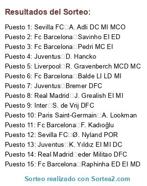 Lista de participantes: Manchester City E. Haaland DC, Manchester City Rodri MCD MC, Real Madrid J. Bellingham MCO MC, Real Madrid Vini Jr. EI DC, Real Madrid K. Mbappe DC EI, FC Bayern Munchen H. Kane DC, Manchester City K. De Bruyne MC MCO, Inter L. Martinez DC, Real Madrid T. Courtois POR, Liverpool V. van Dijk DFC, Fc Barcelona M. ter Stegen POR, Liverpool Alisson POR, Real Madrid F. Valverde MC MD, Atletico Madrid A. Griezmann DC MI, Real Madrid A. Rüdiger DFC, Atletico Madrid J. Oblak POR, Paris Saint-Germain L. Messi, FC Bayern Munchen J. Musiala MCO MI MC, Manchester City P. Foden ED EI MCO, FC Bayern Munchen D. Rice, Manchester City Ruben Dias DFC, Inter A. Bastoni DFC, Manchester City Theo Bernard François Hernandez, Paris Saint-Germain G. Donnarumma POR, Paris Saint-Germain Marquinhos DFC, Inter N. Barella MC MCD, Manchester City Ederson POR, FC Bayern Munchen J. Kimmich MCD LD, Inter Y. Sommer POR, Real Madrid Rodrygo ED DC, Fc Barcelona Pedri MC EI, Fc Barcelona J. Kounde LD DFC, Fc Barcelona F. de Jong MC MCD, Liverpool A. Mac Allister MC MCD, Liverpool T. Alexander-Arnold LD, Manchester City Bernardo Silva MC ED, Juventus Bremer DFC, Paris Saint-Germain Heung-Min Son, Real Madrid Carvajal LD, Inter H. Çalhanoğlu MCD MC, Atletico Madrid L. Modric MC MCO MCD, Paris Saint-Germain O. Dembele ED MCO, Fc Barcelona Dani Olmo, Atletico Madrid Nico Williams, Fc Barcelona Raphinha ED EI MD, Paris Saint-Germain Vitinha MC MCD, Fc Barcelona R. Araujo DFC LD, Real Madrid A. Tchouameni MCD MC DFC, Real Madrid eder Militao DFC, Paris Saint-Germain A. Hakimi LD, Liverpool Diogo Jota DC EI, Liverpool L. Diaz MI EI, FC Bayern Munchen Palhinha MCD MC, Real Madrid D. Alaba DFC LI, Real Madrid Cristiano Ronaldo, Paris Saint-Germain N. Kanté, Fc Barcelona W. Szczesny POR, FC Bayern Munchen M. Neuer POR, Atletico Madrid J. Alvarez DC MCO, Real Madrid J. Frimpong, FC Bayern Munchen M. Olise MD ED, Manchester City J. Gvardiol LI DFC, Liverpool I. Konate DFC, Paris Saint-Germain A. Lookman, Inter M. Thuram DC, Juventus J. Maddison, Inter F. Dimarco LI MI, Manchester City M. Akanji DFC, Manchester City N. Ake DFC LI, FC Bayern Munchen K. Coman MI MD, Inter L. Sane MD MI ED, Manchester City J. Stones DFC MCD LD, Inter B. Pavard DFC LD, Manchester City İ. Gündoğan MC MCD, Liverpool F. Acerbi DFC, Fc Barcelona Lamine Yamal ED EI, Real Madrid E. Camavinga MC MCD LI, Juventus Gavi MC EI, Paris Saint-Germain Nuno Mendes LI, Liverpool C. Gakpo MI EI DC, Inter K. Havertz, Fc Barcelona B. Kamara MCD MC, FC Bayern Munchen A. Davies LI MI, Atletico Madrid R. Le Normand DFC, Atletico Madrid O. Marmoush, Juventus Douglas Luiz MC MCD, Juventus M. Locatelli MCD MC, Juventus T. Koopmeiners MC MCO, Atletico Madrid C. Nkunku MCO DC, Atletico Madrid Marcos Llorente MD LD MC, FC Bayern Munchen D. Upamecano DFC, Manchester City F. Chiesa MD MI DC, Atletico Madrid J. Gimenez DFC, Real Madrid R. De Paul MC MCD, FC Bayern Munchen K. Laimer LD MCD MC, Real Madrid F. Mendy LI, Manchester City M. Kovačic MC MCD, FC Bayern Munchen Kim Min Jae DFC, Liverpool A. Robertson LI, Atletico Madrid Koke MCD MC, Inter S. de Vrij DFC, FC Bayern Munchen K. Koulibaly, Inter H. Mkhitaryan MC MCO, Fc Barcelona Savinho EI ED, Paris Saint-Germain B. Barcola EI ED, Fc Barcelona Balde LI LD MI, Fc Barcelona J. David, Liverpool R. Gravenberch MCD MC, Atletico Madrid N. Molina LD, Atletico Madrid A. Sørloth DC, Liverpool Iñaki Williams, Real Madrid J. Grealish EI MI, Manchester City K. Walker LD, Real Madrid S. Gnabry MD MI DC, Juventus D. Hancko, FC Bayern Munchen L. Goretzka MC MCD, Inter D. Dumfries LD MD, Sevilla FC Iñigo Martinez DFC, Atletico Madrid T. Müller MCO DC MD, Paris Saint-Germain Joao Neves MC MCD, Fc Barcelona F. Kadıoğlu, Paris Saint-Germain R. Kolo Muani DC, Liverpool D. Szoboszlai MCO MC, Real Madrid A. Lunin POR, Sevilla FC D. Frattesi MC MCO, Juventus A. Milik DC, Juventus B. Henrichs, Inter P. Zieliński MC MCD, Manchester City S. Ortega POR, Inter M. Darmian LD DFC MD, Paris Saint-Germain W. Zaïre-Emery MC MCD, Manchester City J. Doku EI ED, Paris Saint-Germain W. Pacho DFC, Liverpool C. Jones MC MCO MCD, Sevilla FC M. Rashford, Sevilla FC Suso MD MCO MC, Sevilla FC J. Gomez DFC LD LI, Juventus N. Gonzalez ED MD EI, Juventus M. Di Gregorio POR, Juventus Marco Asensio ED DC MC, Atletico Madrid Reinildo LI DFC, Sevilla FC M. Taremi DC, Sevilla FC N. Gudelj DFC MCD, Liverpool W. Endo MCD MC, Atletico Madrid A. Witsel DFC, Atletico Madrid Samuel Lino MI EI, FC Bayern Munchen S. Boey LD, FC Bayern Munchen H. Ito DFC LI, Liverpool C. Kelleher POR, Paris Saint-Germain P. Kimpembe DFC, Inter M. Lazzari, Atletico Madrid J. Musso POR, Juventus M. Perin POR, Inter M. Arnautovic DC, Liverpool H. Elliott MCO MC ED, Liverpool K. Mainoo MCD MC, Sevilla FC A. Adli DC MI MCO, Atletico Madrid Riquelme MI, Paris Saint-Germain Fran Garcia LI, Fc Barcelona Eric Garcia DFC MCD LD, FC Bayern Munchen Francisco Conceiçao MD ED, Juventus P. Kalulu DFC LD, Juventus A. Cambiaso LD LI MD, Manchester City Matheus Nunes MC MI, Inter C. Ejuke MI MD EI, Juventus F. Gatti DFC, Juventus W. McKennie MC MCD, Liverpool T. Tomiyasu LD LI, Sevilla FC T. Werner, Fc Barcelona Ansu Fati MCO MI DC, Sevilla FC D. Doue EI MC, Paris Saint-Germain Lucas Beraldo DFC LI, FC Bayern Munchen M. Tel DC MI MD, Paris Saint-Germain M. Safonov POR, Inter Y. Bisseck DFC, Juventus Arthur MCD MC, Fc Barcelona Fermin MC EI MCO, Liverpool C. Bradley LD, Fc Barcelona A. Hložek, FC Bayern Munchen A. Pavlovic MCD MC, Sevilla FC Adria Pedrosa LI, Sevilla FC G. Montiel LD, Sevilla FC Ø. Nyland POR, Sevilla FC A. Sambi Lokonga MC MCD, Inter Josep Martinez POR, Fc Barcelona Pau Cubarsi DFC, Atletico Madrid G. Simeone DC MD MI, Sevilla FC Carmona LD MD, Manchester City R. Vargas, Sevilla FC alvaro POR, FC Bayern Munchen S. Ulreich POR, Juventus K. Yıldız EI MI DC, Sevilla FC V. Barco LI MI, Real Madrid Vallejo DFC, Fc Barcelona Marc Casado.