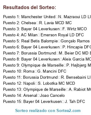 Lista de participantes: Chelsea C. Palmer MCO MD, Bayer 04 Leverkusen F. Wirtz MCO, Arsenal B. Saka ED MD, Arsenal M. Ødegaard MC, Arsenal W. Saliba DFC, AC Milan K. Kvaratskhelia, Arsenal Gabriel DFC, Chelsea M. Caicedo MCD, Borussia Dortmund G. Kobel POR, AC Milan Rafael Leao EI MI DC, Manchester United Bruno Fernandes MCO EI MC, AC Milan M. Maignan POR, Borussia Dortmund N. Schlotterbeck DFC, Bayer 04 Leverkusen J. Tah DFC, Bayer 04 Leverkusen Grimaldo MI LI, Arsenal Bruno Guimaraes, Roma P. Dybala MCO DC, Bayer 04 Leverkusen E. Palacios MC MCD, Bayer 04 Leverkusen Pedro Porro, Arsenal R. Lewandowski DC, Bayer 04 Leverkusen V. Boniface DC, AC Milan C. Pulisic ED MD EI, Olympique de Marseille M. Greenwood MCO MD DC, Arsenal B. White LD, Chelsea E. Fernandez MC MCD, AC Milan T. Reijnders MC MCD MCO, Manchester United M. de Ligt DFC, Arsenal David Raya POR, Borussia Dortmund K. Adeyemi EI DC MI, Chelsea G. Mamardashvili, Real Betis Balompie L. Hernandez DFC LI, Arsenal Gabriel Martinelli EI MI, Manchester United D. Nuñez DC, Bayer 04 Leverkusen G. Xhaka MCD MC, Chelsea Marc Cucurella LI, Arsenal Mikel Merino MC MCO, Roma A. Dovbyk DC, Arsenal Joao Cancelo, Manchester United L. Martinez DFC, Chelsea N. Jackson DC, Bayer 04 Leverkusen P. Hincapie DFC LI, Borussia Dortmund S. Guirassy DC, Chelsea Joao Felix MCO MI DC, Borussia Dortmund J. Brandt MCO MD MC, Chelsea R. James LD, Bayer 04 Leverkusen Aleix Garcia MC MCD, Manchester United M. Ugarte MCD MC, Chelsea J. Sancho MI MD, Manchester United Diogo Dalot LI LD, Olympique de Marseille A. Rabiot MC MCO, Arsenal L. Trossard EI DC, Manchester United Alejandro Garnacho EI MI MD, Borussia Dortmund J. Gittens EI MI, AC Milan Endrick DC ED, Real Betis Balompie Gonçalo Ramos DC, AC Milan F. Tomori DFC, Bayer 04 Leverkusen P. Schick DC, Manchester United L. Torreira, Napoli S. Lobotka MC MCD, Napoli A. Buongiorno DFC, Manchester United A. Saint-Maximin, Chelsea M. Gusto LD, Manchester United Amad ED MCO MD, Borussia Dortmund M. Sabitzer MC MCO MCD, Bayer 04 Leverkusen E. Tapsoba DFC, AC Milan Y. Fofana MCD MC, Borussia Dortmund R. Mahrez, Manchester United A. Onana POR, Olympique de Marseille Gaya, Real Betis Balompie Cucho DC, Borussia Dortmund M. Beier DC MD ED, Real Betis Balompie G. Lo Celso MCO MD, Chelsea R. Lavia MCD MC, Manchester United N. Mazraoui LD LI, Arsenal J. Timber LD LI DFC, Borussia Dortmund G. Di Lorenzo LD DFC, Roma G. Mancini DFC, Chelsea L. Colwill DFC, Chelsea N. Madueke MD, Manchester United Casemiro MCD MC, Roma L. Pellegrini MCO MC, Arsenal Gabriel Jesus DC, Borussia Dortmund F. Nmecha MCD MC, Bayer 04 Leverkusen R. Andrich MCD MC DFC, Real Betis Balompie Isco MCO MI MC, Bayer 04 Leverkusen Y. Carrasco, Olympique de Marseille I. Bennacer MCD MC MCO, AC Milan S. Chukwueze MD ED, Chelsea Pedro Neto MD MI, AC Milan M. Thiaw DFC, Chelsea W. Fofana DFC, Arsenal T. Partey MCD MC LD, Borussia Dortmund W. Anton DFC, Manchester United L. Shaw LI DFC, Real Betis Balompie Johnny Cardoso MCD MC, Manchester United R. Højlund DC, Roma B. Cristante MC MCD DFC, Borussia Dortmund N. Süle DFC LD, Olympique de Marseille L. Balerdi DFC, Napoli R. Lukaku DC, AC Milan R. Loftus-Cheek MC MCO, Napoli A. Zambo Anguissa MC MCD, Chelsea R. Calafiori LI DFC, Manchester United H. Maguire DFC, Napoli A. Meret POR, Manchester United M. Mount MC MCO, Olympique de Marseille P. Højbjerg MCD MC, Real Betis Balompie Yan Couto LD MD, Roma K. Kone MC MCD, Roma A. Saelemaekers MI MD ED, Napoli N. Okafor DC EI MCO, Olympique de Marseille K. Benzema, Manchester United Javi Galan LI MI, Real Betis Balompie F. JOrgensen POR, Napoli David Neres EI MI MD, Roma E. Ndicka DFC, AC Milan M. Gabbia DFC, Napoli K. Thuram MC MCD, Napoli G. Raspadori MCO DC EI, Chelsea T. Kleindienst, Napoli M. Politano ED MD, Roma M. Hummels DFC, Borussia Dortmund J. Ryerson LD LI, Borussia Dortmund D. Zapata, Chelsea Robert Sanchez POR, Chelsea T. Adarabioyo DFC, Roma M. Soule MD ED MCO, Manchester United V. LindelOf DFC LI, Olympique de Marseille A. Gouiri DC, Arsenal Jorginho MCD MC, Napoli S. McTominay MC MCD, Bayer 04 Leverkusen M. Terrier DC MI, Bayer 04 Leverkusen Iago Aspas, AC Milan L. Jovic DC, Bayer 04 Leverkusen N. Mukiele LD DFC MD, AC Milan T. Abraham DC, Borussia Dortmund E. Can MCD DFC, Napoli A. Rrahmani DFC, Bayer 04 Leverkusen J. Hofmann MCO DC, AC Milan D. Calabria LD, Olympique de Marseille V. Rongier MCD MC, Borussia Dortmund R. Bensebaini LI DFC, Arsenal R. Sterling MI MD, Arsenal O. Zinchenko LI, Bayer 04 Leverkusen N. Tella MD MI DC, Roma M. Solomon, Olympique de Marseille G. Rulli POR, Roma S. El Shaarawy MI EI MCO, Real Betis Balompie Diego Llorente DFC, Olympique de Marseille Q. Merlin LI MI, Roma S. Abdulhamid LD, Real Betis Balompie Marc Roca MCD MC, Napoli G. Kondogbia MCD DFC, Roma Angeliño LI MI, Roma L. Paredes MC MCD, Roma T. Baldanzi MCO DC, Olympique de Marseille Luis Henrique MI MD, Olympique de Marseille E. avila DC MD, Borussia Dortmund G. Reyna MD MCO MI, Roma M. Svilar POR, Roma D. Rensch LD DFC LI, Napoli M. Olivera LI, Napoli L. Spinazzola MI LI, Real Betis Balompie Y. Bounou, AC Milan Y. Musah MC MCD MD, Roma É. Mendy, Bayer 04 Leverkusen M. Kovař POR, Olympique de Marseille C. Mbemba DFC, Napoli B. Gilmour MC MCD, Olympique de Marseille A. Harit MCO MC, Real Betis Balompie Y. Sabaly LD LI, Olympique de Marseille Luiz Felipe DFC, Real Betis Balompie Pablo Fornals MD MCO MI, Manchester United A. Bayındır POR, AC Milan Emerson Royal LD DFC, Olympique de Marseille N. Maupay DC, Napoli P. Billing MC MCO MCD, Olympique de Marseille J. Rowe MD MI, Real Betis Balompie Aitor Ruibal LD MD, Olympique de Marseille A. Murillo LD DFC, Napoli G. Simeone DC, Arsenal Azpilicueta DFC LD, Real Betis Balompie Marc Bartra DFC, Bayer 04 Leverkusen L. Hradecký POR, Olympique de Marseille Ruben Blanco POR, Real Betis Balompie Marvin, AC Milan A. Florenzi LD LI, Real Betis Balompie Fran Vieites POR, Arsenal Neto POR, Napoli Juan Jesus DFC, Borussia Dortmund