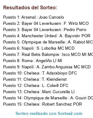 Lista de participantes: Bayer 04 Leverkusen F. Wirtz MCO, Arsenal R. Lewandowski DC, Chelsea C. Palmer MCO MD, Arsenal B. Saka ED MD, Arsenal M. Ødegaard MC, Arsenal W. Saliba DFC, Arsenal Gabriel DFC, AC Milan M. Maignan POR, Bayer 04 Leverkusen J. Tah DFC, Borussia Dortmund G. Kobel POR, Manchester United Bruno Fernandes MCO EI MC, Bayer 04 Leverkusen Grimaldo MI LI, Roma P. Dybala MCO DC, Bayer 04 Leverkusen G. Xhaka MCD MC, Olympique de Marseille K. Benzema, AC Milan K. Kvaratskhelia, Chelsea M. Caicedo MCD, AC Milan Rafael Leao EI MI DC, Borussia Dortmund N. Schlotterbeck DFC, Arsenal Bruno Guimaraes, Arsenal David Raya POR, Chelsea G. Mamardashvili, Arsenal Joao Cancelo, Borussia Dortmund R. Mahrez, Bayer 04 Leverkusen E. Palacios MC MCD, AC Milan C. Pulisic ED MD EI, Arsenal B. White LD, Arsenal Mikel Merino MC MCO, Borussia Dortmund S. Guirassy DC, Borussia Dortmund J. Brandt MCO MD MC, Manchester United A. Onana POR, Roma M. Hummels DFC, Bayer 04 Leverkusen Iago Aspas, Manchester United S. Mané, Bayer 04 Leverkusen Pedro Porro, AC Milan T. Reijnders MC MCD MCO, Manchester United M. de Ligt DFC, Real Betis Balompie L. Hernandez DFC LI, Chelsea Marc Cucurella LI, AC Milan A. Christensen DFC MCD, Roma A. Dovbyk DC, Manchester United L. Martinez DFC, Bayer 04 Leverkusen Aleix Garcia MC MCD, Olympique de Marseille A. Rabiot MC MCO, Arsenal L. Trossard EI DC, Bayer 04 Leverkusen P. Schick DC, Manchester United L. Torreira, Napoli S. Lobotka MC MCD, Borussia Dortmund M. Sabitzer MC MCO MCD, Borussia Dortmund G. Di Lorenzo LD DFC, Roma G. Mancini DFC, Bayer 04 Leverkusen R. Andrich MCD MC DFC, Arsenal T. Partey MCD MC LD, Real Betis Balompie Y. Bounou, Bayer 04 Leverkusen L. Hradecký POR, Olympique de Marseille M. Greenwood MCO MD DC, Chelsea E. Fernandez MC MCD, Arsenal Gabriel Martinelli EI MI, Manchester United D. Nuñez DC, Bayer 04 Leverkusen P. Hincapie DFC LI, Chelsea R. James LD, Borussia Dortmund J. Sancho MI MD, Manchester United Diogo Dalot LI LD, AC Milan F. Tomori DFC, Bayer 04 Leverkusen E. Tapsoba DFC, Olympique de Marseille Gaya, Roma L. Pellegrini MCO MC, Real Betis Balompie Isco MCO MI MC, Bayer 04 Leverkusen Y. Carrasco, Olympique de Marseille I. Bennacer MCD MC MCO, Napoli R. Lukaku DC, Borussia Dortmund D. Zapata, Borussia Dortmund D. Udogie, Chelsea N. Jackson DC, Chelsea Joao Felix MCO MI DC, Manchester United M. Ugarte MCD MC, Napoli A. Buongiorno DFC, Manchester United A. Saint-Maximin, AC Milan Y. Fofana MCD MC, Real Betis Balompie G. Lo Celso MCO MD, Manchester United N. Mazraoui LD LI, Manchester United Casemiro MCD MC, Arsenal Gabriel Jesus DC, Borussia Dortmund W. Anton DFC, Borussia Dortmund N. Süle DFC LD, AC Milan R. Loftus-Cheek MC MCO, Napoli A. Zambo Anguissa MC MCD, Napoli A. Meret POR, Olympique de Marseille P. Højbjerg MCD MC, Arsenal Jorginho MCD MC, Olympique de Marseille G. Rulli POR, Roma K. Adeyemi EI DC MI, Real Betis Balompie Gonçalo Ramos DC, Chelsea M. Gusto LD, Arsenal J. Timber LD LI DFC, Borussia Dortmund F. Nmecha MCD MC, AC Milan S. Chukwueze MD ED, Manchester United L. Shaw LI DFC, Roma B. Cristante MC MCD DFC, Manchester United H. Maguire DFC, Manchester United Javi Galan LI MI, Napoli David Neres EI MI MD, Chelsea T. Kleindienst, Napoli M. Politano ED MD, Borussia Dortmund E. Can MCD DFC, Napoli A. Rrahmani DFC, Real Betis Balompie William Carvalho MCD MCO, Bayer 04 Leverkusen J. Hofmann MCO DC, Roma É. Mendy, Borussia Dortmund J. Gittens EI MI, Manchester United Amad ED MCO MD, Real Betis Balompie Cucho DC, Chelsea L. Colwill DFC, Chelsea N. Madueke MD, Chelsea Pedro Neto MD MI, AC Milan M. Thiaw DFC, Chelsea W. Fofana DFC, Olympique de Marseille L. Balerdi DFC, Real Betis Balompie Yan Couto LD MD, Roma E. Ndicka DFC, Borussia Dortmund J. Ryerson LD LI, Chelsea Robert Sanchez POR, Napoli S. McTominay MC MCD, Bayer 04 Leverkusen N. Mukiele LD DFC MD, AC Milan D. Calabria LD, Olympique de Marseille V. Rongier MCD MC, Borussia Dortmund R. Bensebaini LI DFC, Arsenal R. Sterling MI MD, Roma S. El Shaarawy MI EI MCO, Napoli G. Kondogbia MCD DFC, Arsenal Azpilicueta DFC LD, Chelsea Alejandro Garnacho EI MI MD, Chelsea L. Yoro DFC, Borussia Dortmund M. Beier DC MD ED, Chelsea R. Lavia MCD MC, Chelsea R. Calafiori LI DFC, Manchester United M. Mount MC MCO, Roma K. Kone MC MCD, Roma A. Saelemaekers MI MD ED, AC Milan M. Gabbia DFC, Napoli K. Thuram MC MCD, Napoli G. Raspadori MCO DC EI, Real Betis Balompie T. Chalobah DFC LD, Chelsea T. Adarabioyo DFC, Arsenal O. Zinchenko LI, Real Betis Balompie Diego Llorente DFC, Roma Angeliño LI MI, Roma L. Paredes MC MCD, Napoli L. Spinazzola MI LI, AC Milan Endrick DC ED, Real Betis Balompie Johnny Cardoso MCD MC, Manchester United R. Højlund DC, Napoli N. Okafor DC EI MCO, Real Betis Balompie F. JOrgensen POR, Manchester United V. LindelOf DFC LI, Olympique de Marseille A. Gouiri DC, AC Milan T. Abraham DC, Bayer 04 Leverkusen N. Tella MD MI DC, Roma M. Solomon, Roma S. Abdulhamid LD, Real Betis Balompie Marc Roca MCD MC, Olympique de Marseille E. avila DC MD, Roma M. Svilar POR, Napoli M. Olivera LI, Olympique de Marseille C. Mbemba DFC, Real Betis Balompie Y. Sabaly LD LI, Real Betis Balompie Marc Bartra DFC, Arsenal Neto POR, Roma M. Soule MD ED MCO, Olympique de Marseille Q. Merlin LI MI, Olympique de Marseille Luis Henrique MI MD, Bayer 04 Leverkusen M. Kovař POR, Olympique de Marseille A. Harit MCO MC, Olympique de Marseille Luiz Felipe DFC, Real Betis Balompie Pablo Fornals MD MCO MI, Manchester United A. Bayındır POR, AC Milan Emerson Royal LD DFC, Olympique de Marseille N. Maupay DC, Napoli P. Billing MC MCO MCD, Real Betis Balompie Aitor Ruibal LD MD, Olympique de Marseille A. Murillo LD DFC, Napoli G. Simeone DC, Real Betis Balompie Y. Moukoko, Borussia Dortmund G. Reyna MD MCO MI, Roma D. Rensch LD DFC LI, Napoli B. Gilmour MC MCD, AC Milan A. Florenzi LD LI, Borussia Dortmund A. Meyer POR, AC Milan Y. Musah MC MCD MD, Olympique de Marseille J. Rowe MD MI, Olympique de Marseil