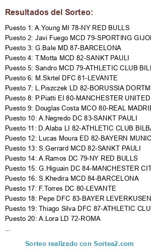 Lista de participantes: H.Bellerin LD 68-ROMA, J.Mascherano DFC 83-ROMA, G.Cahill DFC 81-ROMA, M.Yanga-Mbiwa DFC 77-ROMA, J.Gayà LI 76-ROMA, D.Blind MCD 79-ROMA, A.Hutchinson MCD 77-ROMA, S. Die MCD 72-ROMA, L.Bender MC 81-ROMA, R.Nainggolan MC 81-ROMA, R.Pereyra MCO 79-ROMA, R.Sterling MCO 80-ROMA, E.Lavezzi EI 79-ROMA, F.Anderson EI 78-ROMA, L.Messi SD 93-ROMA, D.Villa DC 80-ROMA, P.Dybala DC 77-ROMA, N.Clyne LD 76-BAYERN MUNICH, Sergio Ramos DFC 87-BAYERN MUNICH, N.Subotic DFC 81-BAYERN MUNICH, J.Mathieu DFC 80-BAYERN MUNICH, S.Radu LI 77-BAYERN MUNICH, J. Bernat LI 77-BAYERN MUNICH, S.Gerrard MCD 81-BAYERN MUNICH, J.McCarthy MCD 80-BAYERN MUNICH, F.Guarin MC 79-BAYERN MUNICH, M.Kovacic MC 76-BAYERN MUNICH, S.Kagawa MCO 82-BAYERN MUNICH, J.Draxler MI 80-BAYERN MUNICH, A.Young MI 78-BAYERN MUNICH, T.Walcott MD 80-BAYERN MUNICH, J.Cuadrado SD 82-BAYERN MUNICH, R.Lukaku DC 80-BAYERN MUNICH, A.Musa DC 75-BAYERN MUNICH, L.Piszczek LD 82-DORTMUND, Joao Pereira LD 75-DORTMUND, M.Schmelzer LI 78-DORTMUND, V.Kompany DFC 86-DORTMUND, G.Pique DFC 84-DORTMUND, J.Gimenez DFC 75-DORTMUND, P.Evra LI 79-DORTMUND, I. Gundogan MC 82-DORTMUND, Felipe Melo MCD 79-DORTMUND, S. Kehl MCD 78-DORTMUND, M.Fellaini MCD 77-DORTMUND, M. Gotze MCO 85-DORTMUND, Arda Turan MD 84-DORTMUND, Jesus Navas MD 81-DORTMUND, J.Iturbe ED 76-DORTMUND, C.Tevez DC 85-DORTMUND, W.Bony DC 81-DORTMUND, S.Aurier LD 77-CHELSEA, David Luiz DFC 83-CHELSEA, R.Varane DFC 81-CHELSEA, Marquinhos DFC 80-CHELSEA, Alex Sandro LI 78-CHELSEA, J.Zuñiga LI 74-CHELSEA, C.Kouyate MCD 72-CHELSEA, Fernandinho MC 81-CHELSEA, A.Witsel MC 80-CHELSEA, James Rodriguez MCO 86-CHELSEA, I.Rakitic MCO 83-CHELSEA, Koke MI 82-CHELSEA, Gervinho EI 81-CHELSEA, V.Ibarbo ED 78-CHELSEA, Diego Costa DC 85-CHELSEA, P.Aubameyang DC 81-CHELSEA, A.Ramos DC 78-CHELSEA, B.Ivanovic LD 81-DEPORTIVO LA CORUÑA, Danilo LD 79-DEPORTIVO LA CORUÑA, N.Otamendi DFC 83-DEPORTIVO LA CORUÑA, D.Alaba LI 83-DEPORTIVO LA CORUÑA, J.Alba LI 81-DEPORTIVO LA CORUÑA, S.Bender MCD 80-DEPORTIVO LA CORUÑA, A.Vidal MC 85-DEPORTIVO LA CORUÑA, C.Marchisio MC 83-DEPORTIVO LA CORUÑA, J.Pastore MC 81-DEPORTIVO LA CORUÑA, Enzo Perez MC 80-DEPORTIVO LA CORUÑA, K.De Bruyne MCO 85-DEPORTIVO LA CORUÑA, S.Lichtsteiner MD 77-DEPORTIVO LA CORUÑA, A.Schürrle MI 80-DEPORTIVO LA CORUÑA, I.Perisic MI 79-DEPORTIVO LA CORUÑA, K.Asamoah MI 79-DEPORTIVO LA CORUÑA, K.Volland MD 79-DEPORTIVO LA CORUÑA, L.Suarez DC 89-DEPORTIVO LA CORUÑA, M.Debuchy LD 80-LIVERPOOL, Maicon LD 79-LIVERPOOL, N.Vidic DFC 82-LIVERPOOL, M.Musacchio DFC 80-LIVERPOOL, D.Criscito LI 78-LIVERPOOL, A.Kolarov LI 78-LIVERPOOL, C.Erkin LI 75-LIVERPOOL, M.Valbuena MCO 81-LIVERPOOL, N.Fekir MCO 79-LIVERPOOL, N.Gaitan MI 83-LIVERPOOL, Cedrick M. MI 69-LIVERPOOL, J.Blaszczykowski MD 82-LIVERPOOL, M.Sow EI 79-LIVERPOOL, G.Töre ED 80-LIVERPOOL, S.Jovetic DC 81-LIVERPOOL, C.Bacca DC 81-LIVERPOOL, F.Arizala DC 68-LIVERPOOL, G.Van der Wiel LD 77-MANCHESTER CITY, M.Sakho DFC 80-MANCHESTER CITY, A.Laporte DFC 80-MANCHESTER CITY, T.Vermaelen DFC 79-MANCHESTER CITY, C.Ansaldi LI 77-MANCHESTER CITY, A.Song MCD 80-MANCHESTER CITY, G.Barry MCD 79-MANCHESTER CITY, S.Busquets MCD 85-MANCHESTER CITY, B.Matuidi MCD 83-MANCHESTER CITY, P.Coutinho MCO 82-MANCHESTER CITY, Aleix Vidal MD 76-MANCHESTER CITY, E.Hazard MI 88-MANCHESTER CITY, A.Sanchez EI 85-MANCHESTER CITY, A.Griezmann EI 82-MANCHESTER CITY, A.Ljajic EI 77-MANCHESTER CITY, S.Agüero DC 87-MANCHESTER CITY, M.Balotelli DC 80-MANCHESTER CITY, M.Richards LD 75-OPORTO, D.Agger DFC 80-OPORTO, M.Caceres DFC 80-OPORTO, K.Zouma DFC 75-OPORTO, N.Onuoha DFC 74-OPORTO, G.Clichy LI 78-OPORTO, A.Pirlo MC 83-OPORTO, K.P.Boateng MC 79-OPORTO, Hernanes MC 79-OPORTO, Douglas Costa MCO 80-OPORTO, Willian MD 82-OPORTO, K.Mirallas MI 80-OPORTO, A.Candreva ED 83-OPORTO, C.Tello ED 78-OPORTO, M. Depay EI 79-OPORTO, G.Rossi DC 82-OPORTO, Gio Dos Santos DC 82-OPORTO, S.Rondon DC 79-OPORTO, O.De Marcos LD 78-PSG, Sokratis P. DFC 82-PSG, N.Nkoulou DFC 79-PSG, A.Rudiger DFC 74-PSG, C.Azpilicueta LI 81-PSG, F.Coentrao LI 79-PSG, M.Gonalons MCD 81-PSG, J.Wilshere MC 81-PSG, Oscar MCO 84-PSG, W.Sneijder MCO 84-PSG, R.Cabella MCO 79-PSG, A.Correa MCO 75-PSG, A.McGeady MD 78-PSG, E.Vargas MD 76-PSG, Joazinho MI 78-PSG, Nani EI 82-PSG, A.Lacazette DC 82-PSG, A.Nyom LD 75-RAYO, S.Sarioglu LD 72-RAYO, M.Benatia DFC 84-RAYO, E.Mangala DFC 79-RAYO, M.Layun CAI 75-RAYO, Luiz Gustavo MCD 81-RAYO, C.Tiote MCD 78-RAYO, D.Payet MCO 81-RAYO, M.Boussoufa MCO 80-RAYO, Y.Bolasie MI 75-RAYO, J.Farfan MD 83-RAYO, Z.Tosic MD 78-RAYO, A.Townsend MD 74-RAYO, Pedro Rdgz. EI 83-RAYO, R.Lewandowski DC 87-RAYO, Welbeck DC 78-RAYO, M.Diouf DC 77-RAYO, B.Sagna LD 79-REAL MADRID, J.Estrada LD 68-REAL MADRID, Pepe DFC 83-REAL MADRID, Alex DFC 80-REAL MADRID, N.Asare DFC 71-REAL MADRID, B.Tremoulinas LI 78-REAL MADRID, A.Cole LI 76-REAL MADRID, Emmanuel Badu MCD 72-REAL MADRID, Thiago A. MC 81-REAL MADRID, Borja Valero MC 81-REAL MADRID, A.Di Maria MCO 85-REAL MADRID, Isco MCO 83-REAL MADRID, H.Mkhitaryan MCO 80-REAL MADRID, G.Wijnaldum MCO 78-REAL MADRID, C.Atsu EI 76-REAL MADRID, A.Robben ED 90-REAL MADRID, S.Doumbia DC 80-REAL MADRID, K.Walker LD 77-SHAKHTAR DONETSK, G.Chiellini DFC 84-SHAKHTAR DONETSK, L.Koscielny DFC 82-SHAKHTAR DONETSK, R.Fanni DFC 74-SHAKHTAR DONETSK, Kim Kwang Suk DFC 66-SHAKHTAR DONETSK, Filipe Luis LI 81-SHAKHTAR DONETSK, P.Lahm MCD 87-SHAKHTAR DONETSK, Ramires MCD 81-SHAKHTAR DONETSK, L.Fer MC 76-SHAKHTAR DONETSK, Y.Chikhaoui MCO 78-SHAKHTAR DONETSK, A.Maxim MCO 76-SHAKHTAR DONETSK, M.Reus MD 86-SHAKHTAR DONETSK, L.Markovic MD 78-SHAKHTAR DONETSK, Neymar Jr. EI 86-SHAKHTAR DONETSK, I. Williams EI 73-SHAKHTAR DONETSK, N. Oduamadi EI 66-SHAKHTAR DONETSK, Z. Ibrahimovic DC 89-SHAKHTAR DONETSK, Rafinha LD 77-SPORTING GIJON, J.Boateng DFC 87-SPORTING GIJON, A.Barzagli DFC 83-SPORTING GIJON, H.Badstuber DFC 80-SPORTING GIJON, Bruno Alves DFC 78-SPORTING GIJON, K.Ayhan DFC 68-SPORTING GIJON, R.Rodriguez LI 81-SPORTING GIJON, J.Mo
