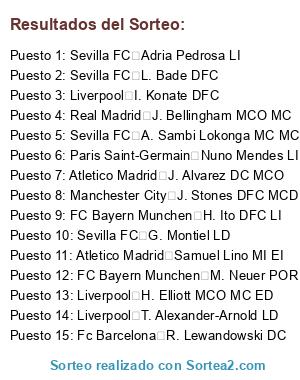 Lista de participantes: Manchester City Rodri MCD MC, Manchester City E. Haaland DC, Liverpool M. Salah MD ED, Manchester City K. De Bruyne MC MCO, FC Bayern Munchen H. Kane DC, Real Madrid K. Mbappe DC EI, Real Madrid J. Bellingham MCO MC, Fc Barcelona R. Lewandowski DC, Fc Barcelona M. ter Stegen POR, Liverpool V. van Dijk DFC, Real Madrid T. Courtois POR, Liverpool Alisson POR, Inter L. Martinez DC, Paris Saint-Germain L. Messi, Atletico Madrid J. Oblak POR, Atletico Madrid A. Griezmann DC MI, Real Madrid A. Rüdiger DFC, Real Madrid F. Valverde MC MD, Inter Y. Sommer POR, Manchester City Ederson POR, FC Bayern Munchen J. Kimmich MCD LD, Manchester City Ruben Dias DFC, FC Bayern Munchen J. Musiala MCO MI MC, Paris Saint-Germain Marquinhos DFC, Paris Saint-Germain G. Donnarumma POR, Inter N. Barella MC MCD, FC Bayern Munchen D. Rice, Manchester City Theo Bernard François Hernandez, Inter A. Bastoni DFC, Manchester City P. Foden ED EI MCO, Inter H. Çalhanoğlu MCD MC, Manchester City Bernardo Silva MC ED, Liverpool T. Alexander-Arnold LD, Juventus Bremer DFC, Fc Barcelona J. Kounde LD DFC, Atletico Madrid L. Modric MC MCO MCD, Real Madrid Carvajal LD, Paris Saint-Germain Heung-Min Son, Fc Barcelona F. de Jong MC MCD, Liverpool A. Mac Allister MC MCD, Fc Barcelona Pedri MC EI, Real Madrid Rodrygo ED DC, FC Bayern Munchen M. Neuer POR, Fc Barcelona W. Szczesny POR, Real Madrid Cristiano Ronaldo, Real Madrid D. Alaba DFC LI, Juventus Neymar Jr, FC Bayern Munchen Palhinha MCD MC, Liverpool L. Diaz MI EI, Fc Barcelona Raphinha ED EI MD, Paris Saint-Germain O. Dembele ED MCO, Liverpool Diogo Jota DC EI, Paris Saint-Germain A. Hakimi LD, Real Madrid eder Militao DFC, Real Madrid A. Tchouameni MCD MC DFC, Fc Barcelona Dani Olmo, Fc Barcelona R. Araujo DFC LD, Paris Saint-Germain Vitinha MC MCD, Atletico Madrid Nico Williams, Manchester City İ. Gündoğan MC MCD, Manchester City N. Ake DFC LI, Manchester City M. Akanji DFC, Liverpool I. Konate DFC, Atletico Madrid J. Alvarez DC MCO, Liverpool F. Acerbi DFC, Manchester City J. Stones DFC MCD LD, Inter B. Pavard DFC LD, FC Bayern Munchen K. Coman MI MD, Inter L. Sane MD MI ED, Inter F. Dimarco LI MI, Inter M. Thuram DC, Real Madrid J. Frimpong, Manchester City J. Gvardiol LI DFC, Juventus D. Vlahovic DC, FC Bayern Munchen M. Olise MD ED, FC Bayern Munchen K. Laimer LD MCD MC, FC Bayern Munchen D. Upamecano DFC, Juventus M. Locatelli MCD MC, Liverpool C. Gakpo MI EI DC, Fc Barcelona Lamine Yamal ED EI, Inter H. Mkhitaryan MC MCO, FC Bayern Munchen K. Koulibaly, Inter S. de Vrij DFC, Atletico Madrid Koke MCD MC, Liverpool A. Robertson LI, Paris Saint-Germain L. Hernandez DFC LI, Real Madrid F. Mendy LI, Atletico Madrid J. Gimenez DFC, Manchester City M. Kovačic MC MCD, Real Madrid R. De Paul MC MCD, Atletico Madrid Marcos Llorente MD LD MC, FC Bayern Munchen Kim Min Jae DFC, Juventus A. Christensen DFC MCD, Atletico Madrid R. Le Normand DFC, Manchester City F. Chiesa MD MI DC, Juventus T. Koopmeiners MC MCO, Juventus Douglas Luiz MC MCD, Atletico Madrid O. Marmoush, Inter K. Havertz, FC Bayern Munchen A. Davies LI MI, Paris Saint-Germain Nuno Mendes LI, Fc Barcelona Gavi MC EI, Real Madrid E. Camavinga MC MCD LI, Manchester City K. Walker LD, Juventus Danilo DFC LD, Liverpool D. Nuñez DC, Liverpool R. Gravenberch MCD MC, Fc Barcelona Balde LI LD MI, Paris Saint-Germain B. Barcola EI ED, Sevilla FC Iñigo Martinez DFC, Inter D. Dumfries LD MD, FC Bayern Munchen L. Goretzka MC MCD, Liverpool Iñaki Williams, Real Madrid S. Gnabry MD MI DC, Real Madrid J. Grealish EI MI, Atletico Madrid a. Correa DC MD, Atletico Madrid A. Sørloth DC, Atletico Madrid N. Molina LD, Fc Barcelona J. David, Fc Barcelona Savinho EI ED, Liverpool D. Szoboszlai MCO MC, Inter M. Darmian LD DFC MD, Manchester City S. Ortega POR, Inter P. Zieliński MC MCD, Juventus A. Milik DC, Real Madrid A. Lunin POR, Paris Saint-Germain R. Kolo Muani DC, Sevilla FC D. Frattesi MC MCO, Fc Barcelona F. Kadıoğlu, Paris Saint-Germain Joao Neves MC MCD, Liverpool W. Endo MCD MC, Juventus Marco Asensio ED DC MC, Juventus N. Gonzalez ED MD EI, Liverpool C. Jones MC MCO MCD, Paris Saint-Germain Gonçalo Ramos DC, Manchester City J. Doku EI ED, Atletico Madrid A. Witsel DFC, Sevilla FC N. Gudelj DFC MCD, Sevilla FC M. Taremi DC, Atletico Madrid Reinildo LI DFC, Sevilla FC Suso MD MCO MC, Sevilla FC J. Gomez DFC LD LI, Juventus M. Di Gregorio POR, Sevilla FC M. Rashford, Paris Saint-Germain W. Pacho DFC, Paris Saint-Germain W. Zaïre-Emery MC MCD, Liverpool C. Kelleher POR, Paris Saint-Germain Lee Kang In ED MCO DC, Inter M. Arnautovic DC, Juventus M. Perin POR, Atletico Madrid J. Musso POR, Inter M. Lazzari, Paris Saint-Germain P. Kimpembe DFC, Sevilla FC D. Lukebakio ED MD DC, FC Bayern Munchen S. Boey LD, FC Bayern Munchen H. Ito DFC LI, Atletico Madrid Samuel Lino MI EI, Fc Barcelona Eric Garcia DFC MCD LD, Paris Saint-Germain Fran Garcia LI, Juventus K. Thuram MC MCD, Juventus A. Cambiaso LD LI MD, Juventus P. Kalulu DFC LD, Sevilla FC Saul MC MI, Sevilla FC T. Werner, Inter C. Ejuke MI MD EI, Sevilla FC D. Sow MC MCD, Juventus F. Gatti DFC, Juventus W. McKennie MC MCD, Manchester City Matheus Nunes MC MI, Sevilla FC L. Bade DFC, Atletico Madrid Riquelme MI, FC Bayern Munchen Francisco Conceiçao MD ED, Liverpool H. Elliott MCO MC ED, Juventus Arthur MCD MC, Paris Saint-Germain M. Safonov POR, FC Bayern Munchen M. Tel DC MI MD, Inter Y. Bisseck DFC, Paris Saint-Germain Lucas Beraldo DFC LI, Sevilla FC D. Doue EI MC, Fc Barcelona Ansu Fati MCO MI DC, Atletico Madrid Pablo Barrios MC MCD, Fc Barcelona Fermin MC EI MCO, Sevilla FC Ø. Nyland POR, Sevilla FC G. Montiel LD, Sevilla FC Adria Pedrosa LI, FC Bayern Munchen A. Pavlovic MCD MC, Liverpool C. Bradley LD, Inter Josep Martinez POR, Sevilla FC A. Sambi Lokonga MC MCD, Fc Barcelona Pau Cubarsi DFC, Sevilla FC alvaro POR, Manchester City R. Vargas, Sevilla FC Carmona LD MD, Atletico Madrid G. Simeone DC MD MI, FC Bayern Munchen S. Ulreich 