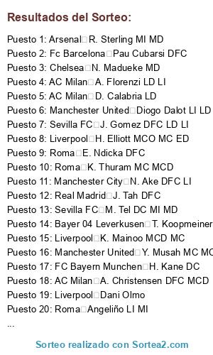 Lista de participantes: Real Madrid E. Haaland DC, Liverpool Rodri MCD MC, Roma M. Salah, Real Madrid J. Bellingham MCO MC, Real Madrid Vini Jr. EI DC, FC Bayern Munchen K. Mbappe DC EI, FC Bayern Munchen H. Kane DC, Manchester United K. De Bruyne MC MCO, Bayer 04 Leverkusen F. Wirtz MCO, Chelsea L. Martinez DC, Real Madrid T. Courtois POR, Chelsea V. van Dijk DFC, Manchester United R. Lewandowski DC, Fc Barcelona M. ter Stegen POR, Liverpool Alisson POR, Real Madrid F. Valverde MC MD, Manchester City C. Palmer MCO MD, Bayer 04 Leverkusen A. Rüdiger DFC, Arsenal B. Saka ED MD, Manchester City M.Odegaard MC, Manchester City P. Foden ED EI MCO, FC Bayern Munchen D. Rice, Manchester City Ruben Dias DFC, Manchester City Theo Bernard François Hernandez, Arsenal Gabriel DFC, Fc Barcelona J. Musiala MCO MI MC, Real Madrid J. Tah DFC, Manchester City Ederson POR, AC Milan M. Maignan POR, FC Bayern Munchen J. Kimmich MCD LD, Chelsea V. Osimhen, Real Madrid Rodrygo ED DC, Fc Barcelona Pedri MC EI, Manchester City A. Isak, Fc Barcelona J. Kounde LD DFC, Fc Barcelona F. de Jong MC MCD, Liverpool A. Mac Allister MC MCD, Liverpool T. Alexander-Arnold LD, Manchester City Bernardo Silva MC ED, Arsenal Bremer DFC, Manchester City Heung-Min Son, Bayer 04 Leverkusen Grimaldo MI LI, AC Milan P. Dybala MCO DC, Real Madrid Carvajal LD, Sevilla FC K. Benzema, Chelsea Nico Williams, Fc Barcelona Raphinha ED EI MD, AC Milan K. Kvaratskhelia, AC Milan Vitinha MC MCD, Fc Barcelona R. Araujo DFC LD, Real Madrid A. Tchouameni MCD MC DFC, Chelsea M. Caicedo MCD, Real Madrid eder Militao DFC, Roma L. Openda, Arsenal Bruno Guimaraes, Liverpool Dani Olmo, Liverpool L. Diaz MI EI, Liverpool Rafael Leao EI MI DC, Arsenal Joao Cancelo, Arsenal David Raya POR, Chelsea G. Mamardashvili, FC Bayern Munchen Palhinha MCD MC, Real Madrid D. Alaba DFC LI, AC Milan Cristiano Ronaldo, FC Bayern Munchen M. Neuer POR, Bayer 04 Leverkusen S. Tonali, FC BARCELONA J. Alvarez DC MCO, Real Madrid J. Frimpong, FC Bayern Munchen M. Olise MD ED, Manchester City J. Gvardiol LI DFC, FC Bayern Munchen L. Sane MD MI ED, Bayer 04 Leverkusen E. Palacios MC MCD, Liverpool I. Konate DFC, AC Milan C. Pulisic ED MD EI, Arsenal B. White LD, Arsenal Mikel Merino MC MCO, Manchester City M. Akanji DFC, Manchester City N. Ake DFC LI, AC Milan S. Guirassy DC, Manchester City J. Stones DFC MCD LD, Real Madrid K. Coman MI MD, Manchester United A. Onana POR, Manchester City İ. Gündoğan MC MCD, Roma M. Hummels DFC, Liverpool F. Acerbi DFC, Sevilla FC Iago Aspas, FC BARCELONA D. Kulusevski, Chelsea X. Simons, Fc Barcelona Lamine Yamal ED EI, Real Madrid E. Camavinga MC MCD LI, Roma C. Nkunku MCO DC, Liverpool C. Gakpo MI EI DC, Bayer 04 Leverkusen Pedro Porro, Arsenal T. Reijnders MC MCD MCO, Fc Barcelona B. Kamara MCD MC, FC Bayern Munchen A. Davies LI MI, Bayer 04 Leverkusen O. Marmoush, Manchester United M. de Ligt DFC, FC BARCELONA Marc Cucurella LI, AC Milan A. Christensen DFC MCD, Arsenal A. Dovbyk DC, Bayer 04 Leverkusen T. Koopmeiners MC MCO, FC Bayern Munchen D. Upamecano DFC, Manchester United L. Martinez DFC, Real Madrid R. De Paul MC MCD, Bayer 04 Leverkusen Aleix Garcia MC MCD, Arsenal L. Trossard EI DC, FC Bayern Munchen K. Laimer LD MCD MC, Real Madrid F. Mendy LI, Manchester City M. Kovačic MC MCD, FC Bayern Munchen Kim Min Jae DFC, Manchester United L. Torreira, FC Bayern Munchen F. Chiesa MD MI DC, Chelsea K. Koulibaly, Bayer 04 Leverkusen M. Sabitzer MC MCO MCD, Liverpool A. Robertson LI, Roma G. Mancini DFC, Bayer 04 Leverkusen R. Andrich MCD MC DFC, Bayer 04 Leverkusen L. Hradecký POR, Bayer 04 Leverkusen A. Gordon, Liverpool M. van de Ven, Arsenal Sancet, Arsenal M. Diaby, Manchester City M. Zaccagni, Fc Barcelona Savinho EI ED, Fc Barcelona Balde LI LD MI, AC Milan Brahim MCO ED EI, Chelsea E. Fernandez MC MCD, Fc Barcelona J. David, Liverpool R. Gravenberch MCD MC, Arsenal Gabriel Martinelli EI MI, Manchester United D. Nuñez DC, Arsenal P. Hincapie DFC LI, Chelsea R. James LD, Manchester United Diogo Dalot LI LD, Real Madrid A. Correa DC MD, AC Milan F. Tomori DFC, Sevilla FC L. Pellegrini MCO MC, Bayer 04 Leverkusen E. Tapsoba DFC, AC Milan J. Grealish EI MI, Manchester City K. Walker LD, Roma S. Gnabry MD MI DC, FC Bayern Munchen L. Goretzka MC MCD, Sevilla FC Iñigo Martinez DFC, Sevilla FC K. Mitoma, AC Milan A. Robinson, Liverpool B. Mbeumo, Sevilla FC D. Frattesi MC MCO, Liverpool D. Szoboszlai MCO MC, Chelsea Joao Felix MCO MI DC, Real Madrid A. Lunin POR, Manchester United A. Saint-Maximin, Sevilla FC R. Loftus-Cheek MC MCO, AC Milan Y. Fofana MCD MC, Manchester United N. Mazraoui LD LI, Manchester United Casemiro MCD MC, Arsenal Gabriel Jesus DC, Chelsea B. Henrichs, FC BARCELONA Jorginho MCD MC, Manchester City S. Ortega POR, Roma F. Kessié, Manchester City W. Zaïre-Emery MC MCD, Roma J. Doku EI ED, Chelsea M. Gusto LD, Liverpool C. Jones MC MCO MCD, Roma J. Timber LD LI DFC, AC Milan S. Chukwueze MD ED, Manchester United L. Shaw LI DFC, Sevilla FC Suso MD MCO MC, Arsenal Javi Galan LI MI, Sevilla FC J. Gomez DFC LD LI, Bayer 04 Leverkusen J. Hofmann MCO DC, Roma É. Mendy, Sevilla FC Mario Hermoso DFC, Sevilla FC M. Taremi DC, Sevilla FC D. Doue EI MC, Arsenal J. Musso POR, Manchester United Amad ED MCO MD, Chelsea L. Colwill DFC, Chelsea N. Madueke MD, Manchester City Samuel Lino MI EI, Chelsea Pedro Neto MD MI, AC Milan M. Thiaw DFC, Chelsea W. Fofana DFC, Bayer 04 Leverkusen D. Lukebakio ED MD DC, Roma E. Ndicka DFC, FC Bayern Munchen S. Boey LD, FC Bayern Munchen H. Ito DFC LI, AC Milan Robert Sanchez POR, Bayer 04 Leverkusen N. Mukiele LD DFC MD, AC Milan D. Calabria LD, Arsenal R. Sterling MI MD, Roma S. El Shaarawy MI EI MCO, Liverpool M. Perin POR, Sevilla FC F. Muslera, Chelsea Alejandro Garnacho EI MI MD, Liverpool H. Elliott MCO MC ED, Sevilla FC D. Sow MC MCD, Liverpool K. Mainoo MCD MC, Chelsea R. Lavia MCD MC, Manchester United M. Mount MC MCO, Fc Barcelona Eric Garcia DFC MCD LD, FC Bayern Munchen Franci