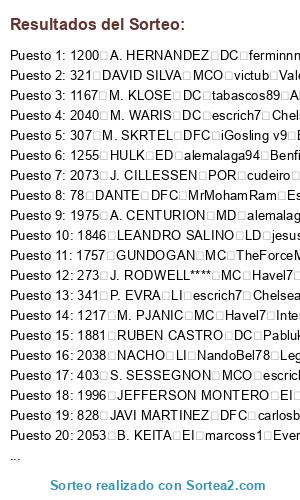 Lista de participantes: 1 K. TRAPP POR victub Valencia, 6 S. RIETHER LD Havel7 Inter de Milan, 7 L. PODOLSKI MI Havel7 Inter de Milan, 17 A. BECK LD SeaL KapO x Napoles, 18 I. VORSAH DFC ankhilion Celtic, 19 S. SALIHOVIC MC Xsamu Manchester United, 20 ROBERTO FIRMINO MCO Havel7 Inter de Milan, 21 C. OBASI MD merayombasogo Boca Juniors, 23 G. SIGUROSSON MCO adizero1drose Nacional, 24 V. IBISEVIC DC Crivi Llagostera, 25 R. ADLER POR Rikel09 Fiorentina, 26 G. CASTRO MC NandoBel78 Leganes, 27 O. TOPRAK DFC cudeiro B. Leverkusen, 28 S. REINARTZ MCD Xsamu Manchester United, 29 M. KADLEC LI marcoss1 Everton, 33 A. SCHURRLE MI MrMohamRam Espanyol, 35 S. KIEBLING DC cudeiro B. Leverkusen, 39 E. DERDIYOK SD x chachiquesi x Cordoba, 41 M. NEUER POR carlosbode10 Ath. Bilbao, 42 RAFINHA LD Pabluku1995 Ac Milan, 43 J. BOATENG DFC tabascos89 Albacete, 44 H. BADSTUBER DFC SSpecializeDD Manchester City, 45 P. LAHM MCD Crivi Llagostera, 47 B. SCHWEINSTEIGER MC SSpecializeDD manchester city, 48 A. ROBBEN MD marcoss1 Everton, 49 T. MULLER MD ulimoreno Juventus, 50 F. RIBERY MI tabascos89 Albacete, 51 M. GOMEZ DC Julitrosmartin Sp. Gijon, 54 A. TYMOSHCHUK MCD carlosbode10 Ath. Bilbao, 57 D. ALABA LI tabascos89 Albacete, 58 I. OLIC DC adizero1drose Nacional, 59 R. WEIDENFELLER POR perikinho90 Lugo, 61 N. SUBOTIC DFC adrylito Malaga, 62 M. HUMMELS DFC Xsamu Manchester United, 63 M. SCHMELZER LI alexfcbarcelona Recreativo, 64 S. BENDER MCD Lorenbetico Betis, 66 M. GOTZE MCO Rikel09 Fiorentina, 67 S. KAGAWA MCO SrPistolas86 Levante, 68 K. GROBKREUTZ LD SrPistolas86 Levante, 71 S. KEHL MCD cudeiro B. Leverkusen, 72 I. PERISIC MI cudeiro B. Leverkusen, 73 J. BLASZCZYKOWSKI MD adrylito Malaga, 74 R. LEWANDOWSKI DC adrylito Malaga, 78 DANTE DFC MrMohamRam Espanyol, 79 M. REUS MI NandoBel78 Leganes, 82 J. DROBNY POR angelitotabasco Bayern Munich, 83 H. WESTERMANN DFC x chachiquesi x Cordoba, 84 D. AOGO LI iGosling v9 Barcelona, 87 M. JANSEN LI TheForceMaker Alcorcon, 99 K. RAUSCH LI JulitrosMartin Sp. Gijon, 104 D. YA KONAN DC cudeiro B. Leverkusen, 108 B. HOWEDES DFC ulimoreno Juventus, 109 C. FUCHS LI lvaan Atco. Madrid, 111 L. HOLTBY MCO cruz88 B. Dortmund, 112 J. FARFAN MD adizero1drose Nacional, 114 K. HUNTELAAR DC carlosbode10 Ath. Bilbao, 116 JURADO MI Adriantr127 Arsenal, 120 J. JONES MCD cudeiro B. Leverkusen, 121 O. BAUMANN POR ferminnn Ajax, 123 P. CISSE DC Cometheaven79 Elche, 125 S. TASCI DFC Red Dutti Granada, 138 D. BENAGLIO POR iGosling v9 Barcelona, 141 M. SCHAFER LI Xsamu Manchester United, 145 M. MANDZUKIC DC Red Dutti Granada, 154 T. WIESE POR cudeiro B. Leverkusen, 155 SOKRATIS DFC Xsamu Manchester United, 156 NALDO DFC Crivi Llagostera, 158 A. HUNT MCO jesub Vitesse, 159 M. MARIN MCO cudeiro B. Leverkusen, 160 M. ARNAUTOVIC MI alemalaga94 Benfica, 161 C. PIZARRO DC JulitrosMartin Sp. Gijon, 170 X. SHAQIRI MD adrylito Malaga, 172 V. STOCKER MI pablotp48 Rayo Vallecano, 178 F. MUSLERA POR ulimoreno Juventus, 181 FELIPE MELO MCD MrMohamRam Espanyol, 183 T. HUBOCAN DFC jesus022 Granada, 184 E. EBOUE LD x chachiquesi x Cordoba, 186 RIERA LI adrylito Malaga, 193 V. TOROSIDIS LD iRandy v8 Liverpool, 195 K. PAPADOPOULOS DFC JulitrosMartin Sp. Gijon, 210 VIEIRINHA MD Xsamu Manchester United, 212 G. VAN DER WIEL LD javitr Psg, 214 J. VERTONGHEN DFC merayombasogo Boca Juniors, 219 M. EL HAMDAOUI DC lvaan Atco. Madrid, 223 D. TADIC MCO TATO XD Depor, 225 DOUGLAS DFC Jesub Vitesse, 227 L. DE JONG DC adizero1drose Nacional, 231 A. ISAKSSON POR misterserpico Sounders, 233 G. WIJNALDUM MCO TheForceMaker Alcorcon, 235 O. TOIVONEN DC SeaL KapO x Napoles, 236 J. LENS ED ulimoreno Juventus, 241 O. ASSAIDI MI jesus022 Villarreal, 244 P. CECH POR Saavexbox Las Palmas, 246 B. IVANOVIC LD cudeiro B. Leverkusen, 247 J. TERRY DFC SeaL KapO x Napoles, 248 A. COLE LI Jesub Vitesse, 250 RAUL MEIRELES MC pablotp48 Rayo Vallecano, 251 F. LAMPARD MC Crivi Llagostera, 252 D. STURRIDGE DC SSpecializeDD Manchester City, 253 D. DROGBA DC cruz88 B. Dortmund, 254 MATA MCO merayombasogo Boca Juniors, 256 DAVID LUIZ DFC sergiotabascos89 Real Madrid, 258 FERNANDO TORRES DC sergiotabascos89 Real Madrid, 260 J. MIKEL MCD Crivi Llagostera, 261 S. KALOU DC angelitotabasco Bayern Munich, 262 ALEX DFC jesus022 Villarreal, 264 R. LUKAKU DC victub Valencia, 265 M. ESSIEN MC adizero1drose Nacional, 266 T. HOWARD POR Xsamu Manchester United, 268 P. JAGIELKA DFC escrich7 Chelsea, 269 S. DISTIN DFC TATO XD Depor, 270 L. BAINES LI MrMohamRam Espanyol, 273 J. RODWELL**** MC Havel7 Inter de Milan, 278 D. BILYALETDINOV MI ankhilion Celtic, 279 P. POGBA MC adrylito Malaga, 284 B. HANGELAND DFC SSpecializeDD Manchester City, 289 C. DEMPSEY MP x chachiquesi x Cordoba, 293 B. RUIZ ED cudeiro Leverkusen, 294 M. DEMBELE MC sergiotabascos89 Real Madrid, 295 PEPE REINA POR alexfcbarcelona Recreativo, 296 M. KELLY LD merayombasogo Boca Juniors, 298 D. AGGER DFC Rikel09 Fiorentina, 300 J. HENDERSON MC escrich7 Chelsea, 301 S. GERRARD MCD pablotp48 Rayo Vallecano, 302 LUCAS LEIVA MCD JulitrosMartin Sp. Gijon, 305 L. SUAREZ DC Rikel09 Fiorentina, 307 M. SKRTEL DFC iGosling v9 Barcelona, 310 A. CARROLL DC lvaan Atco. Madrid, 312 G. JOHNSON LD merayombasogo Boca Juniors, 314 J. HART POR misterserpico Sounders, 315 M. RICHARDS LD sergiotabascos89 Real Madrid, 316 V. KOMPANY DFC merayombasogo Boca Juniors, 317 J. LESCOTT DFC victub Valencia, 318 G. CLICHY LI adrylito Malaga, 319 Y. TOURE MC ankhilion Celtic, 321 DAVID SILVA MCO victub Valencia, 322 S. NASRI MI Lorenbetico Betis, 323 S. AGÜERO DC perikinho90 Lugo, 324 C. TEVEZ DC x chachiquesi x Cordoba, 325 K. TOURE DFC JulitrosMartin Sp. Gijon, 326 N. DE JONG MCD Rikel09 Fiorentina, 327 J. MILNER MD Red Dutti Granada, 328 A. JOHNSON MD alexfcbarcelona Recreativo, 329 E. DZEKO DC adizero1drose Nacional, 330 M. BALOTELLI DC Pabluku1995 Ac Milan, 331 A. KOLAROV LI Crivi Llagostera, 332 P. ZABALETA LD escrich7 Chelsea, 333 N. ONUOHA DFC adizero1drose Nacional, 337 DE GEA POR MrMohamRam Espanyol, 338 C. SMALLING DFC x c