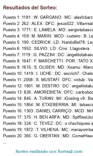 Lista de participantes: 41 M. NEUER POR carlosbode10 Ath. Bilbao, 43 J. BOATENG DFC tabascos89 Roma, 45 P. LAHM MCD Crivi Llagostera, 47 B. SCHWEINSTEIGER MC merayombasogo Boca Juniors, 48 A. ROBBEN MD Rikel09 Fiorentina, 49 T. MULLER MD ulimoreno Juventus, 50 F. RIBERY MI cometheaven79 elche, 51 M. GOMEZ DC javitr psg, 62 M. HUMMELS DFC Xsamu Manchester United, 66 M. GOTZE MCO misterserpico Sounders, 74 R. LEWANDOWSKI DC cruz88 Southend United, 79 M. REUS MI NandoBel78 Leganes, 112 J. FARFAN MD Pepitogrillo real Sociedad, 114 K. HUNTELAAR DC carlosbode10 Ath. Bilbao, 145 M. MANDZUKIC DC Red Dutti Granada, 244 P. CECH POR Havel7 Inter de Milan, 247 J. TERRY DFC SeaL KapO x Napoles, 252 D. STURRIDGE DC alemalaga94 Benfica, 254 MATA MCO angelitotabasco tottenham, 256 DAVID LUIZ DFC sergiotabascos89 Real Madrid, 262 ALEX DFC jesus022 Villarreal, 279 P. POGBA MC TheForceMaker Alcorcon, 301 S. GERRARD MCD jesusb Monaco, 305 L. SUAREZ DC Rikel09 Fiorentina, 316 V. KOMPANY DFC merayombasogo Boca Juniors, 319 Y. TOURE MC SpiffiestJose Celtic, 321 DAVID SILVA MCO iGosling v9 fcbarcelona, 322 S. NASRI MI Samue91 Betis, 323 S. AGÜERO DC perikinho90 Lugo, 324 C. TEVEZ DC x chachiquesi x Cordoba, 329 E. DZEKO DC adizero1drose America, 340 N. VIDIC DFC SSpecializeDD Manchester City, 346 W. ROONEY DC TheForceMaker alcorcon, 381 DIEGO COSTA DC buijin Atco. Madrid, 414 L. MODRIC MC adrylito Malaga, 415 G. BALE MD cudeiro B. Leverkusen, 467 P. MERTESACKER DFC pablotp48 B. Dortmund, 471 A. RAMSEY MC Rikel09 Fiorentina, 474 R. VAN PERSIE DC merayombasogo Boca Juniors, 584 OSCAR MCO marcoss1 Everton, 604 NEYMAR DC adrylito Malaga, 609 LUCAS ED adizero1drose America, 727 E. HAZARD MI tabascos89 Roma, 754 H. LLORIS POR javitr Psg, 828 JAVI MARTINEZ DFC carlosbode10 Ath. Bilbao, 844 FALCAO DC perikinho90 Lugo, 846 D. GODIN DFC ferminnn Ajax, 859 DANI ALVES LD merayombasogo Boca Juniors, 861 PIQUE DFC MrMohamRam Espanyol, 863 SERGIO BUSQUETS MCD Crivi Llagostera, 864 XAVI MC tabascos89 roma, 865 CESC FABREGAS MC Samue91 Betis, 866 INIESTA MC Saavexbox Las Palmas, 867 L. MESSI MP adrylito Malaga, 870 J. MASCHERANO MCD perikinho90 Lugo, 871 A. SANCHEZ ED sergiotabascos89 Real Madrid, 873 PEDRO EI iGosling v9 fcbarcelona, 897 J. TOULALAN MCD Saavexbox Las Palmas, 900 SANTI CAZORLA MI MrMohamRam Espanyol, 906 ISCO MCO misterserpico Sounders, 929 CASILLAS POR sergiotabascos89 Real Madrid, 930 SERGIO RAMOS DFC Rikel09 Fiorentina, 931 PEPE DFC carlosbode10 Ath. Bilbao, 934 XABI ALONSO MCD victub Valencia, 936 A. DI MARIA MCO ulimoreno Juventus, 937 CRISTIANO RONALDO EI TheForceMaker Alcorcon, 938 M. OZIL MCO Rikel09 Fiorentina, 939 K. BENZEMA DC Saavexbox Las Palmas, 943 G. HIGUAIN DC alemalaga94 Benfica, 944 S. KHEDIRA MCD Rikel09 Fiorentina, 971 JESUS NAVAS MD MrMohamRam Espanyol, 976 A. NEGREDO DC jesub Monaco, 979 I. RAKITIC MCO tabascos89 Roma, 1028 THIAGO SILVA DFC ferminnn Ajax, 1035 Z. IBRAHIMOVIC DC crivi Llagostera, 1075 A. CANDREVA ED javitr psg, 1118 W. SNEIJDER MCO NandoBel78 Leganes, 1122 T. MOTTA MCD jesus022 Villarreal, 1135 A. BARZAGLI DFC jesus022 Villarreal, 1136 G. CHIELLINI DFC perikinho90 Lugo, 1138 A. VIDAL MC alemalaga94 Benfica, 1184 E. LAVEZZI EI alemalaga94 Benfica, 1185 E. CAVANI DC victub Valencia, 1217 M. PJANIC MC Havel7 Inter de Milan, 1254 JOAO MOUTINHO MC NandoBel78 Leganes, 1255 HULK ED NandoBel78 Leganes, 1259 JAMES RODRIGUEZ MCO victub Valencia, 1277 E. GARAY DFC Saavexbox Las Palmas, 1426 J. CUADRADO MD ulimoreno Juventus, 1724 DE ROSSI MCD adrylito Malaga, 1729 PIRLO MC javicobarro Sp. Gijon, 1730 ERIKSEN MI Samue91 Betis, 1744 HAMSIK MCO Havel7 Inter de Milan, 1753 KROOS MC Pepitogrillo real Sociedad, 1757 GUNDOGAN MC crivi Llagostera, 1766 MARCHISIO MC adrylito Malaga, 1784 T. COURTOIS POR Adriantr127 Arsenal, 1795 M. BENATIA DFC Adriantr127 Arsenal, 1796 MIRANDA DFC adrylito Malaga, 1797 MATUIDI MCD iGosling v9 Barcelona.