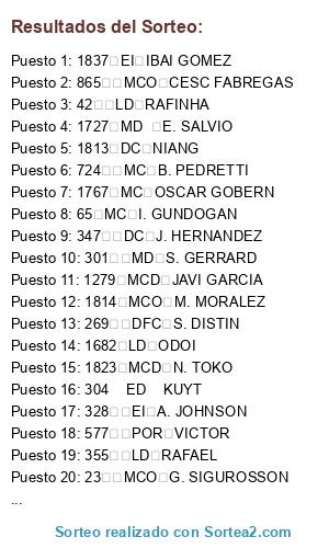 Lista de participantes: 345 EI A. YOUNG, 829 MCO ANDER HERRERA, 1500 POR B. GUZAN, 512 DC D. N'GOG, 747 MCD C. KABORE, 1499 LD L. YOUNG, 1005 POR DIEGO LOPEZ, 1504 MC F. DELPH, 1501 LD SERGIO SANCHEZ, 885 MI GAVILAN, 181 DFC FELIPE MELO, 814 DFC R. MARQUEZ, 452 DFC R. DUNNE, 46 MCD LUIZ GUSTAVO, 1505 MC J. LEDLEY, 927 DC R. SANTA CRUZ, 261 ED S. KALOU, 453 LI S. WARNOCK, 1502 DFC C. DAVIES, 1113 DFC W. SAMUEL, 395 POR C. GORDON, 21 DC C. OBASI, 321 MCO DAVID SILVA, 1184 EI E. LAVEZZI, 1701 POR RAFAEL, 116 MCO JURADO, 1539 LD M. ODDO, 1536 POR RICARDO, 704 MC J. PLASIL, 875 MI ADRIANO, 701 DFC M. CIANI, 796 ED J. PITROIPA, 333 LD N. ONUOHA, 1538 DFC G. NIEDERMEIER, 268 DFC P. JAGIELKA, 1535 DFC O. ONYEWU, 1540 MCD SIMAO, 1537 DFC L. N'DIAYE, 325 DFC K. TOURE, 687 DC A. BUKHAROV, 1063 MCO A. COSSU, 1546 DC BENJANI, 157 LD C. FRITZ, 1545 LI E. PIETERS, 1199 DC F. MICCOLI, 211 POR K. VERMEER, 1542 LD L. DE SILVESTRI, 844 DC FALCAO, 1243 POR S. ROMERO, 910 DC TAMUDO, 624 MI Y. ZHIRKOV, 667 MC D. DE ZEEUW, 61 DFC N. SUBOTIC, 173 DFC DAVID NAVARRO, 1297 ED JEFFREN, 1118 MCO W. SNEIJDER, 1544 MCD E. ENOH, 1238 DC A. DI NATALE, 297 DFC J. CARRAGHER, 1547 LD G. HOYTE, 1552 DC JO, 865 MCO CESC FABREGAS, 1554 MCO M. COUTADEUR, 1467 DC NINO, 1550 LI P. GILBERT, 1548 LD PEDRO SILVA, 1166 MCO S. MAURI, 153 DFC A. FRIEDRICH, 414 MCO L. MODRIC, 1149 DFC L. BONUCCI, 471 MC A. RAMSEY, 969 DFC J. ESCUDE, 1182 MI A. DOSSENA, 765 DFC J. MENSAH, 1503 MCD MOISES HURTADO, 857 POR RICARDO, 1549 MC M. RANDALL, 349 MC D. FLETCHER, 1215 MCD D. DE ROSSI, 294 DC M. DEMBELE, 327 MC J. MILNER, 1520 POR RAUL, 1519 LD S. WHITTAKER, 335 LI W. BRIDGE, 1126 DC D. MILITO, 600 MCO ELANO, 1257 EI VARELA, 54 MCD A. TYMOSHCHUK, 827 DFC MIKEL SAN JOSE, 1523 MC ORBAIZ, 1430 DFC S. PRODL, 742 MI A. AYEW, 1521 DFC AITOR OCIO, 1522 MD DE MARCOS, 949 MCD L. DIARRA, 317 DFC J. LESCOTT, 929 POR CASILLAS, 884 EI DIEGO CASTRO, 553 DC LIEDSON, 779 DC M. ERDINC, 1507 MCO MASSOUD, 1266 POR QUIM, 745 LD R. FANNI, 1047 LI T. TAIWO, 1106 DC ZE EDUARDO, 847 MC TIAGO, 931 DFC PEPE, 391 MCD W. PALACIOS, 843 ED REYES, 323 DC S. AGÜERO, 693 DFC A. COULIBALY, 967 DFC M. CACERES, 1314 ED C. DELGADO, 1020 DFC G. RODRIGUEZ, 402 MI K. RICHARDSON, 172 MI V. STOCKER, 31 MCD S. ROLFES, 216 MCO C. ERIKSEN, 1611 DC BUENO, 1469 DC C. VELA, 1468 LD D. SCHWAAB, 192 DC F. CAVENAGHI, 29 LI M. KADLEC, 420 MC T. HUDDLESTONE, 1471 MCO S. FEGHOULI, 361 POR T. KRUL, 370 LI D. SANTON, 404 DC N. BENDTNER, 225 DFC DOUGLAS, 28 DFC S. REINARTZ, 1292 LI H. BEDIMO, 1229 MC G. D'AGOSTINO, 1082 POR A. BORUC, 1612 ED D. BISESWAR, 456 DC G. AGBONLAHOR, 1610 MC N. MATIC, 51 DC M. GOMEZ, 1470 MCD L. SINKIEWICZ, 1527 LD C. LELL, 311 LI FABIO AURELIO, 730 DC I. JELEN, 396 LD J. O'SHEA, 973 MCO P. TROCHOWSKI, 1526 POR T. KRAFT, 41 POR M. NEUER, 280 DC V. ANICHEBE, 1285 DC J. SAVIOLA, 776 MI NENE, 677 DFC N. LOMBAERTS, 531 MCD S. KARA, 53 DFC D. VAN BUYTEN, 799 MCD E. CAPOUE, 460 MC J. JENAS, 1525 DFC MARIO, 1367 ED Y. GOUFFRAN, 746 DC A. GIGNAC, 1345 MCD PUÑAL, 1553 EI A. DRIVER, 1114 LD MAICON, 1140 MD M. KRASIC, 410 DFC M. DAWSON, 1360 MCO ALFARO, 1358 LI C. RODRIGUEZ, 886 MCO CARLOS MARTINS, 1355 POR CODINA, 285 LI J. RIISE, 1356 LD M. CHALME, 640 POR I. AKINFEEV, 1167 DC M. KLOSE, 1551 LI A. TRAORE, 1581 DC F. CAMPBELL, 45 LD P. LAHM, 638 DC T. NECID, 1299 EI DIEGO CAPEL, 972 MCD G. MEDEL, 1354 DFC G. PALETTA, 1359 ED C. CHAVEZ, 1357 DFC A. MADLUNG, 383 DFC J. WOODGATE, 407 POR B. FRIEDEL, 1153 DC L. TONI, 1362 POR M. ZIEGLER, 1165 MCO HERNANES, 1364 MCO Z. JUNUZOVIC, 1365 LI PAREDES, 6 LD S. RIETHER, 75 DC M. ZIDAN, 1162 MC C. LEDESMA, 1449 LD NELSON, 679 MCD I. DENISOV, 915 MC JAVI MARQUEZ, 566 DFC ALEX SILVA, 582 MC TINGA, 656 MC C. NOBOA, 1283 DC O. CARDOZO, 1363 MC O. ENGELAAR, 1361 MC A. DA SILVA, 503 DFC G. CAHILL, 1034 DC A. CASSANO, 1628 LI C. M'BENGUE, 1141 MI E. ELIA, 177 MCO J. RIQUELME, 227 DC L. DE JONG, 584 MCO OSCAR, 808 POR U. RAME, 35 DC S. KIEBLING, 1324 DC A. STOKES, 266 POR T. HOWARD, 1006 DFC C. ZAPATA, 316 DFC V. KOMPANY, 1062 MC R. NAINGGOLAN, 287 MC S. SIDWELL, 913 MCD BAENA, 9 MCD O. AHMEDOV, 1164 DC D. CISSE, 129 MCD Z. KUZMANOVIC, 1560 DC A. KONE, 1366 DFC L. RINAUDO, 896 ED JOAQUIN, 237 DC T. MATAVZ, 786 MI B. SAKO, 889 ED Y. MOLLO, 1341 MCO A. LJAJIC, 990 ED PABLO HERNANDEZ, 722 MCD R. MAVUBA, 1384 DC ARANDA, 324 DC C. TEVEZ, 1017 MCO CAMUÑAS, 734 LD AZPILICUETA, 1 POR K. TRAPP, 777 DC K. GAMEIRO, 408 LD K. WALKER, 1383 MCO S. HOFMANN, 1161 LI S. RADU, 920 DC W. PANDIANI, 34 MCO RENATO AUGUSTO, 1564 DC DIOGO, 1230 POR S. HANDANOVIC, 1226 MD TADDEI, 695 MCD D. NDINGA, 1382 DFC HENRIQUE, 1381 DFC MIGUEL FLAÑO, 631 MC P. MAMAEV, 594 EI LUAN, 1122 MCD T. MOTTA, 1176 DFC H. CAMPAGNARO, 1002 DC ADURIZ, 1374 MD D. SALPINGIDIS, 161 DC C. PIZARRO, 93 MCD G. KACAR, 1284 POR EDUARDO, 1372 LI GARRIDO, 1375 DC GUIZA, 165 LI M. SILVESTRE, 813 DC R. KEANE, 1177 DFC P. CANNAVARO, 382 DFC R. SHAWCROSS, 210 MCO VIEIRINHA, 319 MC Y. TOURE, 925 EI G. CASTRO, 1048 DFC D. BONERA, 1373 MC RICARDO, 417 DC E. ADEBAYOR, 470 MCD A. SONG, 735 DFC S. DIAWARA, 374 DC D. BA, 248 LI A. COLE, 632 MCO A. DZAGOEV, 862 LI E. ABIDAL, 255 POR HILARIO, 1473 DC JONATHAN PEREIRA, 111 MCO L. HOLTBY, 1621 POR S. LOACH, 193 LD V. TOROSIDIS, 938 MCO M. OZIL, 760 DC J. BRIAND, 1133 POR G. BUFFON, 64 MCD S. BENDER, 689 MD V. BYSTROV, 437 MC G. DORRANS, 346 DC W. ROONEY, 68 MI K. GROBKREUTZ, 1119 DC G. PAZZINI, 1472 MC L. BOWYER, 1620 DFC M. MANCIENNE, 1622 DFC S. BELL, 1349 DC L. KOZAK, 509 MCO M. DAVIES, 296 LD M. KELLY, 343 MCO T. CLEVERLEY, 326 MCD N. DE JONG, 739 MCD B. CHEYROU, 231 POR A. ISAKSSON, 291 DC A. JOHNSON, 466 LD B. SAGNA, 1252 LI A. PEREIRA, 457 DC D. BENT, 652 DC F. CAICEDO, 1512 DC J. VAUGHAN, 839 LI FILIPE, 1511 LD T. HIBBERT, 1174 POR JULIO SERGIO, 548 DFC CHICAO, 5 DFC GEROMEL, 1011 MD CANI, 549 MC PAULINHO, 850 DFC MIRANDA, 1513 MC S. BATTAGLIA, 278 MI D. BILYALETDINOV, 676 DFC BRUNO ALVES, 118 MCO A. BAUMJOHANN, 937 EI CRISTIANO RONALDO, 627 DC DIEGO TARDELLI, 1218 DC F.