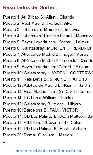 Lista de participantes: Barcelona Noah Darvich, Barcelona JONATHAN TAH, Barcelona Rafael Leao, Barcelona Marcos (MARQUINHOS) Aoás Corrêa, Barcelona MOISE BIOTY KEAN, Barcelona ARDA GULER, Barcelona JAN VIRGILI, Barcelona ANTONEE ROBINSON, Barcelona JOAO CANCELO, Barcelona Martin Odegaard, Barcelona Khvicha Kvaratskhelia, Barcelona Cole Palmer, Barcelona Ferdi Erenay Kadıoğlu, Barcelona JUNIOR LUKEBA, Barcelona UNAI SIMON, Barcelona YASER ASPRILLA MARTINEZ, Barcelona ALEXANDER ISSAK, Barcelona ALEX REMIRO, Barcelona FELIX KALU NMECHA, Barcelona NICOLO ROVELLA, Barcelona JOAO FELIX, Barcelona Jules Kounde, Barcelona MARIO GILA FUENTES, Barcelona Ibraima Konate, Barcelona LANDRY CEPHAS FARRE MIRO, Barcelona B Marc Bernal, Barcelona B DIVIN MUBAMA, Barcelona B MIKAYIL FAYE, Barcelona B FRANCESCO CAMARDA, Barcelona B TYRIQUE GEORGE, Barcelona B MARC CASADO, Barcelona B Nnamdi Collins, Barcelona B Bryan Okoh, Barcelona B JULIAN HETTWER, Barcelona B PAU VICTOR, Barcelona B Héctor Fort García, Barcelona B KENAN YILDIZ, Barcelona B omar el hilali, Barcelona B PABLO TORRE, Barcelona B JAHMAI SIMPSON-PUSEY, Barcelona B GERARD MARTIN, Barcelona B NICO O´REILLY, Barcelona B MAXIMO PERRONE, Barcelona B RENATO MARIN, Barcelona B Fran González, Barcelona B Arnau Tenas, Atlético de Madrid Lutsharel Geertruida, Atlético de Madrid João Pedro Gonçalves Neves, Atlético de Madrid Tyronne Ebuehi, Atlético de Madrid Vítor (VITINHA) Machado Ferreira, Atlético de Madrid Lukas Hrádecky, Atlético de Madrid KARIM ADEYEMI, Atlético de Madrid Marcus Rashford, Atlético de Madrid Thierry Correia, Atlético de Madrid kevin danso, Atlético de Madrid JULIAN ALVAREZ, Atlético de Madrid Ousmane Dembele, Atlético de Madrid WARREM ZAÏRE EMERY, Atlético de Madrid WILFRIED STEPHANE SINGO, Atlético de Madrid ALEJANDRO Baena Rodríguez, Atlético de Madrid MOHAMED KUDUS, Atlético de Madrid KONSTANTINOS KOULIERAKIS, Atlético de Madrid JOHAN MOJICA, Atlético de Madrid ALEJANDRO GARNACHO, Atlético de Madrid Gregor Kobel, Atlético de Madrid GIORGIO SCALVINI, Atlético de Madrid FRANCISCO CONCEICAO, Atlético de Madrid MAX DOWMAN, Atlético de Madrid Marcos Llorente, Atlético de Madrid B James Beadle, Atlético de Madrid B Devyne Rensch, Atlético de Madrid B MIKA GODTS, Atlético de Madrid B Tiago Morais, Atlético de Madrid B Leopold Querfeld, Atlético de Madrid B Kian Fitz-Jim, Atlético de Madrid B Elias Jelert Kristensen, Atlético de Madrid B Ernest Poku, Atlético de Madrid B FABIO MIRETTI, Atlético de Madrid B carlos forbs, Atlético de Madrid B FESTY EBOSELE, Atlético de Madrid B ROGER FERNANDES, Atlético de Madrid B RENATO DE PALMA VEIGA, Atlético de Madrid B maarten vandevoordt, Atlético de Madrid B YANKUBA MINTEH, Atlético de Madrid B LUCA WARRICK KOLEOSHO, Atlético de Madrid B Tygo Land, Atlético de Madrid B Alejandro Francés, Atlético de Madrid B KRISTIAN HLYNSSON, Atlético de Madrid B MATEUS FERNANDES, Atlético de Madrid B FORSON AMANKWAH, Atlético de Madrid B Valentin Atangana Edoa, Atlético de Madrid B Konstantinos Karetsas, Atlético de Madrid B youssoufa moukoko, Bayer Leverkusen Kerian Trippier, Bayer Leverkusen Yuossef En-Nesiry, Bayer Leverkusen Michael Olise, Bayer Leverkusen Cristian Romero, Bayer Leverkusen Marcos Acuña, Bayer Leverkusen David Hancko, Bayer Leverkusen Manuel Akanji, Bayer Leverkusen Davide Frattesi, Bayer Leverkusen Gerard Moreno, Bayer Leverkusen Israel Reyes, Bayer Leverkusen Hugo Lloris, Bayer Leverkusen Pedro Goncalvez, Bayer Leverkusen Damian Emiliano Martínez, Bayer Leverkusen Ciro Immobile, Bayer Leverkusen Orkun Kokcu, Bayer Leverkusen Iago Aspas, Bayer Leverkusen Mattia Zaccagni, Bayer Leverkusen Domenico Berardi, Bayer Leverkusen Federico Dimarco, Bayer Leverkusen Konrad Laimer, Bayer Leverkusen Takefusa Kubo, Galatasaray lucas torreira, Galatasaray Iñaki Williams, Galatasaray Filip Kostic, Galatasaray GEORGES KEVIN NKOUDOU, Galatasaray GIOVANNI DI LORENZO, Galatasaray kevin De Bruyne, Galatasaray MORTEN FRENDRUP, Galatasaray sergiño dest, Galatasaray Joe Gomez, Galatasaray BRIAN BROBBEY, Galatasaray serge david Gnabry, Galatasaray David alaba, Galatasaray Heung-min Son, Galatasaray ANSU FATI, Galatasaray Jérémy Doku, Galatasaray Edon Zhegrova, Galatasaray JAYDEN OOSTERWOLDE, Galatasaray Allan Saint Maximin, Galatasaray Aaron Wan-Bissaka, Galatasaray Gabriel martinelli, Galatasaray Luiz junior, Galatasaray Marc-André TER STEGEN, Galatasaray BRENNAN JOHNSON, Galatasaray Moïse Bombito Lumpungu, Galatasaray Fran garcia, Galatasaray B Ethan Mbappé, Galatasaray B Thiago cruz fernandez, Galatasaray B Samuel Elias Dahl, Galatasaray B Mees Hilgers, Galatasaray B Abdallah Dipo Sima, Galatasaray B Andrew Abiola Omobamidele, Galatasaray B Christopher bonsu baah, Galatasaray B john tolkin, Galatasaray B Rodrigo Jhossel Huescas Hurtado, Galatasaray B Ange-Yoan Bonny, Galatasaray B Sampson Dweh, Galatasaray B liel abada, Galatasaray B Chemsdine Talbi, Galatasaray B Diogo Martins Travassos, Galatasaray B Jonothan Rowe, Galatasaray B Antonín Kinský, Galatasaray B Kaio cesar andrade lima, Galatasaray B Enzo Gianni Tchato Mbiayi, Galatasaray B Matthieu luka epolo, Roma Oliver Baumann, Roma Stefan Ortega Moreno, Roma Stefan Posch, Roma Carlos Álvarez, Roma Gianluca Mancini, Roma Jon Martín, Roma ANTOINE GRIEZMANN, Roma Jose Luís (Pepelu) García Vayá, Roma Denis Athanase Bouanga, Roma Jon Tollar Moncayola, Roma Henrikh Mkhitaryan, Roma Roger Ibañez, Roma Rayan Cherki, Roma Yuri Izeta Berchiche, Roma Adrián Liso Lahoz, Roma Karim Benzema, Roma ANTONIO JOAO TAVARES SILVA, Roma Chidera Ejuke, Roma Diogo Jota, Roma Thomas partey, Roma Javier Galán Gil, Roma Isaac "Isi" Palazón Camacho, Roma Pablo Maffeo, RC Lens Maximiliam Beier, RC Lens Adam Arvelo, RC Lens Joan García Pons, RC Lens Isamel Bennacer, RC Lens Pedro (pedri) Gonzales, RC Lens WOJCIECH TOMASZ SZCZESNY, RC Lens Amara Diouf, RC Lens DENIS ZAKARIA, RC Lens Temitayo Olufisayo Olaolu