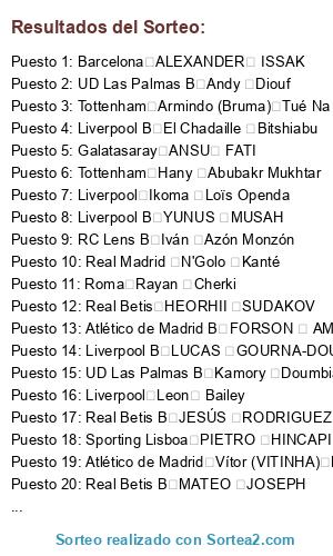 Lista de participantes: Barcelona Noah Darvich, Barcelona JONATHAN TAH, Barcelona Rafael Leao, Barcelona Marcos (MARQUINHOS) Aoás Corrêa, Barcelona MOISE BIOTY KEAN, Barcelona ARDA GULER, Barcelona JAN VIRGILI, Barcelona ANTONEE ROBINSON, Barcelona JOAO CANCELO, Barcelona Martin Odegaard, Barcelona Khvicha Kvaratskhelia, Barcelona Cole Palmer, Barcelona Ferdi Erenay Kadıoğlu, Barcelona JUNIOR LUKEBA, Barcelona UNAI SIMON, Barcelona YASER ASPRILLA MARTINEZ, Barcelona ALEXANDER ISSAK, Barcelona ALEX REMIRO, Barcelona FELIX KALU NMECHA, Barcelona NICOLO ROVELLA, Barcelona JOAO FELIX, Barcelona Jules Kounde, Barcelona MARIO GILA FUENTES, Barcelona Ibraima Konate, Barcelona LANDRY CEPHAS FARRE MIRO, Barcelona B Marc Bernal, Barcelona B DIVIN MUBAMA, Barcelona B MIKAYIL FAYE, Barcelona B FRANCESCO CAMARDA, Barcelona B TYRIQUE GEORGE, Barcelona B MARC CASADO, Barcelona B Nnamdi Collins, Barcelona B Bryan Okoh, Barcelona B JULIAN HETTWER, Barcelona B PAU VICTOR, Barcelona B Héctor Fort García, Barcelona B KENAN YILDIZ, Barcelona B omar el hilali, Barcelona B PABLO TORRE, Barcelona B JAHMAI SIMPSON-PUSEY, Barcelona B GERARD MARTIN, Barcelona B NICO O´REILLY, Barcelona B MAXIMO PERRONE, Barcelona B RENATO MARIN, Barcelona B Fran González, Barcelona B Arnau Tenas, Atlético de Madrid Lutsharel Geertruida, Atlético de Madrid João Pedro Gonçalves Neves, Atlético de Madrid Tyronne Ebuehi, Atlético de Madrid Vítor (VITINHA) Machado Ferreira, Atlético de Madrid Lukas Hrádecky, Atlético de Madrid KARIM ADEYEMI, Atlético de Madrid Marcus Rashford, Atlético de Madrid Thierry Correia, Atlético de Madrid kevin danso, Atlético de Madrid JULIAN ALVAREZ, Atlético de Madrid Ousmane Dembele, Atlético de Madrid WARREM ZAÏRE EMERY, Atlético de Madrid WILFRIED STEPHANE SINGO, Atlético de Madrid ALEJANDRO Baena Rodríguez, Atlético de Madrid MOHAMED KUDUS, Atlético de Madrid KONSTANTINOS KOULIERAKIS, Atlético de Madrid JOHAN MOJICA, Atlético de Madrid ALEJANDRO GARNACHO, Atlético de Madrid Gregor Kobel, Atlético de Madrid GIORGIO SCALVINI, Atlético de Madrid FRANCISCO CONCEICAO, Atlético de Madrid MAX DOWMAN, Atlético de Madrid Marcos Llorente, Atlético de Madrid B James Beadle, Atlético de Madrid B Devyne Rensch, Atlético de Madrid B MIKA GODTS, Atlético de Madrid B Tiago Morais, Atlético de Madrid B Leopold Querfeld, Atlético de Madrid B Kian Fitz-Jim, Atlético de Madrid B Elias Jelert Kristensen, Atlético de Madrid B Ernest Poku, Atlético de Madrid B FABIO MIRETTI, Atlético de Madrid B carlos forbs, Atlético de Madrid B FESTY EBOSELE, Atlético de Madrid B ROGER FERNANDES, Atlético de Madrid B RENATO DE PALMA VEIGA, Atlético de Madrid B maarten vandevoordt, Atlético de Madrid B YANKUBA MINTEH, Atlético de Madrid B LUCA WARRICK KOLEOSHO, Atlético de Madrid B Tygo Land, Atlético de Madrid B Alejandro Francés, Atlético de Madrid B KRISTIAN HLYNSSON, Atlético de Madrid B MATEUS FERNANDES, Atlético de Madrid B FORSON AMANKWAH, Atlético de Madrid B Valentin Atangana Edoa, Atlético de Madrid B Konstantinos Karetsas, Atlético de Madrid B youssoufa moukoko, Bayer Leverkusen Kerian Trippier, Bayer Leverkusen Yuossef En-Nesiry, Bayer Leverkusen Michael Olise, Bayer Leverkusen Cristian Romero, Bayer Leverkusen Marcos Acuña, Bayer Leverkusen David Hancko, Bayer Leverkusen Manuel Akanji, Bayer Leverkusen Davide Frattesi, Bayer Leverkusen Gerard Moreno, Bayer Leverkusen Israel Reyes, Bayer Leverkusen Hugo Lloris, Bayer Leverkusen Pedro Goncalvez, Bayer Leverkusen Damian Emiliano Martínez, Bayer Leverkusen Ciro Immobile, Bayer Leverkusen Orkun Kokcu, Bayer Leverkusen Iago Aspas, Bayer Leverkusen Mattia Zaccagni, Bayer Leverkusen Domenico Berardi, Bayer Leverkusen Federico Dimarco, Bayer Leverkusen Konrad Laimer, Bayer Leverkusen Takefusa Kubo, Galatasaray lucas torreira, Galatasaray Iñaki Williams, Galatasaray Filip Kostic, Galatasaray GEORGES KEVIN NKOUDOU, Galatasaray GIOVANNI DI LORENZO, Galatasaray kevin De Bruyne, Galatasaray MORTEN FRENDRUP, Galatasaray sergiño dest, Galatasaray Joe Gomez, Galatasaray BRIAN BROBBEY, Galatasaray serge david Gnabry, Galatasaray David alaba, Galatasaray Heung-min Son, Galatasaray ANSU FATI, Galatasaray Jérémy Doku, Galatasaray Edon Zhegrova, Galatasaray JAYDEN OOSTERWOLDE, Galatasaray Allan Saint Maximin, Galatasaray Aaron Wan-Bissaka, Galatasaray Gabriel martinelli, Galatasaray Luiz junior, Galatasaray Marc-André TER STEGEN, Galatasaray BRENNAN JOHNSON, Galatasaray Moïse Bombito Lumpungu, Galatasaray Fran garcia, Galatasaray B Ethan Mbappé, Galatasaray B Thiago cruz fernandez, Galatasaray B Samuel Elias Dahl, Galatasaray B Mees Hilgers, Galatasaray B Abdallah Dipo Sima, Galatasaray B Andrew Abiola Omobamidele, Galatasaray B Christopher bonsu baah, Galatasaray B john tolkin, Galatasaray B Rodrigo Jhossel Huescas Hurtado, Galatasaray B Ange-Yoan Bonny, Galatasaray B Sampson Dweh, Galatasaray B liel abada, Galatasaray B Chemsdine Talbi, Galatasaray B Diogo Martins Travassos, Galatasaray B Jonothan Rowe, Galatasaray B Antonín Kinský, Galatasaray B Kaio cesar andrade lima, Galatasaray B Enzo Gianni Tchato Mbiayi, Galatasaray B Matthieu luka epolo, Roma Oliver Baumann, Roma Stefan Ortega Moreno, Roma Stefan Posch, Roma Carlos Álvarez, Roma Gianluca Mancini, Roma Jon Martín, Roma ANTOINE GRIEZMANN, Roma Jose Luís (Pepelu) García Vayá, Roma Denis Athanase Bouanga, Roma Jon Tollar Moncayola, Roma Henrikh Mkhitaryan, Roma Roger Ibañez, Roma Rayan Cherki, Roma Yuri Izeta Berchiche, Roma Adrián Liso Lahoz, Roma Karim Benzema, Roma ANTONIO JOAO TAVARES SILVA, Roma Chidera Ejuke, Roma Diogo Jota, Roma Thomas partey, Roma Javier Galán Gil, Roma Isaac "Isi" Palazón Camacho, Roma Pablo Maffeo, RC Lens Maximiliam Beier, RC Lens Adam Arvelo, RC Lens Joan García Pons, RC Lens Isamel Bennacer, RC Lens Pedro (pedri) Gonzales, RC Lens WOJCIECH TOMASZ SZCZESNY, RC Lens Amara Diouf, RC Lens DENIS ZAKARIA, RC Lens Temitayo Olufisayo Olaolu