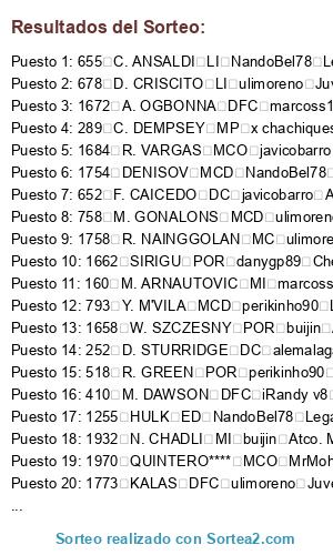 Lista de participantes: 9 Y. BRAHIMI EI pablotp48 B. Dortmund, 26 G. CASTRO MC javicobarro Ac Milan, 29 M. KADLEC LI marcoss1 Everton, 33 A. SCHURRLE MI MrMohamRam Espanyol, 37 G. TORE MI NandoBel78 Leganes, 39 E. DERDIYOK SD x chachiquesi x Cordoba, 41 M. NEUER POR carlosbode10 Ath. Bilbao, 42 RAFINHA LD javicobarro Ac Milan, 44 H. BADSTUBER DFC SSpecializeDD Manchester City, 49 T. MULLER MD ulimoreno Juventus, 54 A. TYMOSHCHUK MCD carlosbode10 Ath. Bilbao, 59 R. WEIDENFELLER POR perikinho90 Lugo, 68 K. GROBKREUTZ LD MrMohamRam Espanyol, 78 DANTE DFC MrMohamRam Espanyol, 79 M. REUS MI NandoBel78 Leganes, 83 H. WESTERMANN DFC marcoss1 Everton, 87 M. JANSEN LI ivanshaman987 Sp. Gijon, 99 K. RAUSCH LI ivanshaman987 Sp. Gijon, 100 E. DURM LI iRandy v8 Liverpool, 103 K. KOULIBALY DFC marcoss1 Everton, 108 B. HOWEDES DFC ulimoreno Juventus, 109 C. FUCHS LI buijin Atco. Madrid, 114 K. HUNTELAAR DC carlosbode10 Ath. Bilbao, 117 CHUOPO-MOTING DC alemalaga94 Benfica, 119 J. McCARTHY MCD jesus022 Villarreal, 130 T. WERNER MD javicobarro Ac Milan, 142 T. KONGOLO DFC x chachiquesi x Cordoba, 160 M. ARNAUTOVIC MI marcoss1 Everton, 161 C. PIZARRO DC ivanshaman987 Sp. Gijon, 169 D. TARASOV MCD jesus022 Villarreal, 172 V. STOCKER MI pablotp48 B. Dortmund, 178 F. MUSLERA POR ulimoreno Juventus, 181 FELIPE MELO MCD MrMohamRam Espanyol, 183 T. HUBOCAN DFC jesus022 Granada, 184 E. EBOUE LD x chachiquesi x Cordoba, 187 JORGINHO MC MrMohamRam Espanyol, 188 L. STINDL MCO perikinho90 Lugo, 190 CEDRICK LD NandoBel78 Leganes, 193 V. TOROSIDIS LD iRandy v8 Liverpool, 195 K. PAPADOPOULOS DFC ivanshaman987 Sp. Gijon, 198 RAFA EI ulimoreno Juventus, 219 M. EL HAMDAOUI DC buijin Atco. Madrid, 241 O. ASSAIDI MI jesus022 Villarreal, 250 RAUL MEIRELES MC pablotp48 B. Dortmund, 252 D. STURRIDGE DC alemalaga94 Benfica, 262 ALEX DFC jesus022 Villarreal, 264 R. LUKAKU DC marcoss1 Everton, 268 P. JAGIELKA DFC danygp89 Chelsea, 284 B. HANGELAND DFC SSpecializeDD Manchester City, 289 C. DEMPSEY MP x chachiquesi x Cordoba, 300 J. HENDERSON MC danygp89 Chelsea, 302 LUCAS LEIVA MCD ivanshaman987 Sp. Gijon, 310 A. CARROLL DC buijin Atco. Madrid, 323 S. AGÜERO DC perikinho90 Lugo, 324 C. TEVEZ DC x chachiquesi x Cordoba, 325 K. TOURE DFC ivanshaman987 Sp. Gijon, 330 M. BALOTELLI DC javicobarro Ac Milan, 332 P. ZABALETA LD danygp89 Chelsea, 337 DE GEA POR MrMohamRam Espanyol, 338 C. SMALLING DFC x chachiquesi x Cordoba, 339 R. FERDINAND DFC ivanshaman987 Sp. Gijon, 340 N. VIDIC DFC SSpecializeDD Manchester City, 341 P. EVRA LI danygp89 Chelsea, 342 NANI MD NandoBel78 Leganes, 349 D. FLETCHER MC SSpecializeDD Manchester City, 354 J. EVANS DFC buijin Atco. Madrid, 355 RAFAEL LD MrMohamRam Espanyol, 370 D. SANTON LI iRandy v8 Liverpool, 374 D. BA DC danygp89 Chelsea, 377 S. WRIGHT-PHILLIPS MD iRandy v8 Liverpool, 381 R. HUTH DFC javicobarro Ac Milan, 383 J. WOODGATE DFC perikinho90 Lugo, 402 K. RICHARDSON LI alemalaga94 Benfica, 403 S. SESSEGNON MCO danygp89 Chelsea, 407 B. FRIEDEL POR pablotp48 B. Dortmund, 410 M. DAWSON DFC iRandy v8 Liverpool, 413 S. PARKER MCD SSpecializeDD Manchester City, 416 R. VAN DER VAART MCO carlosbode10 Ath. Bilbao, 422 J. DEFOE DC NandoBel78 Leganes, 449 S. GIVEN POR MrMohamRam Espanyol, 466 B. SAGNA LD SSpecializeDD Manchester City, 467 P. MERTESACKER DFC pablotp48 B. Dortmund, 470 A. SONG MCD alemalaga94 Benfica, 476 L. FABIANSKI POR pablotp48 B. Dortmund, 477 L. KOSCIELNY DFC NandoBel78 Leganes, 484 J. DJOUROU DFC SSpecializeDD manchester city, 486 A. DIABY MC jesus022 Villarreal, 503 G. CAHILL DFC jesus022 Villarreal, 514 LEE CHUNG-YONG MD marcoss1 Everton, 518 R. GREEN POR perikinho90 lugo, 521 K. NOLAN MCO buijin Atco. Madrid, 533 M. FELLAH ED danygp89 Chelsea, 549 PAULINHO MC x chachiquesi x Cordoba, 584 OSCAR MCO marcoss1 Everton, 637 Z. TOSIC MD javicobarro Ac Milan, 640 I. AKINFEEV POR x chachiquesi x Cordoba, 652 F. CAICEDO DC javicobarro Ac Milan, 655 C. ANSALDI LI NandoBel78 Leganes, 664 CARLOS EDUARDO MCO NandoBel78 Leganes, 677 N. LOMBAERTS DFC ivanshaman987 Sp. Gijon, 678 D. CRISCITO LI ulimoreno Juventus, 683 DANNY EI buijin Atco. Madrid, 684 A. KERZHAKOV DC ivanshaman987 Sp. Gijon, 691 G. OCHOA POR carlosbode10 Ath. Bilbao, 709 B. ECUELE MANGA DFC pablotp48 B. Dortmund, 735 S. DIAWARA DFC javicobarro Ac Milan, 745 R. FANNI LD danygp89 Chelsea, 758 M. GONALONS MCD ulimoreno Juventus, 760 J. BRIAND DC perikinho90 Lugo, 764 Y. GOURCUFF MCO alemalaga94 Benfica, 771 M. SAKHO DFC javicobarro Ac Milan, 775 J. PASTORE MC javicobarro Ac Milan, 784 S. RUFFIER POR marcoss1 Everton, 786 B. SAKO MI ivanshaman987 Sp. Gijon, 793 Y. M'VILA MCD perikinho90 Lugo, 824 IRAIZOZ POR NandoBel78 Leganes, 826 AMOREBIETA DFC carlosbode10 Ath. Bilbao, 827 MIKEL SAN JOSE DFC iRandy v8 Liverpool, 828 JAVI MARTINEZ DFC carlosbode10 Ath. Bilbao, 829 ANDER HERRERA MC SSpecializeDD Manchester City, 830 SUSAETA ED perikinho90 Lugo, 831 FERNANDO LLORENTE DC carlosbode10 Ath. Bilbao, 832 MUNIAIN EI carlosbode10 Ath. Bilbao, 838 DOMINGUEZ DFC danygp89 Chelsea, 840 GABI MC buijin Atco. Madrid, 842 DIEGO MCO SSpecializeDD Manchester City, 844 FALCAO DC perikinho90 Lugo, 853 DIEGO COSTA DC buijin Atco. Madrid, 861 PIQUE DFC MrMohamRam Espanyol, 870 J. MASCHERANO MCD perikinho90 Lugo, 875 ADRIANO LI carlosbode10 Ath. Bilbao, 876 MAXWELL LI pablotp48 B. Dortmund, 880 D. DIAZ DFC NandoBel78 Leganes, 884 DIEGO CASTRO MI perikinho90 lugo, 893 JESUS GAMEZ LD ivanshaman987 Sp. Gijon, 896 JOAQUIN ED x chachiquesi x Cordoba, 898 DUDA MCO alemalaga94 benfica, 900 SANTI CAZORLA MI MrMohamRam Espanyol, 903 D. BUONANOTTE MCO iRandy v8 Liverpool, 905 NATXO MONREAL LI SSpecializeDD Manchester City, 921 C. KAMENI POR SSpecializeDD manchester city, 931 PEPE DFC carlosbode10 Ath. Bilbao, 932 RICARDO CARVALHO DFC buijin Atco. Madrid, 936 A. DI MARIA MCO ulimoreno Juventus, 942 ARBELOA LD perikinho90 Lugo, 943 G. HIGUAIN DC alemalaga94 benfica, 945 RAUL ALBIOL DFC javicobarro Ac Milan, 952 XABI PRIETO MCO carlosbode10 Ath. Bilbao, 964 HELDER POSTI