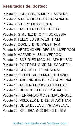 Lista de participantes: DE MARCOS LTD 78 ARSENAL, SILVIO LTD 76 ARSENAL, CLICHY LTI 80 ARSENAL, DE LA BELLA LTI 75 ARSENAL, PIQUE DFC 84 ARSENAL, ABDENNOUR DFC 79 ARSENAL, V. BEREZUTSKIY DFC 78 ARSENAL, RAMIRES MC 81 ARSENAL, PAULINHO MC 80 ARSENAL, KRYCHOWIAK MC 79 ARSENAL, MATA MCO 85 ARSENAL, GERVINHO EI 81 ARSENAL, LJAJIC EI 76 ARSENAL, WALCOTT ED 81 ARSENAL, LICHSTEINER MD 77 ARSENAL, HELMES DC 77 ARSENAL, DIEGO COSTA DC 85 ARSENAL, VAN DER WIEL LTD 77 ATH.BILBAO, RAFAEL LTD 77 ATH.BILBAO, ALEX SANDRO LTI 79 ATH.BILBAO, SUBOTIC DFC 82 ATH.BILBAO, BONUCCI DFC 79 ATH.BILBAO, M. SCHNEIDERLIN MCD 80 ATH.BILBAO, KOUYATE MCD 71 ATH.BILBAO, BORJA VALERO MC 82 ATH.BILBAO, GUARIN MC 79 ATH.BILBAO, SNEIDJER MCO 84 ATH.BILBAO, GOTZE MCO 85 ATH.BILBAO, BRUMA MI 76 ATH.BILBAO, SAM MD 80 ATH.BILBAO, LAMELA ED 78 ATH.BILBAO, AGUERO DC 86 ATH.BILBAO, BALOTELLI DC 82 ATH.BILBAO, MUSA DC 75 ATH.BILBAO, DEBUCHY LTD 80 BOCA, MARCELO LTI 82 BOCA, KADLEC LTI 74 BOCA, AURTENETXE LTI 74 BOCA, SKRTL DFC 81 BOCA, JUAN JESUS DFC 78 BOCA, L. DIARRA MC 79 BOCA, TIELEMANS MC 73 BOCA, M. FERNANDES MCO 79 BOCA, MERTENS MCO 82 BOCA, RIBERY MI 88 BOCA, PAYET MI 78 BOCA, RAFA EI 77 BOCA, A. JOHNSON MD 77 BOCA, ADURIZ DC 80 BOCA, UCHE DC 78 BOCA, VIGUERA DC 74 BOCA, EBOUE LTD 75 BORUSSIA, YEDLIN LTD 68 BORUSSIA, GUNINO LTD 68 BORUSSIA, MONREAL LTI 76 BORUSSIA, THIAGO SILVA DFC 87 BORUSSIA, DAVID LUIZ DFC 82 BORUSSIA, GIMENEZ DFC 71 BORUSSIA, PIRLO MC 84 BORUSSIA, GABI MC 82 BORUSSIA, DI MARIA MD 86 BORUSSIA, VARELA EI 78 BORUSSIA, AMRABAT EI 77 BORUSSIA, ARDA TURAN MI 84 BORUSSIA, C. RODRIGUEZ MI 79 BORUSSIA, HIGUAIN DC 84 BORUSSIA, IAGO ASPAS DC 76 BORUSSIA, A. HERNANDEZ DC 72 BORUSSIA, MAICON LTD 79 CELTA, RODRIGUEZ LTI 80 CELTA, ADRIANO LTI 76 CELTA, VARANE DFC 81 CELTA, JAGLIEKA DFC 80 CELTA, CHEDJOU DFC 79 CELTA, GUNDOGAN MC 83 CELTA, ILLARAMENDI MC 79 CELTA, DE BRUYNE MCO 81 CELTA, BERNARD MCO 80 CELTA, DRAXLER MI 80 CELTA, LENNON MD 79 CELTA, M. PEREIRA MD 72 CELTA, VAN PERSIE DC 88 CELTA, EMENIKE DC 80 CELTA, GAMEIRO DC 79 CELTA, SALPINGUIDIS DC 75 CELTA, GLEN JHONSON LTD 76 CHELSEA, LUSTIG LTD 75 CHELSEA, SCHMELZER LTI 78 CHELSEA, GUARDADO LTI 77 CHELSEA, CISSOKHO LTI 74 CHELSEA, SOUARE LTI 74 CHELSEA, HOWEDES DFC 82 CHELSEA, RAMI DFC 79 CHELSEA, KHEDIRA MCD 84 CHELSEA, MATIC MCD 82 CHELSEA, ISCO MCO 83 CHELSEA, KOKE MI 82 CHELSEA, CUADRADO MD 83 CHELSEA, EL SHAARAWY EI 80 CHELSEA, ITURBE ED 77 CHELSEA, BENZEMA DC 85 CHELSEA, MOVSISYAN DC 78 CHELSEA, ANYUKOV LTD 77 GRANADA, CAVANDA LTD 72 GRANADA, ALABA LTI 82 GRANADA, SUTTNER LTI 68 GRANADA, ALEX DFC 82 GRANADA, PERRIN DFC 80 GRANADA, TOPRAK DFC 79 GRANADA, GERRARD MC 82 GRANADA, SAHIN MC 81 GRANADA, E. PEREZ MCO 80 GRANADA, SILVA MI 87 GRANADA, SCHURRLE MI 81 GRANADA, LUCAS ED 82 GRANADA, MANDZUKIC DC 83 GRANADA, IMMOBILE DC 80 GRANADA, BODE DC 69 GRANADA, CARLOS MARTINEZ LTD 77 JUVENTUS, JANMAAT LTD 75 JUVENTUS, KOLAROV LTI 78 JUVENTUS, BERNAT LTI 71 JUVENTUS, VIDIC DFC 83 JUVENTUS, MASCHERANO DFC 83 JUVENTUS, OTAMENDI DFC 80 JUVENTUS, L. BENDER MC 81 JUVENTUS, ITURRASPE MC 80 JUVENTUS, INLER MC 79 JUVENTUS, HAMSIK MCO 83 JUVENTUS, WIJNALDUM MCO 79 JUVENTUS, ATSU EI 75 JUVENTUS, A. AYEW MI 78 JUVENTUS, FARFAN MD 83 JUVENTUS, VITOLO MI 77 JUVENTUS, M. GOMEZ DC 82 JUVENTUS, CARVAJAL LTD 79 LAZIO, TRASH LTD 76 LAZIO, TREMOULINAS LTI 77 LAZIO, WENDT LTI 75 LAZIO, BARZAGLI DFC 83 LAZIO, NALDO DFC 80 LAZIO, MEXES DFC 77 LAZIO, DE ROSSI MCD 84 LAZIO, FELIPE MELO MCD 81 LAZIO, BLIND MC 79 LAZIO, ESPINOSA MC 69 LAZIO, HERNANES MCO 82 LAZIO, MUNIAIN EI 80 LAZIO, HULK ED 83 LAZIO, FEGHOULI MD 81 LAZIO, TEVEZ DC 85 LAZIO, GROBKREUTZ LTD 77 LIVERPOOL, ABATE LTD 74 LIVERPOOL, FILIPE LUIS LTI 82 LIVERPOOL, CASCO LTI 75 LIVERPOOL, VERTONGHEN DFC 82 LIVERPOOL, COLOCCINI DFC 79 LIVERPOOL, SMALLING DFC 76 LIVERPOOL, VIDAL MC 85 LIVERPOOL, FERNANDO MC 79 LIVERPOOL, NAINNGGOLAN MC 79 LIVERPOOL, MKHITARYAN MCO 81 LIVERPOOL, DANNY EI 82 LIVERPOOL, HAZARD MI 88 LIVERPOOL, WILLIAN MD 82 LIVERPOOL, R. PALACIO DC 82 LIVERPOOL, BENTEKE DC 80 LIVERPOOL, MAXI PEREIRA LTD 77 SABADELL, MONTOYA LTD 77 SABADELL, INSUA LTI 77 SABADELL, SAKHO DFC 81 SABADELL, FERDINAND DFC 79 SABADELL, VERMAELEN DFC 79 SABADELL, DIAKITE DFC 75 SABADELL, POGBA MC 83 SABADELL, REMY CABELLA MCO 79 SABADELL, ROBBEN MD 90 SABADELL, ROGERINHO MD 74 SABADELL, PERISIC MI 78 SABADELL, DEPAY EI 78 SABADELL, DEULOFEU ED 79 SABADELL, DOUMBIA DC 82 SABADELL, CASSANO DC 80 SABADELL, O. MARTINS DC 77 SABADELL, KONKO LTD 76 SCHALKE 04, SARIOUGLU LTD 73 SCHALKE 04, PEPE DFC 83 SCHALKE 04, DAWSON DFC 79 SCHALKE 04, MARQUINHOS DFC 78 SCHALKE 04, CANDREVA MC 83 SCHALKE 04, TIOTE MCD 78 SCHALKE 04, G. MEDEL MCD 76 SCHALKE 04, VALBUENA MCO 81 SCHALKE 04, NAGATOMO MI 76 SCHALKE 04, BLASZCZYKOWSKI MD 82 SCHALKE 04, AUBAMEYANG MD 79 SCHALKE 04, MILNER MD 78 SCHALKE 04, SALAH MD 76 SCHALKE 04, G. ROSSI DC 82 SCHALKE 04, BATSHUAYI DC 75 SCHALKE 04, PISZCZEK LTD 82 SHAKTHTAR, WYNNE LTD 63 SHAKTHTAR, JEFFERSON LTI 75 SHAKTHTAR, TAIWO LTI 71 SHAKTHTAR, CHIELINI DFC 84 SHAKTHTAR, ONUOHA DFC 75 SHAKTHTAR, JAVI GARCIA MCD 79 SHAKTHTAR, HUTCHINSON MCD 78 SHAKTHTAR, TAARABT MCO 79 SHAKTHTAR, TAISON MCO 78 SHAKTHTAR, JESÉ MI 76 SHAKTHTAR, DZSUDSZAK MD 79 SHAKTHTAR, LASSANE BANGOURA MD 77 SHAKTHTAR, SOW EI 78 SHAKTHTAR, B. KEITA EI 76 SHAKTHTAR, IBRAHIMOVIC DC 90 SHAKTHTAR, JACKSON MARTINEZ DC 82 SHAKTHTAR, COKE LTD 78 WEST HAM, MANDI LTD 75 WEST HAM, BALENZIAGA LTI 77 WEST HAM, KOMPANY DFC 86 WEST HAM, MATHIEU DFC 80 WEST HAM, KAGAWA MCO 81 WEST HAM, CALLEJON MCO 80 WEST HAM, COUTINHO MCO 81 WEST HAM, FERNANDINHO MC 82 WEST HAM, GIACCHERINI MI 77 WEST HAM, GRIEZMANN EI 82 WEST HAM, STERLING ED 80 WEST HAM, TELLO ED 78 WEST HAM, OXLADE-CHAMBERLAIN MD 78 WEST HAM, ETO'O DC 81 WEST HAM, LACAZETTE DC 79 WEST HAM, KRUSE DC 78 WEST HAM.