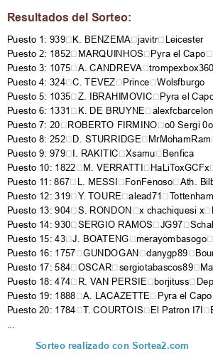 Lista de participantes: 20 ROBERTO FIRMINO o0 Sergi 0o Everton, 33 A. SCHURRLE perikinho90 Cordoba, 41 M. NEUER KaOs I AsTuR Oviedo, 43 J. BOATENG merayombasogo Juventus, 45 P. LAHM tabascos89 Barcelona, 48 A. ROBBEN Nandobel Tenerife, 49 T. MULLER Maybecohen Zaragoza, 50 F. RIBERY Ergion46 Monaco, 57 D. ALABA Havel7 Manchester City, 62 M. HUMMELS Sr bokeron Pescara, 66 M. GOTZE Andrew Torres UNAM Pumas, 74 R. LEWANDOWSKI Havel7 Manchester City, 79 M. REUS misterserpico West Ham, 81 R. PEREYRA danygp89 Bournomenth, 90 K. BELLARABI Sergio0004 Cska Moscu, 155 SOKRATIS Ronald Ol. Lyon, 156 NALDO merayombasogo Juventus, 244 P. CECH FonFenoso Ath. Bilbao, 252 D. STURRIDGE MrMohamRam Liverpool, 254 MATA Prince Sp. Lisboa, 256 DAVID LUIZ misterserpico West Ham, 264 R. LUKAKU Die1234 Cristal Palace, 279 P. POGBA Balles Rayo Vallecano, 305 L. SUAREZ Xsamu Benfica, 316 V. KOMPANY victub Valencia, 319 Y. TOURE alead71 Tottenham, 321 DAVID SILVA Prince Sp. Lisboa, 323 S. AGÜERO benniscuba Roma, 324 C. TEVEZ Prince Wolsfburgo, 334 Y. KONOPLYANKA Nandobel Tenerife, 337 DE GEA merayombasogo Juventus, 346 W. ROONEY Ergion46 Monaco, 347 J. HERNANDEZ sergiotabascos89 Manchester United, 378 A. TAARABT trompexbox360 Ac Milan, 414 L. MODRIC javitr Leicester, 415 G. BALE adrylito Malaga, 433 C. BEAUVUE Ramses17 Wolsfburgo, 471 A. RAMSEY alemalaga94 Bayern Munich, 473 T. WALCOTT MrMohamRam Liverpool, 474 R. VAN PERSIE borjituss Depor, 477 L. KOSCIELNY MrMohamRam Liverpool, 478 J. WILSHERE alemalaga94 Bayern Munich, 496 A. MARTIAL TheForceMaker Cadiz, 584 OSCAR sergiotabascos89 Manchester United, 604 NEYMAR Danibke New York City, 609 LUCAS Havel7 Manchester City, 635 S. DOUMBIA Saavexbox Las Palmas, 727 E. HAZARD merayombasogo Juventus, 741 L. REMY Adriantr127 Atco. Madrid, 754 H. LLORIS trompexbox360 Ac Milan, 775 J. PASTORE o0 Sergi 0o Everton, 778 S. SIRIGU ADONERI4 Napoles, 832 MUNIAIN toni1708 Celta, 844 FALCAO ADONERI4 Napoles, 845 A. TURAN Die1234 Cristal Palace, 846 D. GODIN Shaman1987 Inter de Milan, 853 DIEGO COSTA StormFury Elche, 861 PIQUE SpiffiestJose Southampton, 863 SERGIO BUSQUETS StormFury Elche, 865 CESC FABREGAS Ozora10Tsubasa Boca Juniors, 866 INIESTA Rosino85 Arsenal, 867 L. MESSI FonFenoso Ath. Bilbao, 871 A. SANCHEZ joselitorojas1 Sassuolo, 872 THIAGO MrMohamRam Liverpool, 873 PEDRO Albervil A. Petrolera, 900 SANTI CAZORLA AndrewTorres UNAM Pumas, 904 S. RONDON x chachiquesi x Betis, 906 ISCO sergiotabascos89 Manchester United, 930 SERGIO RAMOS JG97 Schalke 04, 933 MARCELO Adriantr127 Atco. Madrid, 934 XABI ALONSO alead71 Tottenham, 936 A. DI MARIA Ramses17 Wolsfburgo, 937 C. RONALDO StormFury Elche, 938 M. OZIL MaDaScAs Reus, 939 K. BENZEMA javitr Leicester, 943 G. HIGUAIN Shaman1987 Inter de Milan, 948 JOSE CALLEJON StormFury Elche, 979 I. RAKITIC Xsamu Benfica, 999 JORDI ALBA sergiotabascos89 Manchester United, 1028 THIAGO SILVA Shaman1987 Inter de Milan, 1035 Z. IBRAHIMOVIC Pyra el Capo Mirandes, 1075 A. CANDREVA trompexbox360 Ac Milan, 1118 W. SNEIJDER Adriantr127 Atco. Madrid, 1136 G. CHIELLINI Xsamu Benfica, 1138 A. VIDAL Shaman1987 Inter de Milan, 1147 C. MARCHISIO MaDaScAs Reus, 1185 CAVANI CometHeaven79 Chelsea, 1217 M. PJANIC MaDaScAs Reus, 1251 N. OTAMENDI Prince Sp. Lisboa, 1259 JAMES RODRIGUEZ Shaman1987 Inter de Milan, 1331 K. DE BRUYNE alexfcbarcelona B. Dortmund, 1426 J. CUADRADO TheForceMaker Cadiz, 1524 PHILIPPE COUTINHO CharlyFifax B. Leverkusen, 1610 N. MATIC CometHeaven79 Chelsea, 1619 P. AUBAMEYANG adrylito Malaga, 1668 D. MERTENS joselitorojas1 Sassuolo, 1729 PIRLO sergiotabascos89 Manchester United, 1730 ERIKSEN toni1708 Celta, 1753 KROOS Die1234 Cristal Palace, 1755 C. VELA danygp89 Bournomenth, 1756 WITSEL trunks Levante, 1757 GUNDOGAN danygp89 Bournomenth, 1758 R. NAINGGOLAN benniscuba Roma, 1784 T. COURTOIS El Patron I7I Besiktas, 1797 MATUIDI Ergion46 Monaco, 1803 R. STERLING SrPistolas86 Udinese, 1822 M. VERRATTI HaLiToxGCFx Granada, 1825 C. BENTEKE perikinho90 Cordoba, 1826 R. VARANE sergiotabascos89 Manchester United, 1840 WILLIAN alemalaga94 Bayern Munich, 1842 KOKE buijin Celtic, 1852 MARQUINHOS Pyra el Capo Mirandes, 1858 B. LENO alead71 Tottenham, 1879 A. ABDENNOUR Ergion46 Monaco, 1888 A. LACAZETTE Pyra el Capo Mirandes, 1906 A. MORATA buijin Celtic, 1907 A. GRIEZMANN adrylito Malaga, 1933 P. DYBALA HaLiToxGCFx Granada, 1969 DOUGLAS COSTA trunks Levante, 1994 DEPAY II ANTI CULE II Santos, 2010 C. BACCA alemalaga94 Bayern Munich, 2015 PACO ALCACER diego_gallego Lugo, 2017 L. VIETTO II ANTI CULE II Santos, 2030 A. LAPORTE KaOs I AsTuR Oviedo.