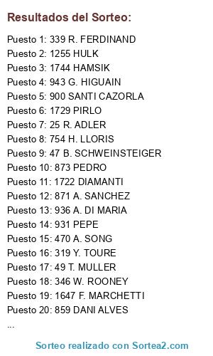 Lista de participantes: 867 L. MESSI, 50 F. RIBERY, 844 FALCAO, 866 INIESTA, 864 XAVI, 474 R. VAN PERSIE, 48 A. ROBBEN, 47 B. SCHWEINSTEIGER, 340 N. VIDIC, 321 DAVID SILVA, 323 S. AGÜERO, 346 W. ROONEY, 1185 E. CAVANI, 938 M. OZIL, 415 G. BALE, 254 MATA, 41 M. NEUER, 936 A. DI MARIA, 316 V. KOMPANY, 324 C. TEVEZ, 1729 PIRLO, 861 PIQUE, 305 L. SUAREZ, 51 M. GOMEZ, 1136 G. CHIELLINI, 930 SERGIO RAMOS, 865 CESC FABREGAS, 319 Y. TOURE, 1133 G. BUFFON, 929 CASILLAS, 74 R. LEWANDOWSKI, 62 M. HUMMELS, 1184 E. LAVEZZI, 1138 A. VIDAL, 971 JESUS NAVAS, 900 SANTI CAZORLA, 66 M. GOTZE, 934 XABI ALONSO, 871 A. SANCHEZ, 727 E. HAZARD, 414 L.MODRIC, 49 T. MULLER, 939 K. BENZEMA, 863 SERGIO BUSQUETS, 248 A. COLE, 79 M. REUS, 873 PEDRO, 842 DIEGO, 1753 KROOS, 1255 HULK, 1238 A. DI NATALE, 1757 GUNDOGAN, 1087 R. MONTOLIVO, 944 S. KHEDIRA, 943 G. HIGUAIN, 870 J. MASCHERANO, 845 A. TURAN, 626 S. ETO´O, 604 NEYMAR, 342 NANI, 322 S. NASRI, 1766 MARCHISIO, 1744 HAMSIK, 1724 DE ROSSI, 1135 A. BARZAGLI, 1118 W. SNEIJDER, 1091 S. JOVETIC, 995 SOLDADO, 987 A. RAMI, 859 DANI ALVES, 828 JAVI MARTINEZ, 114 K. HUNTELAAR, 1784 T. COURTOIS, 1647 F. MARCHETTI, 1230 S. HANDANOVIC, 906 ISCO, 754 H. LLORIS, 640 I. AKINFEEV, 314 J. HART, 244 P. CECH, 78 DANTE, 25 R. ADLER, 253 D. DROGBA, 301 S. GERRARD, 1165 HERNANES, 416 R. VAN DER VAART, 356 A. VALENCIA, 339 R. FERDINAND, 67 S. KAGAWA, 1840 WILLIAN, 1722 DIAMANTI, 1254 JOAO MOUTINHO, 940 KAKA, 931 PEPE, 868 DAVID VILLA, 853 DIEGO COSTA, 470 A. SONG, 329 E. DZEKO, 73 J. BLASZCZYKOWSKI.
