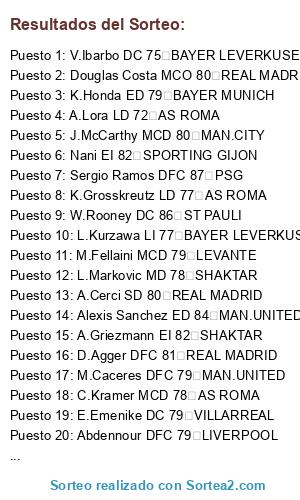 Lista de participantes: A.Lora LD 72 AS ROMA, B.Ivanovic LD 81 AS ROMA, K.Grosskreutz LD 77 AS ROMA, M.Yanga-Mbiwa DFC 76 AS ROMA, N.Otamendi DFC 82 AS ROMA, B.Tremoulinas LI 77 AS ROMA, Eliseu LI 75 AS ROMA, William Carvalho MCD 78 AS ROMA, C.Kramer MCD 78 AS ROMA, Thiago A. MC 81 AS ROMA, F.Fabregas MC 84 AS ROMA, A.Ramsey MC 82 AS ROMA, R.Barkley MCO 78 AS ROMA, Z.Ibrahimovic DC 90 AS ROMA, C.Bacca DC 81 AS ROMA, F.Torres DC 80 AS ROMA, W.Bony DC 81 AS ROMA, M.Montoya LD 77 ATH. BILBAO, D.Yedlin LD 67 ATH. BILBAO, Thiago Silva DFC 87 ATH. BILBAO, N.Onuoha DFC 75 ATH. BILBAO, J.Okore DFC 73 ATH. BILBAO, D.Alaba LI 82 ATH. BILBAO, C.Tiote MCD 78 ATH. BILBAO, Carlos Peña MC 73 ATH. BILBAO, A.Iniesta MC 89 ATH. BILBAO, Y.Chikhaoui MCO 78 ATH. BILBAO, L.Podolski MI 77 ATH. BILBAO, Jese Rdgz. MI 76 ATH. BILBAO, F.Ribery MI 88 ATH. BILBAO, E.Lamela MD 78 ATH. BILBAO, G.Bale MD 87 ATH. BILBAO, M.Gomez DC 82 ATH. BILBAO, C.Benteke DC 80 ATH. BILBAO, S.Aurier LD 77 BAYER MUNICH, A.Barzagli DFC 83 BAYER MUNICH, R.Varane DFC 81 BAYER MUNICH, Marquinhos DFC 78 BAYER MUNICH, D.Criscito LI 78 BAYER MUNICH, J.Zuñiga LI 74 BAYER MUNICH, N.De Jong MCD 81 BAYER MUNICH, Sandro MCD 79 BAYER MUNICH, C.Kouyate MCD 71 BAYER MUNICH, Fernandinho MC 81 BAYER MUNICH, P.Aubameyang MD 79 BAYER MUNICH, K.Honda ED 79 BAYER MUNICH, Lucas Moura ED 82 BAYER MUNICH, M.Sow EI 78 BAYER MUNICH, L.Messi SD 93 BAYER MUNICH, D.Sturridge DC 83 BAYER MUNICH, V.Ibarbo DC 75 BAYER LEVERKUSEN, B.Sagna LD 80 BAYER LEVERKUSEN, Pepe DFC 83 BAYER LEVERKUSEN, Alex DFC 82 BAYER LEVERKUSEN, Dante DFC 82 BAYER LEVERKUSEN, L.Kurzawa LI 77 BAYER LEVERKUSEN, A.Cole LI 77 BAYER LEVERKUSEN, D.Blind MCD 79 BAYER LEVERKUSEN, S.Busquets MCD 85 BAYER LEVERKUSEN, Borja Valero MC 82 BAYER LEVERKUSEN, P.Coutinho MCO 81 BAYER LEVERKUSEN, G.Wijnaldum MCO 78 BAYER LEVERKUSEN, S.Feghouli MD 81 BAYER LEVERKUSEN, M.Reus MD 86 BAYER LEVERKUSEN, C.Atsu EI 76 BAYER LEVERKUSEN, R.Quaresma ED 80 BAYER LEVERKUSEN, M.Mandzukic DC 83 BAYER LEVERKUSEN, R.Lukaku DC 80 BAYER LEVERKUSEN, Joao Pereira LD 78 BORUSIA DORTMUND, Maxi Pereira LD 77 BORUSIA DORTMUND, L.Piszczek LD 82 BORUSIA DORTMUND, D.Godin DFC 84 BORUSIA DORTMUND, A.Laporte DFC 80 BORUSIA DORTMUND, F.Coloccini DFC 80 BORUSIA DORTMUND, P.Evra LI 80 BORUSIA DORTMUND, P.Lahm MCD 87 BORUSIA DORTMUND, Javi Garcia MCD 79 BORUSIA DORTMUND, A.Vidal MC 85 BORUSIA DORTMUND, K.Mirallas MD 80 BORUSIA DORTMUND, D.Payet MI 79 BORUSIA DORTMUND, Pedro Rgdz. EI 83 BORUSIA DORTMUND, J.Iturbe ED 77 BORUSIA DORTMUND, S.Doumbia DC 82 BORUSIA DORTMUND, S.Jovetic DC 81 BORUSIA DORTMUND, M.Klose DC 81 BORUSIA DORTMUND, D.Carvajal LD 79 CORDOBA, J.Mascherano DFC 83 CORDOBA, L.Castan DFC 81 CORDOBA, D.Carriço DFC 79 CORDOBA, K.Gibbs LI 78 CORDOBA, Antunes LI 76 CORDOBA, D.De Rossi MCD 84 CORDOBA, Fernando MCD 79 CORDOBA, J.Moutinho MCO 83 CORDOBA, D.Mertens MCO 82 CORDOBA, J.Cuadrado MD 83 CORDOBA, Koke R. MI 82 CORDOBA, I.Afellay MI 76 CORDOBA, M.Depay EI 78 CORDOBA, M.Susaeta ED 80 CORDOBA, Diego Costa DC 85 CORDOBA, S.Eto'o DC 81 CORDOBA, Coke LD 78 DEPORTIVO DE LA CORUÑA, A.Iraola LD 79 DEPORTIVO DE LA CORUÑA, V.Kompany DFC 86 DEPORTIVO DE LA CORUÑA, I.Martinez DFC 79 DEPORTIVO DE LA CORUÑA, J.Alba LI 81 DEPORTIVO DE LA CORUÑA, S.Bender MCD 81 DEPORTIVO DE LA CORUÑA, Yaya Toure MC 86 DEPORTIVO DE LA CORUÑA, Enzo Perez MC 81 DEPORTIVO DE LA CORUÑA, K.P.Boateng MCO 80 DEPORTIVO DE LA CORUÑA, James Rdgz. MCO 86 DEPORTIVO DE LA CORUÑA, I.Perisic MI 76 DEPORTIVO DE LA CORUÑA, K.Asamoah MI 79 DEPORTIVO DE LA CORUÑA, S.Sam MD 78 DEPORTIVO DE LA CORUÑA, P.Ebert MD 75 DEPORTIVO DE LA CORUÑA, K.Volland MD 79 DEPORTIVO DE LA CORUÑA, L.Narsingh ED 75 DEPORTIVO DE LA CORUÑA, L.Suarez DC 89 DEPORTIVO DE LA CORUÑA, I.Abate LD 76 BARCELONA, I.Opara DFC 67 BARCELONA, Yun Sun Young DFC 65 BARCELONA, Sokratis P. DFC 82 BARCELONA, Balenziaga LI 77 BARCELONA, P.Van Aanholt LTI 71 BARCELONA, Iturraspe MCD 80 BARCELONA, Gabi MC 82 BARCELONA, R.Firmimo MCO 81 BARCELONA, Jesus Navas MD 82 BARCELONA, S.Cazorla MI 84 BARCELONA, D.Silva MI 87 BARCELONA, I.Muniain EI 80 BARCELONA, Bruma EI 76 BARCELONA, Hulk ED 83 BARCELONA, S.Agüero DC 87 BARCELONA, E.Hurtado DC 65 BARCELONA, Maicon LD 80 GETAFE, N.Vidic DFC 83 GETAFE, N.Subotic DFC 81 GETAFE, M.Musacchio DFC 79 GETAFE, A.Kolarov LI 78 GETAFE, Silvio LI 76 GETAFE, Felipe Melo MCD 81 GETAFE, I.Camacho MCD 79 GETAFE, J.Wilshere MC 81 GETAFE, Hernanes MC 81 GETAFE, K.De Bryune MCO 82 GETAFE, J.Farfan MD 83 GETAFE, Lass B. MD 76 GETAFE, T.Müller MD 86 GETAFE, Ibai Gomez EI 78 GETAFE, R.Sterling ED 80 GETAFE, G.Rossi DC 82 GETAFE, S.Coleman LD 79 LEVANTE, Miranda DFC 83 LEVANTE, M.Skrtel DFC 81 LEVANTE, L.Perea DFC 74 LEVANTE, M.Schmelzer LI 76 LEVANTE, P.Armero LI 73 LEVANTE, Ramires MCD 81 LEVANTE, M.Fellaini MCD 79 LEVANTE, C.Marchisio MC 83 LEVANTE, M.Hamsik MCO 82 LEVANTE, A.Robben MD 90 LEVANTE, Bolly MD 64 LEVANTE, A.Schürrle MI 81 LEVANTE, Vitolo MI 77 LEVANTE, S.Varela EI 78 LEVANTE, Biabiany ED 79 LEVANTE, K.Benzema DC 85 LEVANTE, K.Walker LD 77 LIVERPOOL, Juanfran LD 79 LIVERPOOL, Abdennour DFC 79 LIVERPOOL, O.Toprak DFC 79 LIVERPOOL, L.Koscielny DFC 81 LIVERPOOL, Alex Sandro LI 78 LIVERPOOL, M.Schneiderlin MCD 80 LIVERPOOL, R.Nainggolan MC 81 LIVERPOOL, J.Callejon MCO 80 LIVERPOOL, S.Kagawa MCO 83 LIVERPOOL, M.Gotze MCO 86 LIVERPOOL, V.Stocker MI 79 LIVERPOOL, G.Deulofeu MD 76 LIVERPOOL, Willian MD 82 LIVERPOOL, Rodrigo M. DC 80 LIVERPOOL, Welbeck DC 78 LIVERPOOL, R.Van Persie DC 87 LIVERPOOL, J.Vertonghen DFC 82 MAN.CITY, E.Mangala DFC 80 MAN.CITY, M.Sakho DFC 80 MAN.CITY, C.Ansaldi LI 77 MAN.CITY, S.Radu LI 77 MAN.CITY, A.Song MCD 80 MAN.CITY, G.Barry MCD 80 MAN.CITY, J.McCarthy MCD 80 MAN.CITY, L.Modric MC 87 MAN.CITY, Oscar MCO 84 MAN.CITY, S.Lichtsteiner MD 77 MAN.CITY, Aleix Vidal MD 76 MAN.CITY, A.Ljajic EI 77 MAN.CITY, A.Candreva ED 83 MAN.CITY, G.Higuain DC 84 MAN.CITY, C.Tevez DC 85 MAN.CITY, M.Balotelli DC 81 MAN.CITY, Dani Alves LD 83 MAN.UNITED, Choi Chul Soon L