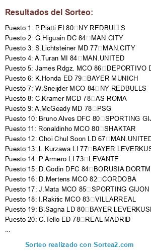 Lista de participantes: A.Lora LD 72 AS ROMA, B.Ivanovic LD 81 AS ROMA, K.Grosskreutz LD 77 AS ROMA, M.Yanga-Mbiwa DFC 76 AS ROMA, N.Otamendi DFC 82 AS ROMA, B.Tremoulinas LI 77 AS ROMA, Eliseu LI 75 AS ROMA, William Carvalho MCD 78 AS ROMA, C.Kramer MCD 78 AS ROMA, Thiago A. MC 81 AS ROMA, F.Fabregas MC 84 AS ROMA, A.Ramsey MC 82 AS ROMA, R.Barkley MCO 78 AS ROMA, Z.Ibrahimovic DC 90 AS ROMA, C.Bacca DC 81 AS ROMA, F.Torres DC 80 AS ROMA, W.Bony DC 81 AS ROMA, M.Montoya LD 77 ATH. BILBAO, D.Yedlin LD 67 ATH. BILBAO, Thiago Silva DFC 87 ATH. BILBAO, N.Onuoha DFC 75 ATH. BILBAO, J.Okore DFC 73 ATH. BILBAO, D.Alaba LI 82 ATH. BILBAO, C.Tiote MCD 78 ATH. BILBAO, Carlos Peña MC 73 ATH. BILBAO, A.Iniesta MC 89 ATH. BILBAO, Y.Chikhaoui MCO 78 ATH. BILBAO, L.Podolski MI 77 ATH. BILBAO, Jese Rdgz. MI 76 ATH. BILBAO, F.Ribery MI 88 ATH. BILBAO, E.Lamela MD 78 ATH. BILBAO, G.Bale MD 87 ATH. BILBAO, M.Gomez DC 82 ATH. BILBAO, C.Benteke DC 80 ATH. BILBAO, S.Aurier LD 77 BAYER MUNICH, A.Barzagli DFC 83 BAYER MUNICH, R.Varane DFC 81 BAYER MUNICH, Marquinhos DFC 78 BAYER MUNICH, D.Criscito LI 78 BAYER MUNICH, J.Zuñiga LI 74 BAYER MUNICH, N.De Jong MCD 81 BAYER MUNICH, Sandro MCD 79 BAYER MUNICH, C.Kouyate MCD 71 BAYER MUNICH, Fernandinho MC 81 BAYER MUNICH, P.Aubameyang MD 79 BAYER MUNICH, K.Honda ED 79 BAYER MUNICH, Lucas Moura ED 82 BAYER MUNICH, M.Sow EI 78 BAYER MUNICH, L.Messi SD 93 BAYER MUNICH, D.Sturridge DC 83 BAYER MUNICH, V.Ibarbo DC 75 BAYER MUNICH, B.Sagna LD 80 BAYER LEVERKUSEN, Pepe DFC 83 BAYER LEVERKUSEN, Alex DFC 82 BAYER LEVERKUSEN, Dante DFC 82 BAYER LEVERKUSEN, L.Kurzawa LI 77 BAYER LEVERKUSEN, A.Cole LI 77 BAYER LEVERKUSEN, D.Blind MCD 79 BAYER LEVERKUSEN, S.Busquets MCD 85 BAYER LEVERKUSEN, Borja Valero MC 82 BAYER LEVERKUSEN, P.Coutinho MCO 81 BAYER LEVERKUSEN, G.Wijnaldum MCO 78 BAYER LEVERKUSEN, S.Feghouli MD 81 BAYER LEVERKUSEN, M.Reus MD 86 BAYER LEVERKUSEN, C.Atsu EI 76 BAYER LEVERKUSEN, R.Quaresma ED 80 BAYER LEVERKUSEN, M.Mandzukic DC 83 BAYER LEVERKUSEN, R.Lukaku DC 80 BAYER LEVERKUSEN, Joao Pereira LD 78 BORUSIA DORTMUND, Maxi Pereira LD 77 BORUSIA DORTMUND, L.Piszczek LD 82 BORUSIA DORTMUND, D.Godin DFC 84 BORUSIA DORTMUND, A.Laporte DFC 80 BORUSIA DORTMUND, F.Coloccini DFC 80 BORUSIA DORTMUND, P.Evra LI 80 BORUSIA DORTMUND, P.Lahm MCD 87 BORUSIA DORTMUND, Javi Garcia MCD 79 BORUSIA DORTMUND, A.Vidal MC 85 BORUSIA DORTMUND, K.Mirallas MD 80 BORUSIA DORTMUND, D.Payet MI 79 BORUSIA DORTMUND, Pedro Rgdz. EI 83 BORUSIA DORTMUND, J.Iturbe ED 77 BORUSIA DORTMUND, S.Doumbia DC 82 BORUSIA DORTMUND, S.Jovetic DC 81 BORUSIA DORTMUND, M.Klose DC 81 BORUSIA DORTMUND, D.Carvajal LD 79 CORDOBA, J.Mascherano DFC 83 CORDOBA, L.Castan DFC 81 CORDOBA, D.Carriço DFC 79 CORDOBA, K.Gibbs LI 78 CORDOBA, Antunes LI 76 CORDOBA, D.De Rossi MCD 84 CORDOBA, Fernando MCD 79 CORDOBA, J.Moutinho MCO 83 CORDOBA, D.Mertens MCO 82 CORDOBA, J.Cuadrado MD 83 CORDOBA, Koke R. MI 82 CORDOBA, I.Afellay MI 76 CORDOBA, M.Depay EI 78 CORDOBA, M.Susaeta ED 80 CORDOBA, Diego Costa DC 85 CORDOBA, S.Eto'o DC 81 CORDOBA, Coke LD 78 DEPORTIVO DE LA CORUÑA, A.Iraola LD 79 DEPORTIVO DE LA CORUÑA, V.Kompany DFC 86 DEPORTIVO DE LA CORUÑA, I.Martinez DFC 79 DEPORTIVO DE LA CORUÑA, J.Alba LI 81 DEPORTIVO DE LA CORUÑA, S.Bender MCD 81 DEPORTIVO DE LA CORUÑA, Yaya Toure MC 86 DEPORTIVO DE LA CORUÑA, Enzo Perez MC 81 DEPORTIVO DE LA CORUÑA, K.P.Boateng MCO 80 DEPORTIVO DE LA CORUÑA, James Rdgz. MCO 86 DEPORTIVO DE LA CORUÑA, I.Perisic MI 76 DEPORTIVO DE LA CORUÑA, K.Asamoah MI 79 DEPORTIVO DE LA CORUÑA, S.Sam MD 78 DEPORTIVO DE LA CORUÑA, P.Ebert MD 75 DEPORTIVO DE LA CORUÑA, K.Volland MD 79 DEPORTIVO DE LA CORUÑA, L.Narsingh ED 75 DEPORTIVO DE LA CORUÑA, L.Suarez DC 89 DEPORTIVO DE LA CORUÑA, I.Abate LD 76 BARCELONA, I.Opara DFC 67 BARCELONA, Yun Sun Young DFC 65 BARCELONA, Sokratis P. DFC 82 BARCELONA, Balenziaga LI 77 BARCELONA, P.Van Aanholt LTI 71 BARCELONA, Iturraspe MCD 80 BARCELONA, Gabi MC 82 BARCELONA, R.Firmimo MCO 81 BARCELONA, Jesus Navas MD 82 BARCELONA, S.Cazorla MI 84 BARCELONA, D.Silva MI 87 BARCELONA, I.Muniain EI 80 BARCELONA, Bruma EI 76 BARCELONA, Hulk ED 83 BARCELONA, S.Agüero DC 87 BARCELONA, E.Hurtado DC 65 BARCELONA, Maicon LD 80 GETAFE, N.Vidic DFC 83 GETAFE, N.Subotic DFC 81 GETAFE, M.Musacchio DFC 79 GETAFE, A.Kolarov LI 78 GETAFE, Silvio LI 76 GETAFE, Felipe Melo MCD 81 GETAFE, I.Camacho MCD 79 GETAFE, J.Wilshere MC 81 GETAFE, Hernanes MC 81 GETAFE, K.De Bryune MCO 82 GETAFE, J.Farfan MD 83 GETAFE, Lass B. MD 76 GETAFE, T.Müller MD 86 GETAFE, Ibai Gomez EI 78 GETAFE, R.Sterling ED 80 GETAFE, G.Rossi DC 82 GETAFE, S.Coleman LD 79 LEVANTE, Miranda DFC 83 LEVANTE, M.Skrtel DFC 81 LEVANTE, L.Perea DFC 74 LEVANTE, M.Schmelzer LI 76 LEVANTE, P.Armero LI 73 LEVANTE, Ramires MCD 81 LEVANTE, M.Fellaini MCD 79 LEVANTE, C.Marchisio MC 83 LEVANTE, M.Hamsik MCO 82 LEVANTE, A.Robben MD 90 LEVANTE, Bolly MD 64 LEVANTE, A.Schürrle MI 81 LEVANTE, Vitolo MI 77 LEVANTE, S.Varela EI 78 LEVANTE, Biabiany ED 79 LEVANTE, K.Benzema DC 85 LEVANTE, K.Walker LD 77 LIVERPOOL, Juanfran LD 79 LIVERPOOL, Abdennour DFC 79 LIVERPOOL, O.Toprak DFC 79 LIVERPOOL, L.Koscielny DFC 81 LIVERPOOL, Alex Sandro LI 78 LIVERPOOL, M.Schneiderlin MCD 80 LIVERPOOL, R.Nainggolan MC 81 LIVERPOOL, J.Callejon MCO 80 LIVERPOOL, S.Kagawa MCO 83 LIVERPOOL, M.Gotze MCO 86 LIVERPOOL, V.Stocker MI 79 LIVERPOOL, G.Deulofeu MD 76 LIVERPOOL, Willian MD 82 LIVERPOOL, Rodrigo M. DC 80 LIVERPOOL, Welbeck DC 78 LIVERPOOL, R.Van Persie DC 87 LIVERPOOL, J.Vertonghen DFC 82 MAN.CITY, E.Mangala DFC 80 MAN.CITY, M.Sakho DFC 80 MAN.CITY, C.Ansaldi LI 77 MAN.CITY, S.Radu LI 77 MAN.CITY, A.Song MCD 80 MAN.CITY, G.Barry MCD 80 MAN.CITY, J.McCarthy MCD 80 MAN.CITY, L.Modric MC 87 MAN.CITY, Oscar MCO 84 MAN.CITY, S.Lichtsteiner MD 77 MAN.CITY, Aleix Vidal MD 76 MAN.CITY, A.Ljajic EI 77 MAN.CITY, A.Candreva ED 83 MAN.CITY, G.Higuain DC 84 MAN.CITY, C.Tevez DC 85 MAN.CITY, M.Balotelli DC 81 MAN.CITY, Dani Alves LD 83 MAN.UNITED, Choi Chul Soon LD 67