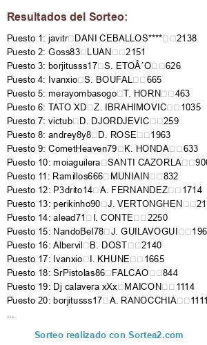 Lista de participantes: Balles K. TRAPP 1, TATO XD R. FAHRMANN 2, Albervil T. ZENGIN 3, Albervil DOUGLAS P. 4, ChaoticHornet67 SAMUEL 5, CarlosBD9 L. PODOLSKI 7, adrylito S. UMTITI 8, danygp89 Y. BRAHIMI 9, DaniBke E. DIER 10, x chachiquesi x G. BIA 11, Saavexbox MARTINS INDI 12, ChaoticHornet67 RUBEN VEZO 13, alexfcbarcelona J. WILLEMS 14, KaOs I AsTuR ROMULO 15, TATO XD WILLIAM CARVALHO 16, StormFury A. BECK 17, Dj calavera xXx ROBERTO FIRMINO 20, andrey8y8 NOLITO 22, misterserpico R. ADLER 25, P3drito14 G. CASTRO 26, javitr O. TOPRAK 27, xSAMU S. REINARTZ 28, benniscuba M. KADLEC 29, echateunfifa L. BENDER 30, iRandy v8 H. MASTOUR 31, perikinho90 A. SCHURRLE 33, sergiotabascos89 S. KIEBLING 35, NandoBel78 G.TORE**** 37, pinolines A. POTUK 38, KaOs I AsTuR M. NEUER 41, alexfcbarcelona RAFINHA 42, echateunfifa J. BOATENG 43, PYRA el capo H. BADSTUBER 44, SrPistolas86 P. LAHM 45, ferminnn M. SIMON 46, DaniBke B. SCHWEINSTEIGER 47, victub A. ROBBEN**** 48, Maybecohen T. MULLER 49, alexhdz F. RIBERY 50, gabripf M. GOMEZ 51, buijin C. MBEMBA 52, SpiffiestJose Y. BOLASIE 55, Havel7 D. ALABA 57, alexfcbarcelona R. WEIDENFELLER 59, andrey8y8 N. SUBOTIC 61, ChaoticHornet67 M. HUMMELS 62, MrMohamRam M. SCHMELZER 63, Saavexbox S. BENDER 64, buijin M. RYAN 65, P3drito14 M. GOTZE 66, SrPistolas86 S. KAGAWA 67, Shaman1987 K. GROBKREUTZ 68, P3drito14 ALEX TELLES 69, Saavexbox I. PERISIC 72, P3drito14 J. BLASZCZYKOWSKI 73, Havel7 R. LEWANDOWSKI 74, alex1493 JONATHAS 76, benniscuba N. SANSONE 77, CarlosBD9 DANTE 78, iRandy v8 R. KISHNA 80, AndrewTorres R. PEREYRA 81, MrMohamRam D. AOGO 84, alex1493 K. BELLARABI 90, Red Dutti Y. TIELEMANS 91, trunks V. ENYEAMA 94, KaOs I AsTuR C. KRAMER 95, victub ALEIX VIDAL 96, SpiffiestJose A. NYOM 98, TheForceMaker E. DURM 100, x chachiquesi x LUIZ ADRIAN0 101, pinolines K. KOULIBALY 103, trunks M. BESIC 106, alemalaga94 B. HOWEDES 108, alexfcbarcelona L. HOLTBY 111, moiaguilera J. FARFAN 112, buijin J. MBAKOGU 113, trompexbox360 K. HUNTELAAR 114, tabascos89 JURADO 116, alemalaga94 CHOUPO-MOTING 117, gabripf J. McCARTHY 119, o0 Sergi 0o O. BAUMANN 121, sergiotabascos89 D. YEDLIN 128, toni1708 T. WERNER 130, benniscuba L. DIGNE 133, StormFury D. BENAGLIO 138, borjitusss17 T. KONGOLO 142, Adriantr127 JOSUE 143, alexfcbarcelona H. KANE 144, alex1493 M. MANDZUKIC 145, iGosling v9 D. CHERYSHEV 146, ferminnn SOKRATIS 155, Saavexbox NALDO 156, PABLINHO M. MARIN 159, SpiffiestJose M. ARNAUTOVIC 160, KaOs I AsTuR M. EKICI**** 162, adrylito GABRIEL 166, Havel7 M. SCHNEIDERLIN 167, tabascos89 X. SHAQIRI 170, o0 Sergi 0o S. KOLASINAC 171, Ergion46 DAVID NAVARRO 173, misterserpico W. KANNEMANN 175, toni1708 ADAMA 176, alead71 F. MUSLERA 178, moiaguilera L. PERRIN 180, alead71 FELIPE MELO 181, Adriantr127 JORGINHO 187, SrPistolas86 L. STINDL 188, Ergion46 E. INSUA 189, PABLINHO CEDRIC 190, alexfcbarcelona V. TOROSIDIS 193, o0 Sergi 0o K. PAPADOPOULOS 195, javitr RAFA 198, StormFury L. ORBAN 199, xSAMU SADIO MANE 200, trompexbox360 BETO 201, CometHeaven79 D. OPARE 203, pinolines V. VAN DIJK 205, buijin K. REKIK 206, El Patron I7I FABINHO 207, x iReViiVaL FoX J. OBLAK 208, Goss83 COKE 209, Ergion46 VIEIRINHA 210, tabascos89 G. VAN DER WIEL 212, perikinho90 J. VERTONGHEN 214, iGosling v9 JEFFERSON 215, toni1708 G. RULLI 216, Havel7 R. BERTRAND 217, HaLiToxGCFx J. MURILLO 218, KaOs I AsTuR D. TADIC 223, HaLiToxGCFx J. GIMENEZ 226, echateunfifa L. DE JONG 227, MrMohamRam L. BIGLIA 229, danygp89 G. WIJNALDUM 233, KaOs I AsTuR A. OZBILIZ 234, TATO XD J. LENS 236, perikinho90 D. SUBASIC 237, TheForceMaker B. EMBOLO 238, joselitorojas1 ANDRE ANDRE 239, toni1708 RUBEN PARDO 240, javitr J. P. BOETIUS**** 242, PABLINHO P. CECH 244, benniscuba B. IVANOVIC 246, alead71 J. TERRY 247, Balles A. COLE 248, toni1708 J. CANCELO 249, sergiotabascos89 RAUL MEIRELES 250, ChaoticHornet67 F. LAMPARD 251, MrMohamRam D. STURRIDGE 252, echateunfifa D. DROGBA 253, sergiotabascos89 MATA 254, misterserpico DAVID LUIZ 256, tabascos89 FERNANDO TORRES 258, victub D. DJORDJEVIC 259, alead71 J. MIKEL 260, AndrewTorres S. KALOU 261, benniscuba ALEX 262, andrey8y8 R. LUKAKU 264, joselitorojas1 T. HOWARD 266, alexfcbarcelona P. JAGIELKA 268, tabascos89 L. BAINES 270, perikinho90 VITOLO 271, Balles P. POGBA 279, alex1493 HERNANI 281, CarlosBD9 HUGO MALLO 282, pinolines R. INGS 288, El Patron I7I C. DEMPSEY 289, o0 Sergi 0o C. ERKIN 290, andrey8y8 J. AMAVI 292, joselitorojas1 M. DEMBELE 294, tabascos89 PEPE REINA 295, alexhdz D. AGGER 298, NandoBel78 H. MORENO 299, DaniBke J. HENDERSON 300, MrMohamRam S. GERRARD 301, Albervil LUCAS LEIVA 302, xSAMU L. SUAREZ 305, victub ADERLAN SANTOS 306, Balles M. SKRTEL 307, benniscuba K. GLIK 308, MrMohamRam A. CARROLL 310, benniscuba J. HART 314, CarlosBD9 M. RICHARDS 315, victub V. KOMPANY 316, alead71 J. LESCOTT 317, moiaguilera G. CLICHY 318, alead71 Y. TOURE 319, benniscuba DAVID SILVA 321, x chachiquesi x S. NASRI 322, alemalaga94 S. AGUERO 323, moiaguilera C. TEVEZ 324, x iReViiVaL FoX K. TOURE 325, ulimoreno N. DE JONG 326, perikinho90 J. MILNER 327, Dj calavera xXx E. DZEKO 329, DaniBke M. BALOTELLI 330, misterserpico A. KOLAROV 331, xSAMU P. ZABALETA 332, ChaoticHornet67 N. ONUOHA 333, Red Dutti Y. KONOPLYANKA 334, gabripf DE GEA 337, DaniBke C. SMALLING 338, alexhdz P. EVRA 341, danygp89 NANI 342, tabascos89 A. YOUNG 345, Ergion46 W. ROONEY 346, Shaman1987 J. HERNANDEZ 347, echateunfifa PAULO OLIVEIRA 348, echateunfifa Q. PROMES 353, NandoBel78 J. EVANS 354, benniscuba RAFAEL 355, perikinho90 A. VALENCIA 356, DaniBke T. KRUL 361, adrylito G. KRYCHOWIAK 362, ChaoticHornet67 ADRIEN SILVA 366, PYRA el capo Y. CABAYE 367, misterserpico V. DARIDA 369, Albervil D. SANTON 370, Balles DENIS SUAREZ 371, sergiotabascos89 J. DOS SANTOS**** 372, Balles H. BEN ARFA 375, trompexbox360 A. TAARABT 378, alemalaga94 FELIPE ANDERSON 379, moiaguilera R. HAMOUMA 380, tabascos89 R. SHAWCROSS 382, TATO XD L. OCAMPOS 385, victub J. SOSA 394, alexhdz H. HERRERA 400, andrey8y8 L. CATTERMOLE 401, S