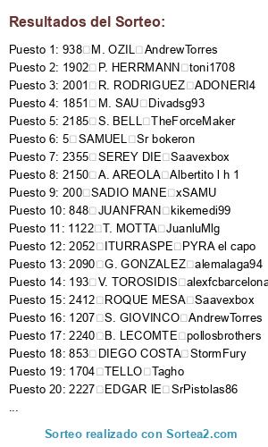 Lista de participantes: 1 K. TRAPP CometHeaven79, 2 R. FAHRMANN JG97, 3 T. ZENGIN**** TheForceMaker, 4 DOUGLAS P. ADONERI4, 5 SAMUEL Sr bokeron, 6 J. SOSA AndrewTorres, 7 L. PODOLSKI Tagho, 8 S. UMTITI javitr, 9 Y. BRAHIMI JuanluMlg, 10 E. DIER Lordjavier1991, 11 G. BIA x chachiquesi x, 12 MARTINS INDI borjitusss, 13 RUBEN VEZO Sr bokeron, 14 J. WILLEMS Ronald, 15 ROMULO KaOs I AsTuR, 16 WILLIAM CARVALHO buijin, 17 A. BECK StormFury, 18 MARLOS MORENO joxepoATH, 19 M. LEMOS P3drito14, 20 ROBERTO FIRMINO JoseAbadCCf, 22 NOLITO Die1234, 23 G. SIGUROSSON buijin, 25 R. ADLER Saavexbox, 26 G. CASTRO P3drito14, 27 O. TOPRAK misterserpico, 30 L. BENDER SrPistolas86, 31 H. MASTOUR MaDaScAs, 33 A. SCHURRLE perikinho90, 35 S. KIEBLING javitr, 37 G.TORE tabascos89, 38 A. POTUK kikemedi99, 41 M. NEUER KaOs I AsTuR, 42 RAFINHA FonFenoso, 43 J. BOATENG merayombasogo, 44 H. BADSTUBER Albervil, 45 P. LAHM tabascos89, 46 M. SIMON Adriantr127, 47 B. SCHWEINSTEIGER Lordjavier1991, 48 A. ROBBEN merayombasogo, 49 T. MULLER Maybecohen, 50 F. RIBERY pollosbrothers, 51 M. GOMEZ FonFenoso, 52 C. MBEMBA buijin, 55 Y. BOLASIE Simimc, 57 D. ALABA Albertito l h 1, 59 R. WEIDENFELLER sergiotabascos89, 61 N. SUBOTIC PYRA el capo, 62 M. HUMMELS Sr bokeron, 63 M. SCHMELZER MrMohamRam, 64 S. BENDER MaDaScAs, 65 M. RYAN ADONERI4, 66 M. GOTZE MaDaScAs, 67 S. KAGAWA SrPistolas86, 68 K. GROBKREUTZ II ANTI CULE II, 69 ALEX TELLES P3drito14, 72 I. PERISIC Simimc, 73 J. BLASZCZYKOWSKI joxepoATH, 74 R. LEWANDOWSKI Albertito l h 1, 75 A. PEÑARANDA Saavexbox, 76 JONATHAS Sergio0004, 77 N. SANSONE JG97, 78 DANTE Tagho, 79 M. REUS misterserpico, 80 R. KISHNA Ozora10Tsubasa, 81 R. PEREYRA danygp89, 84 D. AOGO MrMohamRam, 85 R. SEMEDO Divadsg93, 90 K. BELLARABI Sergio0004, 91 Y. TIELEMANS**** Ozora10Tsubasa, 92 EMRE MOR CharlyFifax, 93 Y. NESYRI rosino85, 94 V. ENYEAMA trunks, 95 C. KRAMER KaOs I AsTuR, 96 ALEIX VIDAL victub, 98 A. NYOM Simimc, 100 E. DURM TheForceMaker, 101 LUIZ ADRIAN0 P3drito14, 103 K. KOULIBALY benniscuba, 106 M. BESIC trunks, 108 B. HOWEDES Saavexbox, 111 L. HOLTBY Die1234, 113 J. MBAKOGU misterserpico, 114 K. HUNTELAAR Ramses17, 116 JURADO tabascos89, 117 CHOUPO-MOTING borjitusss, 119 J. McCARTHY CharlyFifax, 121 O. BAUMANN Maybecohen, 128 D. YEDLIN pollosbrothers, 130 T. WERNER Shaman1987, 133 L. DIGNE benniscuba, 138 D. BENAGLIO StormFury, 142 T. KONGOLO Red Dutti, 143 JOSUE Adriantr127, 144 H. KANE alexfcbarcelona, 145 M. MANDZUKIC dark69, 146 D. CHERYSHEV adrylito, 155 SOKRATIS Ronald, 156 NALDO Ramses17, 159 M. MARIN FonFenoso, 160 M. ARNAUTOVIC Simimc, 162 M. EKICI JuanluMlg, 166 GABRIEL alemalaga94, 167 M. SCHNEIDERLIN Albertito l h 1, 170 X. SHAQIRI tabascos89, 171 S. KOLASINAC Maybecohen, 173 DAVID NAVARRO pollosbrothers, 176 ADAMA toni1708, 178 F. MUSLERA AndrewTorres, 180 L. PERRIN Saavexbox, 181 FELIPE MELO alead71, 187 JORGINHO TheForceMaker, 188 L. STINDL SrPistolas86, 189 E. INSUA pollosbrothers, 190 CEDRIC Albertito l h 1, 193 V. TOROSIDIS alexfcbarcelona, 195 K. PAPADOPOULOS SrPistolas86, 198 RAFA Red Dutti, 199 L. ORBAN StormFury, 200 SADIO MANE xSAMU, 201 BETO alemalaga94, 203 D. OPARE CometHeaven79, 205 V. VAN DIJK MaDaScAs, 206 K. REKIK buijin, 207 FABINHO x5xflaccox5x, 208 J. OBLAK kikemedi99, 209 COKE JG97, 210 VIEIRINHA pollosbrothers, 212 G. VAN DER WIEL Adriantr127, 214 J. VERTONGHEN perikinho90, 215 JEFFERSON danygp89, 216 G. RULLI toni1708, 217 R. BERTRAND Albertito l h 1, 218 J. MURILLO x5xflaccox5x, 223 D. TADIC Shaman1987, 226 J. GIMENEZ buijin, 227 L. DE JONG Albertito l h 1, 229 L. BIGLIA MrMohamRam, 233 G. WIJNALDUM danygp89, 234 A. OZBILIZ KaOs I AsTuR, 236 J. LENS rosino85, 237 D. SUBASIC perikinho90, 238 B. EMBOLO TheForceMaker, 239 ANDRE ANDRE joselitorojas1, 240 RUBEN PARDO toni1708, 242 J. P. BOETIUS Adriantr127, 244 P. CECH FonFenoso, 246 B. IVANOVIC xSAMU, 247 J. TERRY alead71, 248 A. COLE xSAMU, 249 J. CANCELO javitr, 251 F. LAMPARD dark69, 252 D. STURRIDGE MrMohamRam, 253 D. DROGBA FonFenoso, 254 MATA JoseAbadCCf, 256 DAVID LUIZ misterserpico, 258 FERNANDO TORRES joxepoATH, 259 D. DJORDJEVIC victub, 260 J. MIKEL joxepoATH, 261 S. KALOU AndrewTorres, 264 R. LUKAKU Die1234, 266 T. HOWARD joselitorojas1, 268 P. JAGIELKA alexfcbarcelona, 270 L. BAINES tabascos89, 271 VITOLO perikinho90, 279 P. POGBA Balles, 281 HERNANI kikemedi99, 282 HUGO MALLO Tagho, 288 D. INGS MaDaScAs, 289 C. DEMPSEY Adriantr127, 290 C. ERKIN borjitusss, 292 J. AMAVI Simimc, 294 M. DEMBELE AndrewTorres, 295 PEPE REINA Divadsg93, 299 H. MORENO Sergio0004, 300 J. HENDERSON Lordjavier1991, 301 S. GERRARD MrMohamRam, 302 LUCAS LEIVA Albervil, 305 L. SUAREZ xSAMU, 306 ADERLLAN SANTOS victub, 307 M. SKRTEL Ramses17, 308 K. GLIK benniscuba, 310 A. CARROLL MrMohamRam, 314 J. HART benniscuba, 315 M. RICHARDS ADONERI4, 316 V. KOMPANY victub, 317 J. LESCOTT alead71, 318 G. CLICHY Saavexbox, 319 Y. TOURE alead71, 321 DAVID SILVA JuanluMlg, 322 S. NASRI x chachiquesi x, 323 S. AGÜERO benniscuba, 324 C. TEVEZ Albertito l h 1, 325 K. TOURE kikemedi99, 326 N. DE JONG Ramses17, 327 J. MILNER sergiotabascos89, 329 E. DZEKO P3drito14, 330 M. BALOTELLI Lordjavier1991, 331 A. KOLAROV MaDaScAs, 332 P. ZABALETA Albervil, 333 N. ONUOHA Sr bokeron, 334 Y. KONOPLYANKA NandoBel78, 337 DE GEA alemalaga94, 338 C. SMALLING adrylito, 341 P. EVRA joxepoATH, 342 NANI danygp89, 345 A. YOUNG tabascos89, 346 W. ROONEY pollosbrothers, 347 J. HERNANDEZ sergiotabascos89, 348 PAULO OLIVEIRA adrylito, 353 Q. PROMES Albervil, 354 J. EVANS perikinho90, 355 RAFAEL benniscuba, 356 A. VALENCIA perikinho90, 359 FRED NandoBel78, 361 T. KRUL joselitorojas1, 362 G. KRYCHOWIAK adrylito, 366 ADRIEN SILVA Sr bokeron, 367 Y. CABAYE borjitusss, 369 V. DARIDA Die1234, 370 D. SANTON SrPistolas86, 371 DENIS SUAREZ HaLiToxGCFx, 372 J. DOS SANTOS perikinho90, 375 H. BEN ARFA Balles, 379 FELIPE ANDERSON StormFury, 380 R. HAMOUMA diego_gallego, 382 R. SHAWCROSS MaDaScAs, 385 L. OCAMPOS dark69, 400 H. HERRERA joxepoATH, 401 L. CATTERMOLE PYRA el capo, 403 S. SES