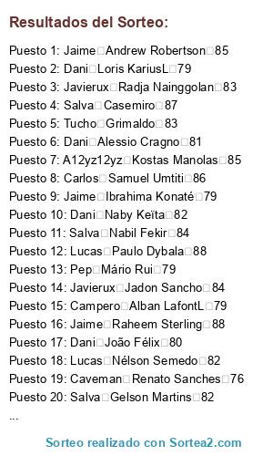 Lista de participantes: Dani Aaron Wan-Bissaka 79, Carlos Abdou Diallo 79, Campero Abdoulaye Doucouré 81, Jaime Achraf HakimiL 79, A12yz12yz Adama Traoré 76, Caveman Adrien Rabiot 83, Jaime Agustín Marchesín 78, Campero Alban LafontL 79, Dani Alejandro Gómez 85, Javierux Aleksandar Kolarov 82, Javierux Alessandro Florenzi 81, Dani Alessio Cragno 81, Campero Alex Oxlade-Chamberlain 80, Acid Alex Sandro 85, Alavarogf-9 Alex Teixeira 79, Campero Alex Telles 84, Caveman Alexander Isak 76, Tucho Alexandr Golovin 79, Javierux Alexandre Lacazette 86, Pep Allan 85, Javierux Allan Saint-Maximin 79, Caveman Alphonse Areola 82, Carlos Ander Herrera 82, Salva André Gomes 80, Jaime André Onana 82, Pep Andrea Belotti 82, Javierux Andrea Consigli 81, Caveman Andrej Kramarić 83, Jaime Andrew Robertson 85, Carlos Andrey Lunev 79, Lucas Ángel Correa 82, Lucas Ángel Di María 86, Alavarogf-9 Ante Rebić 80, Carlos Anthony Martial 83, Salva Antonio Rüdiger 82, Carlos Arthur 84, A12yz12yz Arturo Vidal 84, Caveman Axel Witsel 85, Carlos Azpilicueta 84, Alavarogf-9 Badou Ndiaye 76, Carlos Bernardo Silva 87, Javierux Bernat 80, Acid Bernd Leno 84, Campero Blaise Matuidi 85, Campero Bruma 78, Acid Bruno Fernandes 85, Salva Casemiro 87, Pep Cédric Bakambu 82, Salva Chris Smalling 80, Campero Christian Eriksen 88, Jaime Ciro Immobile 86, Caveman Clément Lenglet 85, A12yz12yz Coutinho 86, Pep Cristian Pavón 78, Tucho Damián Suárez 79, Tucho Daniele Rugani 82, Pep Danny da Costa 79, Javierux David Alaba 85, Dani David Neres 81, Salva Davinson Sánchez 83, Pep Denis Cheryshev 79, Carlos Denis Zakaria 78, Tucho Denzel Dumfries 78, A12yz12yz Deulofeu 80, A12yz12yz Diego Carlos 79, Tucho Divock Origi 78, Caveman Donny van de Beek 81, A12yz12yz Douglas Costa 84, Acid Éder Militão 81, Tucho Edinson Cavani 88, Carlos Eduardo Salvio 80, Lucas Egidio Maestre Schetino 82, Pep Enzo Martín Riquero 79, Acid Eric Bailly 80, Carlos Erling Braut Håland 76, A12yz12yz Esteban Andrada 79, Lucas Éver Banega 83, Tucho Fabinho 85, Lucas Fabricio Bustos 77, Lucas Federico Valverde 77, Dani Felipe 84, Alavarogf-9 Ferland Mendy 80, Caveman Filip Kostić 82, Javierux Francis Coquelin 80, Alavarogf-9 Frank Acheampong 77, Alavarogf-9 Frank Fabra 77, Carlos Frenkie de Jong 85, Caveman Gabriel Jesus 82, Pep Gabriel Paulista 82, Alavarogf-9 Gareth Bale 85, Carlos Gayà 80, Salva Gelson Martins 82, Javierux Geoffrey Kondogbia 81, Dani Georginio Wijnaldum 84, Alavarogf-9 Georgiy Dzhikiya 78, Lucas Gerónimo Rulli 81, Pep Gianluigi Donnarumma 85, Lucas Giovani Lo Celso 83, Tucho Grimaldo 83, Caveman Hakim Ziyech 85, Salva Héctor Bellerín 80, Campero Héctor Herrera 82, Javierux Heung Min Son 87, Acid Hirving Lozano 82, Dani Houssem Aouar 81, Jaime Ibrahima Konaté 79, Jaime Idrissa Gueye 83, Campero Iñaki Williams 82, Caveman Ivan Perišić 84, Javierux Jadon Sancho 84, Pep Jamie Vardy 82, Acid Jean-Philippe Gbamin 79, Javierux Jérôme Boateng 84, Salva Jérôme Roussillon 82, Salva Jesse Lingard 82, A12yz12yz Jesús Navas 82, Salva Jiří Pavlenka 84, Alavarogf-9 Joakim Mæhle 77, Campero João Cancelo 84, Dani João Félix 80, Lucas Joaquín Correa 80, Campero Joe Gomez 80, Dani Joel Matip 82, Tucho Jonathan Tah 83, Campero Jordan Lukaku 77, Lucas José María Giménez 85, Acid Josué Chiamulera 83, Javierux Juan Cuadrado 83, Jaime Julian Brandt 84, Dani Julian Draxler 83, Acid Junior Firpo 79, Alavarogf-9 Kai Havertz 84, Caveman Karim Bellarabi 82, Tucho Keita Baldé 80, Alavarogf-9 Kepa 84, Carlos Kevin Mbabu 77, Tucho Kevin Vogt 80, A12yz12yz Kieran Tierney 76, Caveman Kingsley Coman 84, A12yz12yz Kostas Manolas 85, A12yz12yz Kyle Walker 84, Dani Lautaro Martínez 81, Lucas Leandro Paredes 80, Salva Leon Bailey 82, Alavarogf-9 Leon Goretzka 84, Javierux Leonardo Pavoletti 78, Tucho Leroy Sané 86, Lucas Lisandro López 81, Lucas Lisandro Martínez 77, Dani Loris KariusL 79, Alavarogf-9 Lucas Hernández 84, Salva Lucas Moura 83, Campero Luis Muriel 80, A12yz12yz Lukáš Hrádecký 83, Alavarogf-9 Łukasz Fabiański 82, Javierux Marcano 79, Caveman Marco Asensio 83, Pep Marco Reus 88, Lucas Marcos Acuña 81, Salva Marcus Rashford 83, Jaime Mario Hermoso 80, Pep Mário Rui 79, Jaime Marquinhos 86, Acid Martin ØdegaardL 78, A12yz12yz Mateo Kovačić 82, Caveman Matthijs de Ligt 85, Salva Mattia Perin 82, Campero Mauro Icardi 85, Salva M'Baye Niang 77, Dani Memphis Depay 84, Pep Milan Škriniar 86, Pep Milot Rashica 79, Tucho Morales 81, Jaime Moussa Dembélé 79, Alavarogf-9 Moussa Marega 80, Acid Moussa Sissoko 81, Salva Nabil Fekir 84, Dani Naby Keïta 82, Dani Nacho Fernández 82, Lucas Nélson Semedo 82, Lucas Neto 85, Jaime Nico Schulz 82, Lucas Nicolás Otamendi 83, Campero Nicolas Pépé 83, Lucas Nicolás Tagliafico 82, Campero Niklas Süle 85, Dani Odriozola 80, Carlos Ousmane Dembélé 84, Jaime Oyarzabal 82, Tucho Pacheco 82, A12yz12yz Paul Pogba 88, Pep Paulinho 84, Lucas Paulo Dybala 88, Dani Pepe 84, Campero Péter Gulácsi 85, Acid Pierre-Emerick Aubameyang 88, Tucho Piotr Zieliński 81, Acid Pizzi 84, Carlos Presnel Kimpembe 82, Javierux Quincy Promes 82, Javierux Radja Nainggolan 83, Jaime Raheem Sterling 88, Alavarogf-9 Raphaël Varane 85, Salva Raphinha 79, Caveman Renato Sanches 76, Salva Renzo Saravia 78, Caveman Ricardo Pereira 82, Salva Richarlison 79, Alavarogf-9 Riyad Mahrez 84, Carlos Roberto Firmino 86, A12yz12yz Rodrigo 83, Caveman Roman Bürki 85, A12yz12yz Romelu Lukaku 85, A12yz12yz Ronaldo Esler 78, Campero Rúben Dias 80, Alavarogf-9 Sadio Mané 88, Carlos Samuel Umtiti 86, A12yz12yz Sander Berge 79, Tucho Saúl 85, Carlos Sebastian Giovinco 81, A12yz12yz Segundo Mandíquez 81, Campero Serge Gnabry 84, Dani Sergej Milinković-Savić 85, Jaime Sergi Roberto 82, Pep Sergio Asenjo 82, Pep Sokratis 84, Dani Stephan El Shaarawy 82, Jaime Steven Bergwijn 82, Javierux Taison 82, Jaime Tanguy Ndombele 81, Caveman Thilo Kehrer 79, Pep Thomas Delaney 82, Alavarogf-9 Thomas Meunier 82, Acid Thomas Par