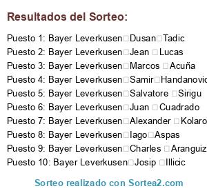 Lista de participantes: Bayer Leverkusen Gabriel Paulista, Bayer Leverkusen Josip Illicic, Bayer Leverkusen Alexander Kolarov, Bayer Leverkusen Dusan Tadic, Bayer Leverkusen Marcos Acuña, Bayer Leverkusen Lucas Leiva, Bayer Leverkusen Radja Nainggolan, Bayer Leverkusen Ever Banega, Bayer Leverkusen Charles Aranguiz, Bayer Leverkusen Juan Cuadrado, Bayer Leverkusen Samir Handanovic, Bayer Leverkusen Giuliano, Bayer Leverkusen Íker Muniain, Bayer Leverkusen Hector Herrera, Bayer Leverkusen Salvatore Sirigu, Bayer Leverkusen Iago Aspas, Bayer Leverkusen Ciro Immobile, Bayer Leverkusen Nicolas Gaitan, Bayer Leverkusen Jean Lucas, Bayer Leverkusen Domagoj Vida.