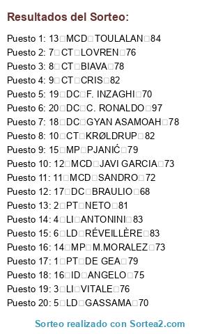 Lista de participantes: 1 PT DE GEA 79, 2 PT NETO 81, 3 LI VITALE 76, 4 LI ANTONINI 83, 5 LD GASSAMA 70, 6 LD RÉVEILLÈRE 83, 7 CT LOVREN 76, 8 CT BIAVA 78, 9 CT CRIS 82, 10 CT KRØLDRUP 82, 11 MCD SANDRO 72, 12 MCD JAVI GARCIA 73, 13 MCD TOULALAN 84, 14 MP M.MORALEZ 73, 15 MP PJANIĆ 79, 16 ID ANGELO 75, 17 DC BRAULIO 68, 18 DC GYAN ASAMOAH 78, 19 DC F. INZAGHI 70, 20 DC C. RONALDO 97.