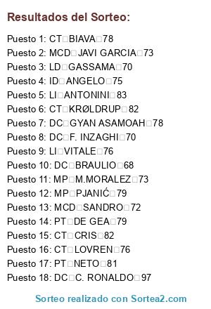 Lista de participantes: PT DE GEA 79, PT NETO 81, LI VITALE 76, LI ANTONINI 83, LD GASSAMA 70, CT LOVREN 76, CT BIAVA 78, CT CRIS 82, CT KRØLDRUP 82, MCD SANDRO 72, MCD JAVI GARCIA 73, MP M.MORALEZ 73, MP PJANIĆ 79, ID ANGELO 75, DC BRAULIO 68, DC GYAN ASAMOAH 78, DC F. INZAGHI 70, DC C. RONALDO 97.