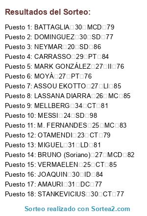 Lista de participantes: MESSI 24 SD 98, LASSANA DIARRA 26 MC 85, VERMAELEN 25 CT 85, NEYMAR 20 SD 86, ASSOU EKOTTO 27 LI 85, JOAQUIN 30 ID 84, CARRASSO 29 PT 84, M. FERNANDES 25 MC 83, BRUNO (Soriano) 27 MCD 82, MIGUEL 31 LD 81, MELLBERG 34 CT 81, MARK GONZÁLEZ 27 II 76, AMAURI 31 DC 77, STANKEVICIUS 30 CT 77, BATTAGLIA 30 MCD 79, MOYÀ 27 PT 76, DOMINGUEZ 30 SD 77, OTAMENDI 23 CT 79.