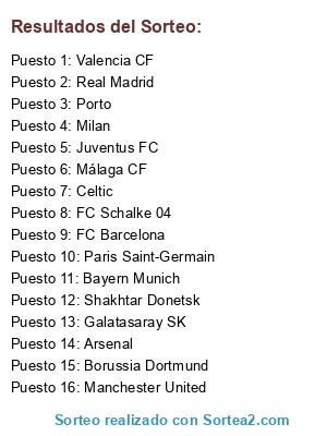 Lista de participantes: Paris Saint-Germain, FC Schalke 04, Málaga CF, Borussia Dortmund, Juventus FC, Bayern Munich, FC Barcelona, Manchester United, Porto, Arsenal, Milan, Real Madrid, Shakhtar Donetsk, Valencia CF, Celtic, Galatasaray SK.